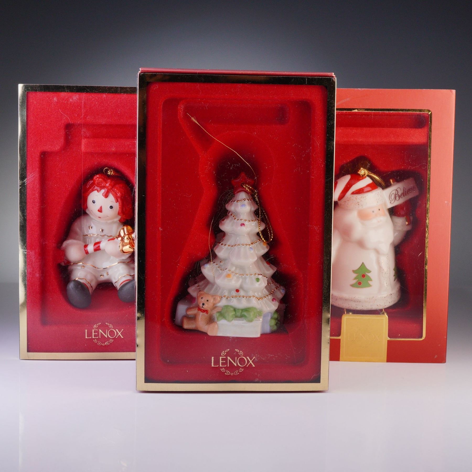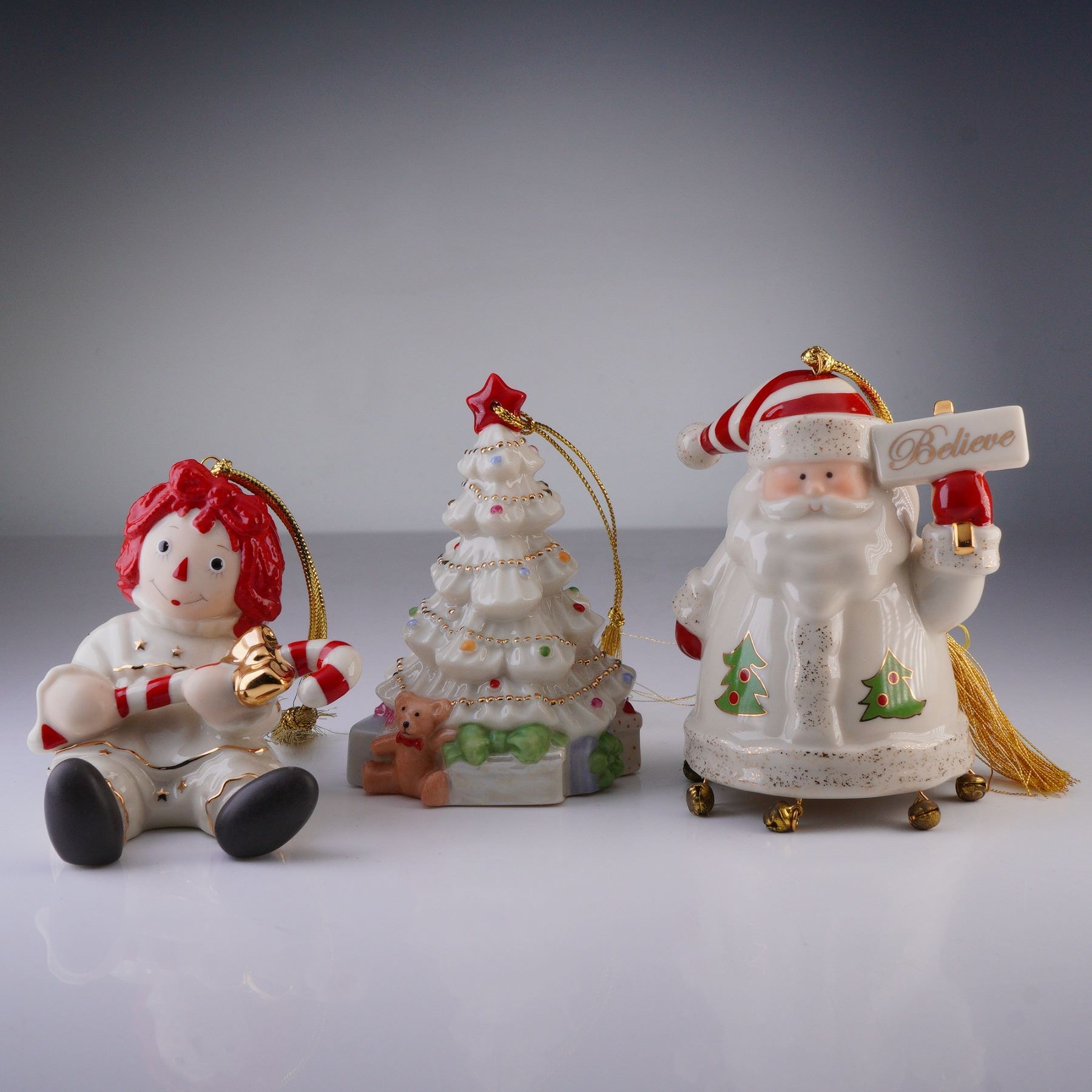 3pc Lenox Tree Ornaments, Christmas Tree, Raggedy Ann, & Believe Santa