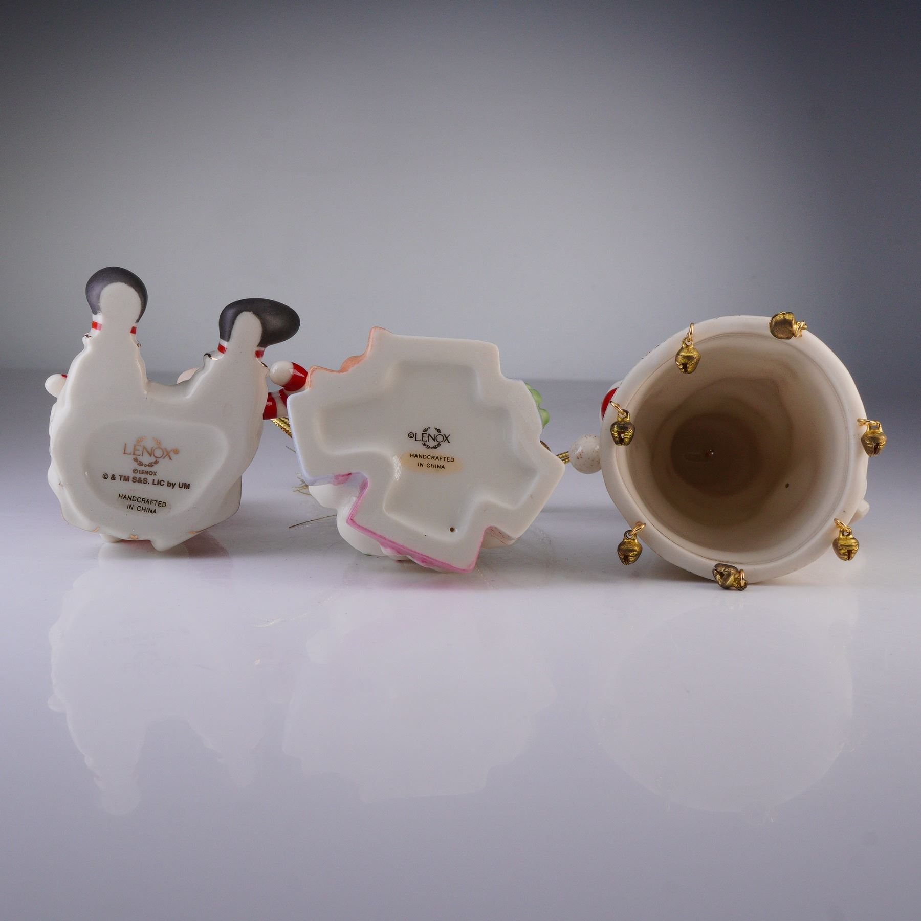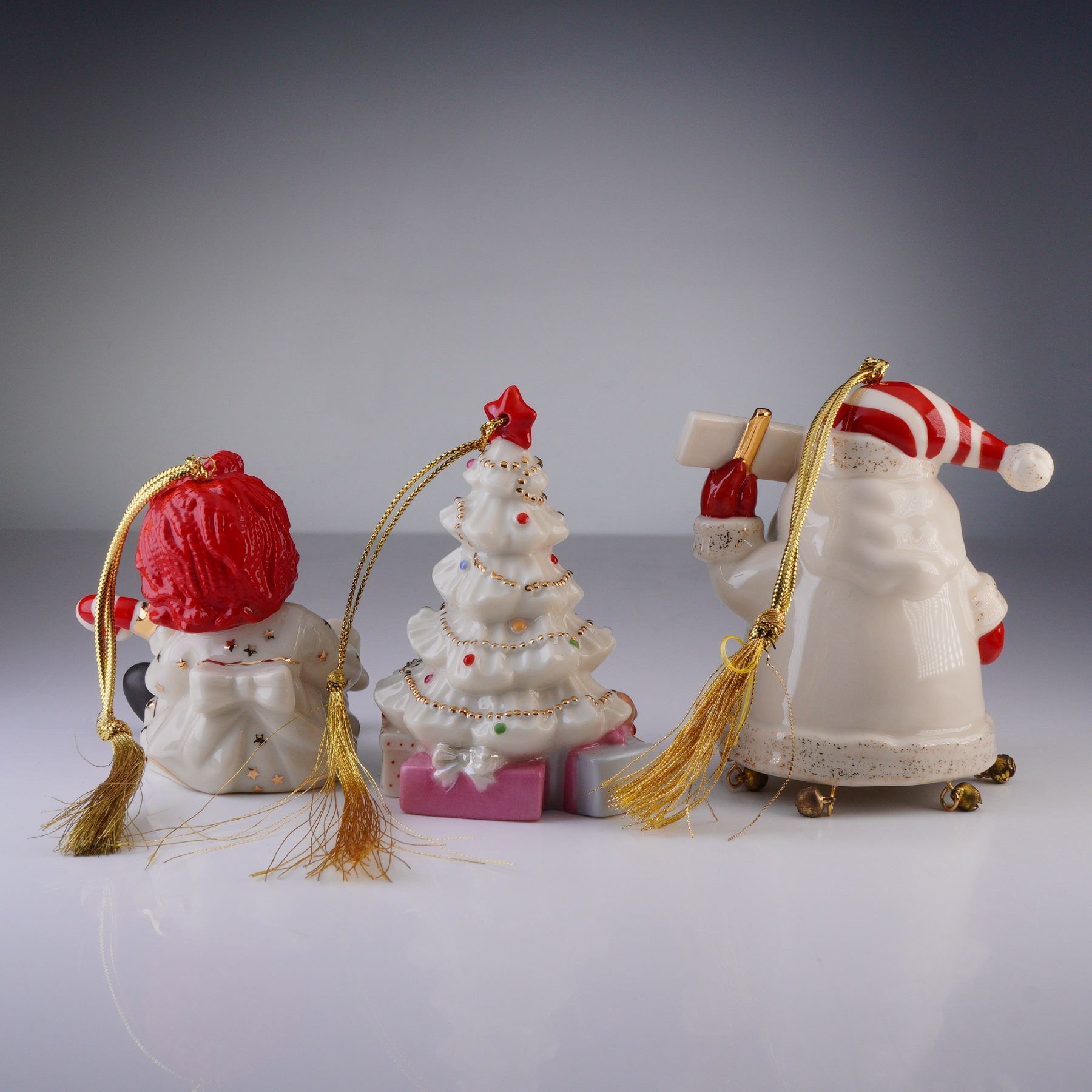 This Lenox ornament trio includes a Christmas tree, Raggedy Ann, and a Believe Santa. Each piece is crafted in fine porcelain with colorful hand painted details and finished with gold accents. The tree features delicate ornaments and presents at its base, Raggedy Ann holds a candy cane and bell, and Santa carries a Believe sign with a red and white striped hat. All include gold hanging cords with tassels for a festive display. Lenox backstamp.