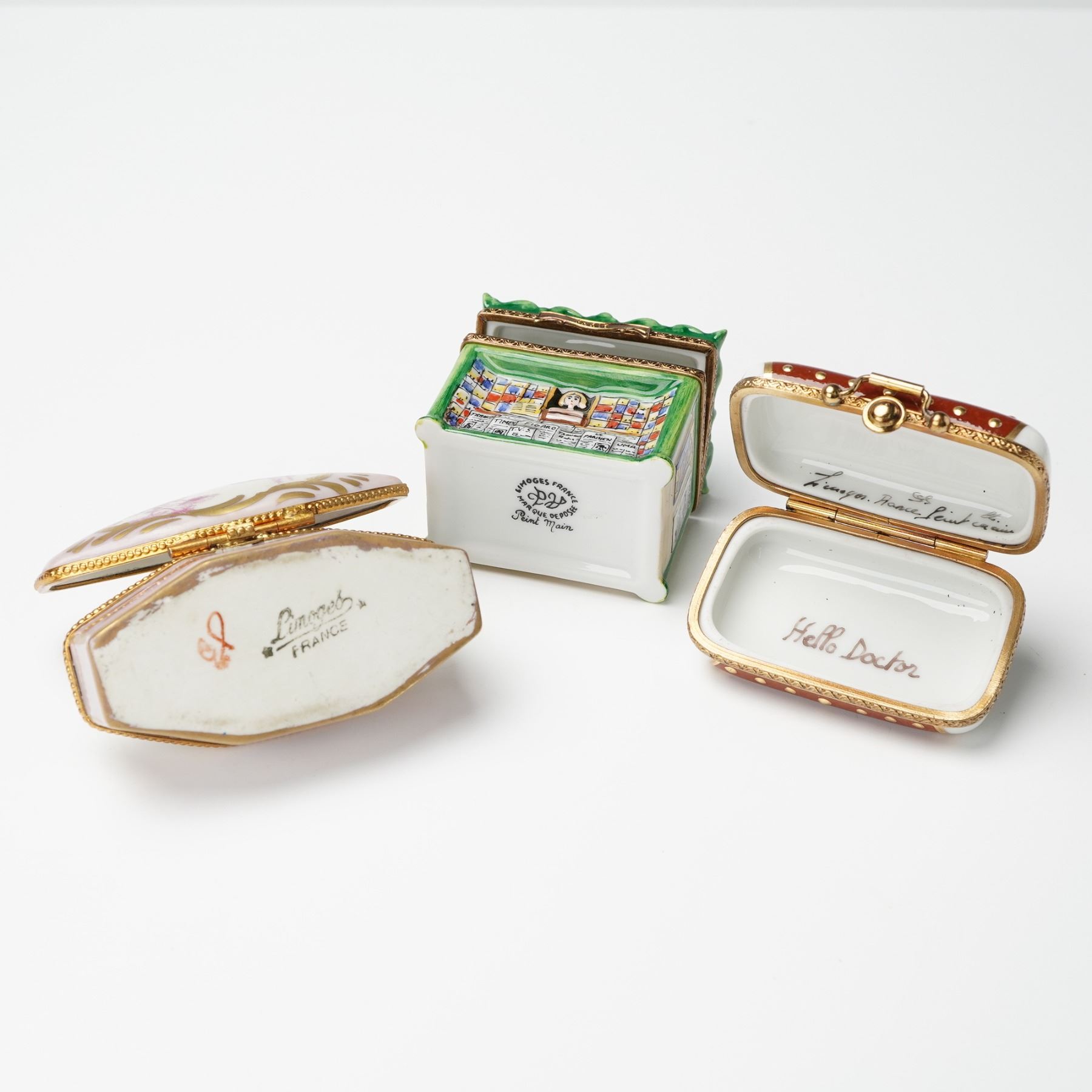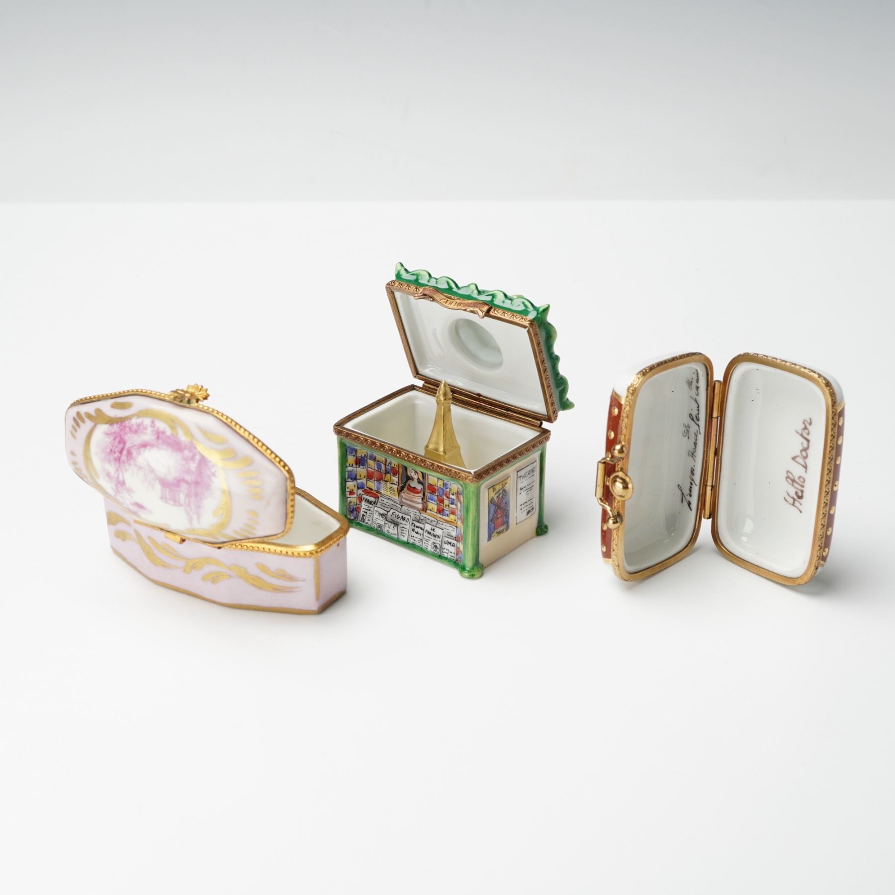 A group of three French Limoges porcelain trinket boxes, each finely hand-painted and fitted with gilt metal mounts. The assortment includes a pink and white oval box with floral decoration and gilt scrollwork, marked Limoges France; a green domed kiosk-shaped box detailed with a Parisian newsstand scene and miniature Eiffel Tower inside, marked Peint Main Limoges France; and a suitcase-form box with painted travel motifs and interior inscription reading Hello Doctor.