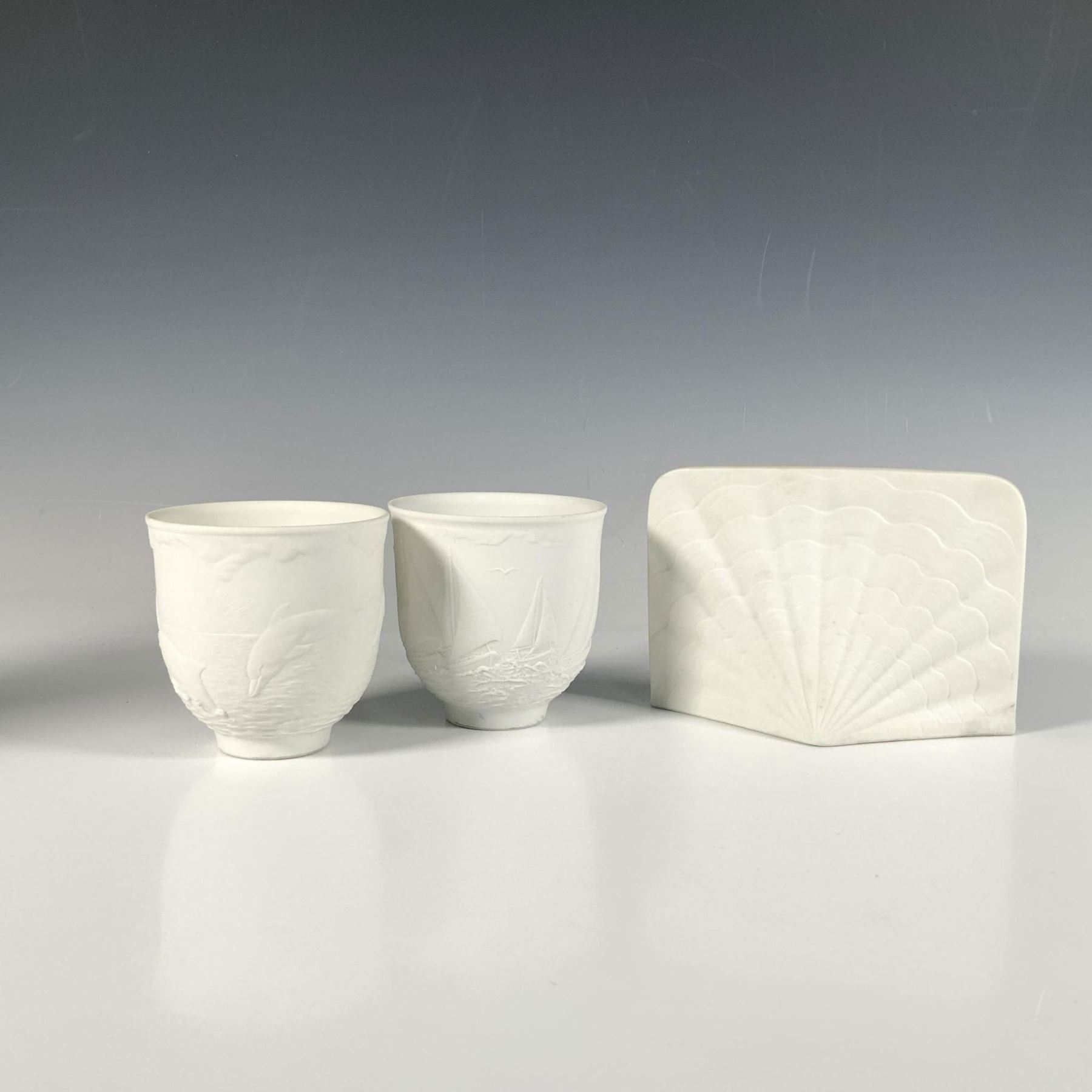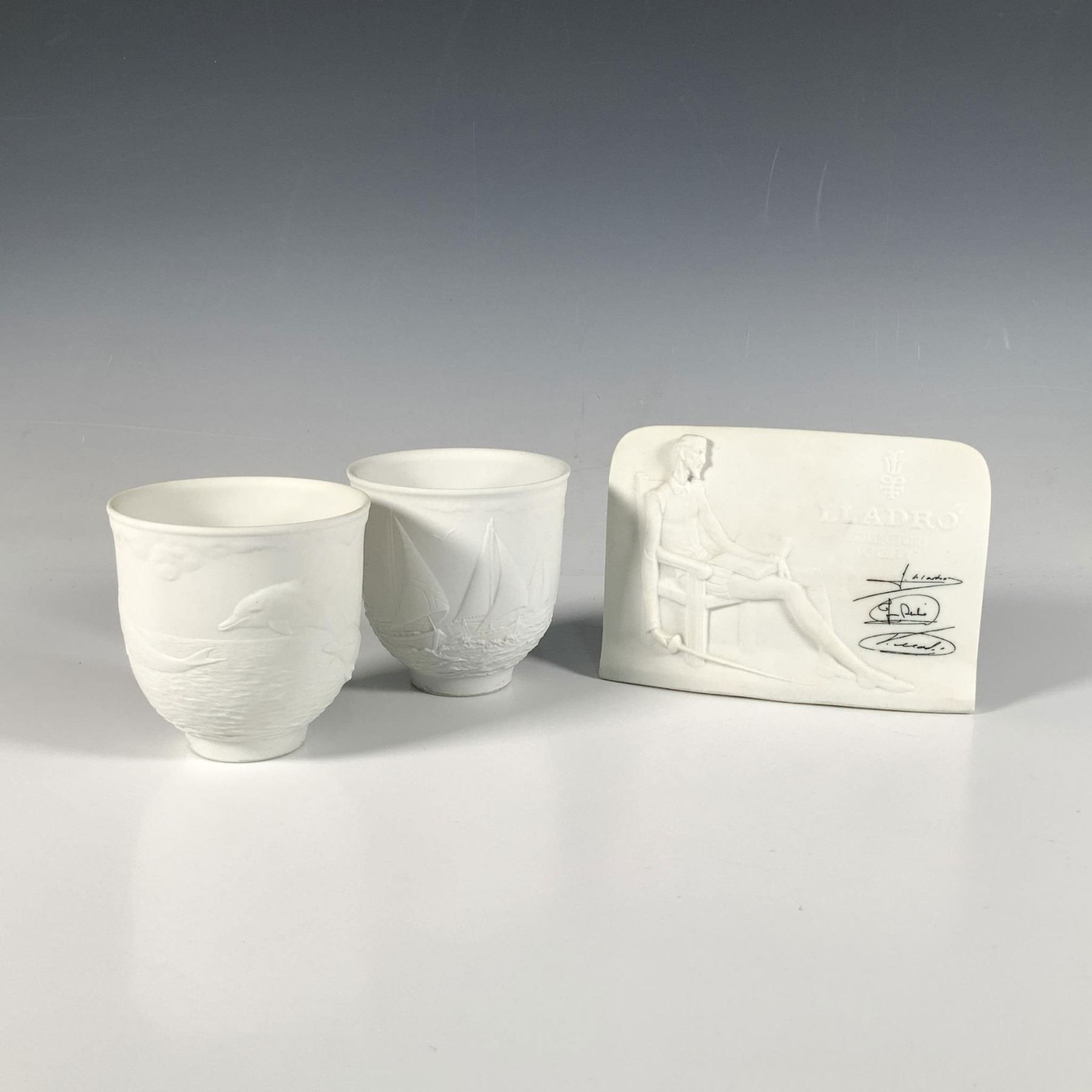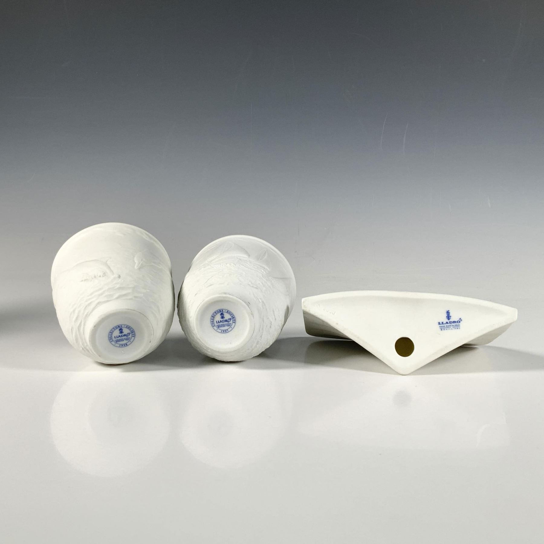 This lovely set includes Charter Member Plaque (1017601) Sailing The Seas candleholder (1017657), and Dolphins At Play candleholder (1017658). Lladro backstamps. Largest item: 5.75"L x 2.25"W x 4.25"H. Issued: 20th century