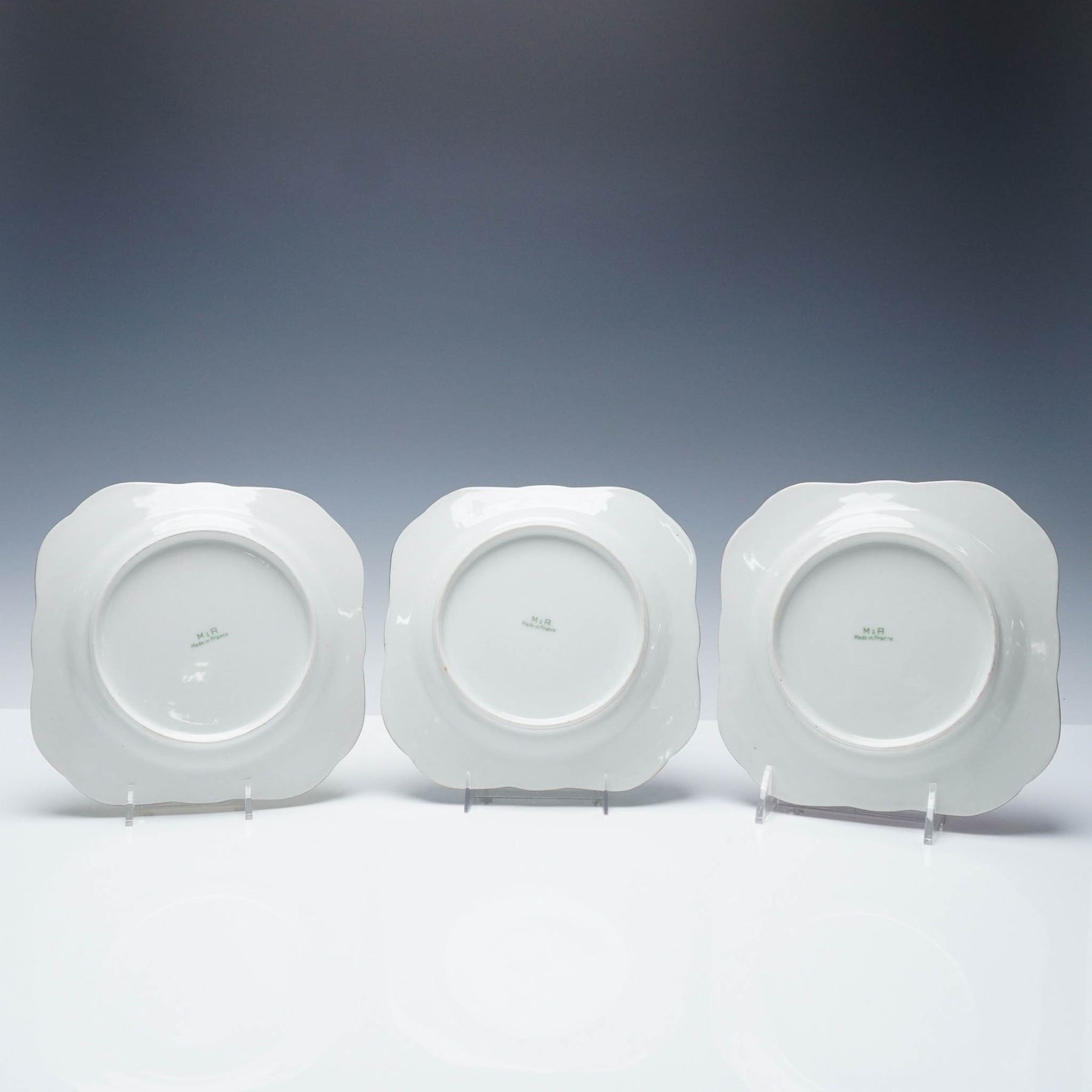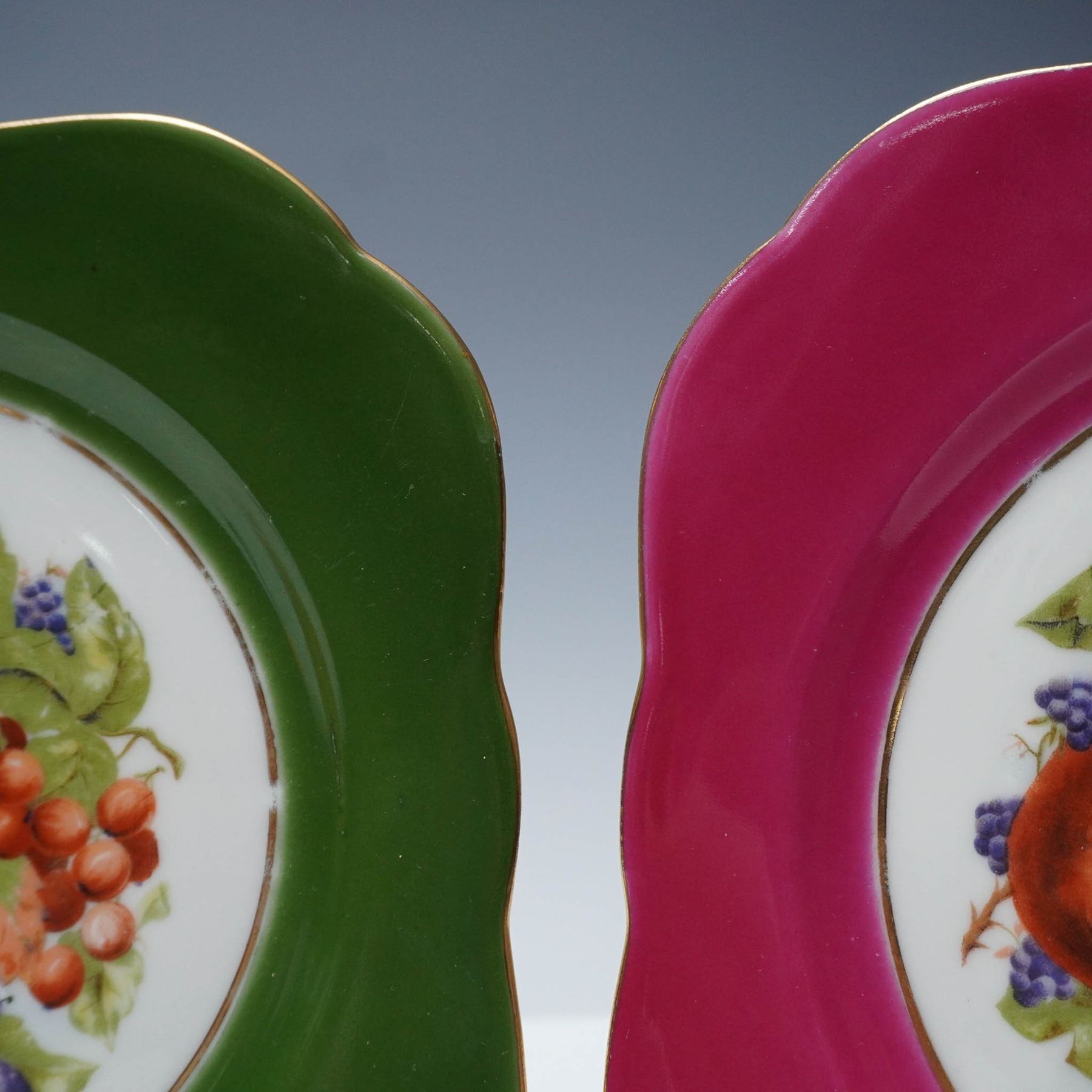 Set of three vintage M & R France porcelain plates, each featuring a vibrant hand-painted fruit motif at the center, framed by a bold scalloped rim in yellow, green, and pink. The beautifully detailed fruit compositions include pears, grapes, cherries, and berries, evoking a classic European aesthetic. Marked M & R Made in France on the underside, these plates showcase the fine craftsmanship of Bavarian porcelain.