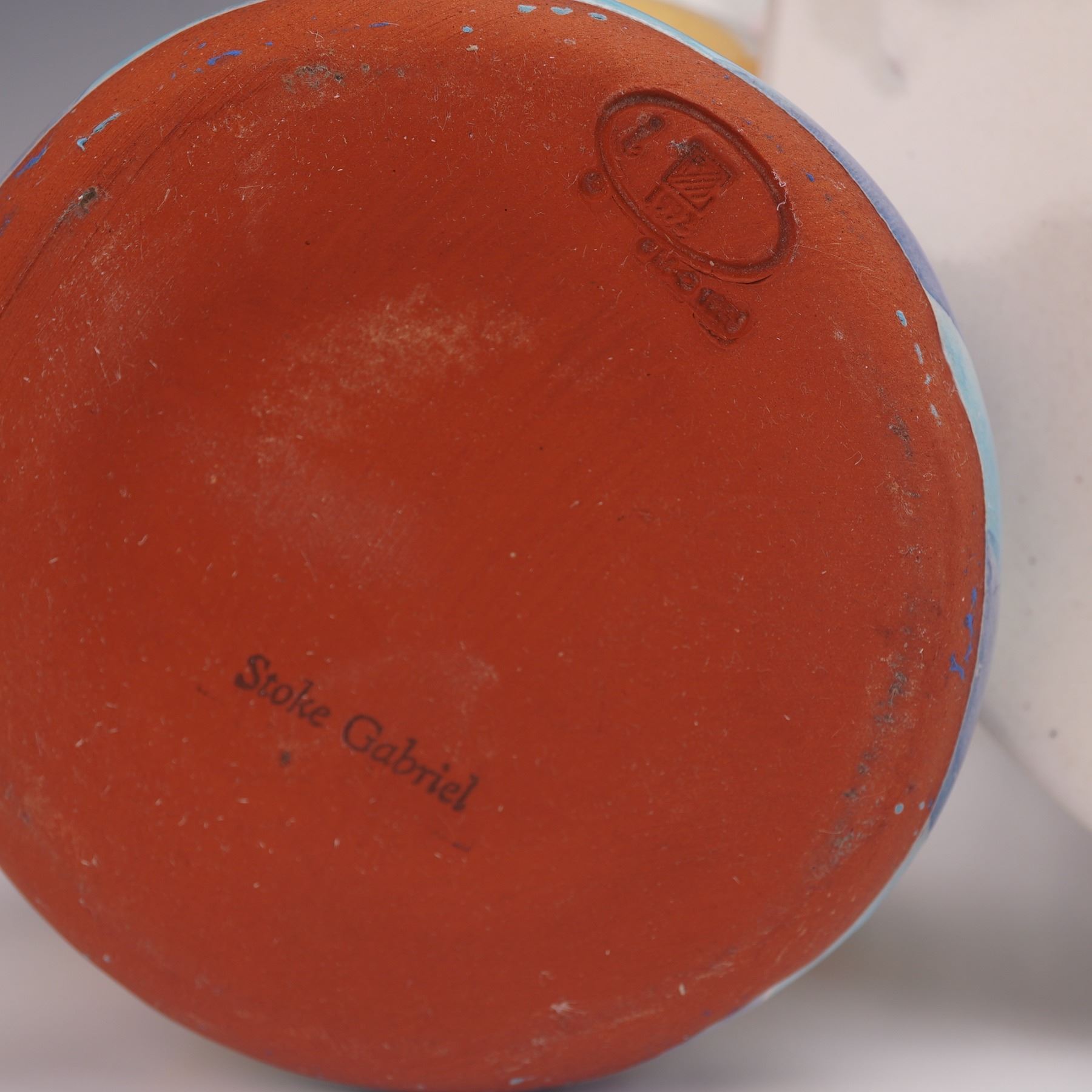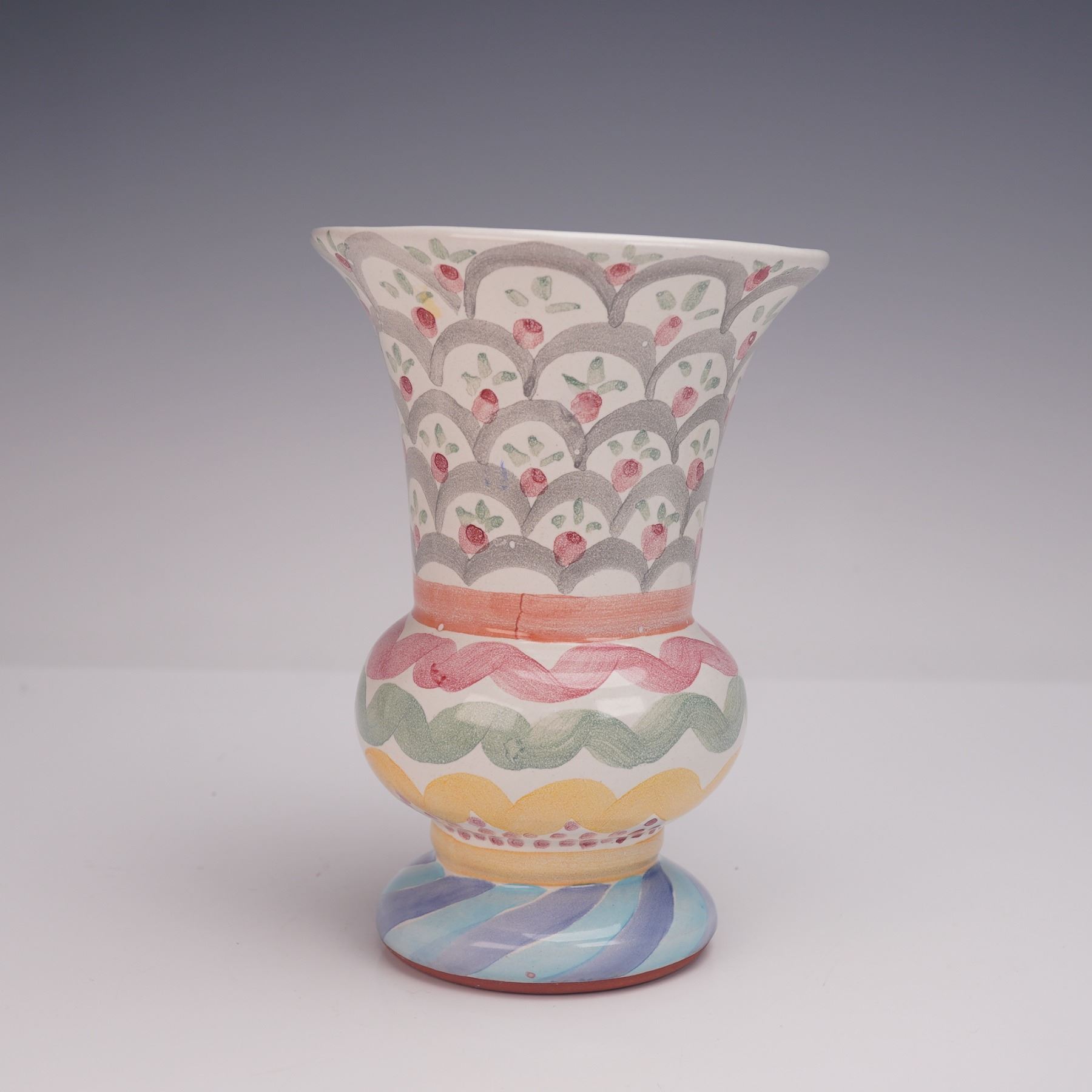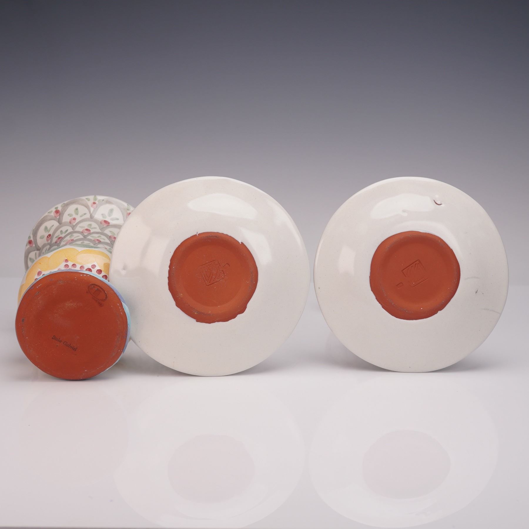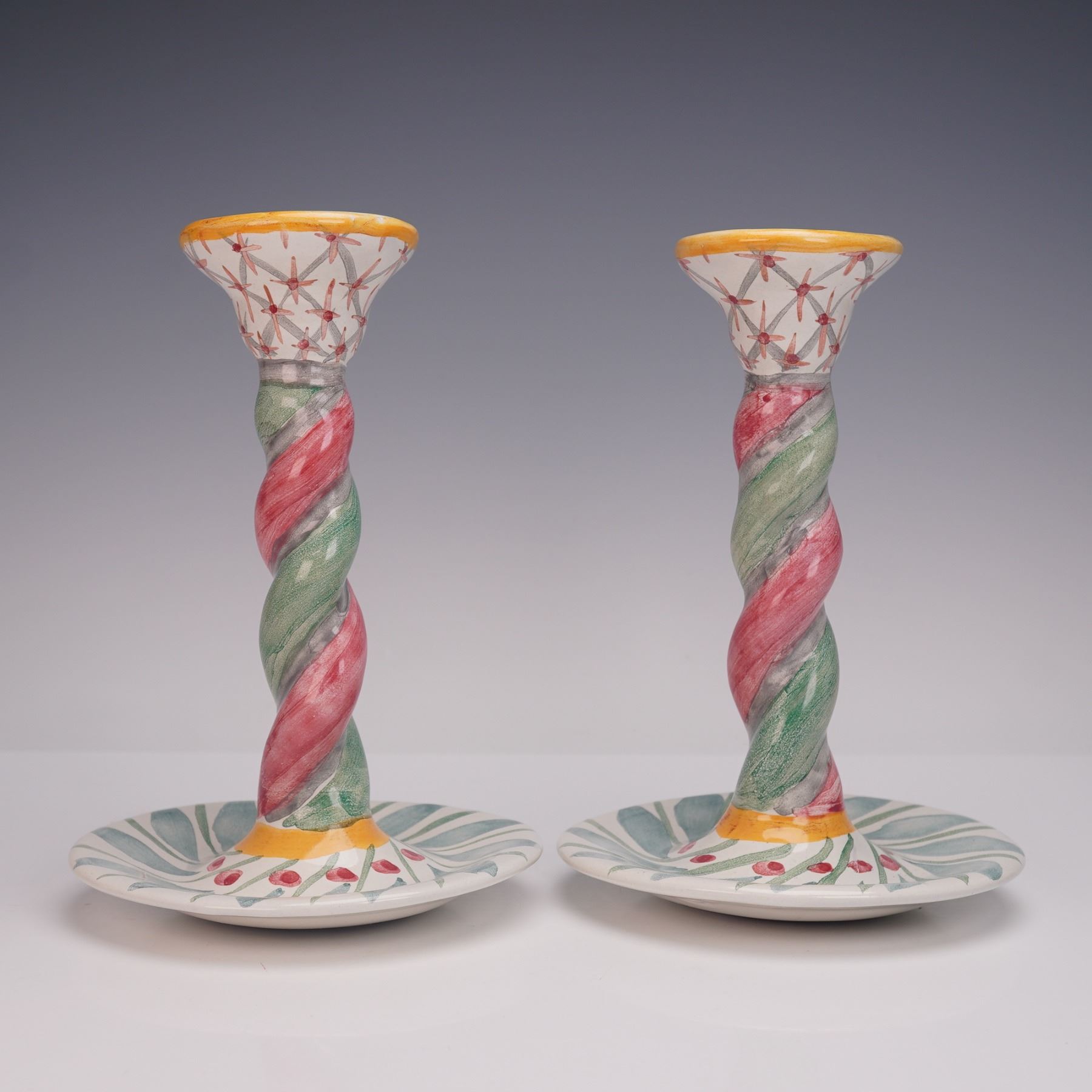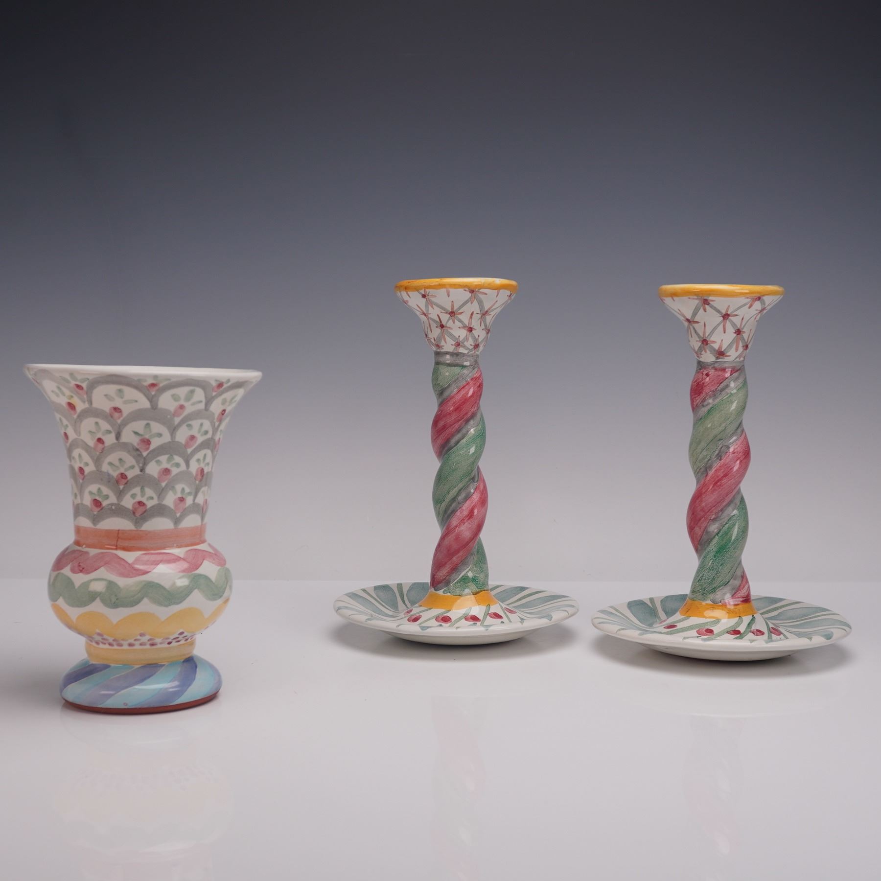 A three piece pottery ensemble including a flared vase and a pair of tall candlesticks, each decorated with the brand's distinctive painted patterns. The vase is adorned with scalloped and geometric motifs in pastel and jewel tones, while the candlesticks feature twisted shafts in alternating red and green bands rising from wide circular bases enriched with stylized ornament. MacKenzie-Childs impressed marking to underside.