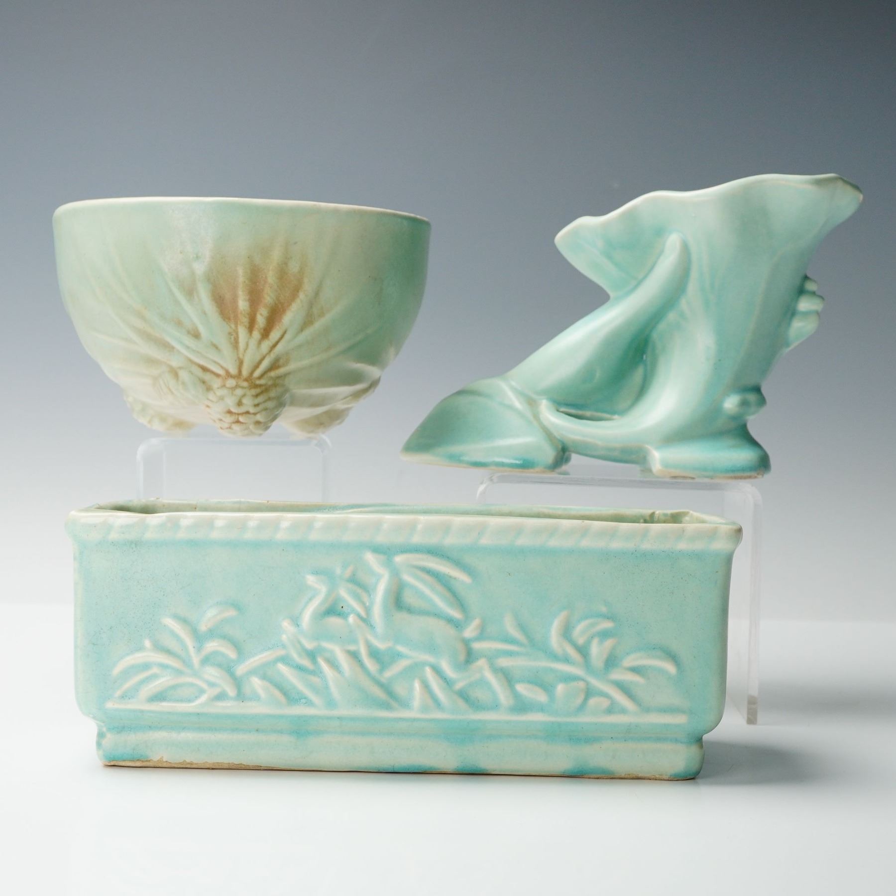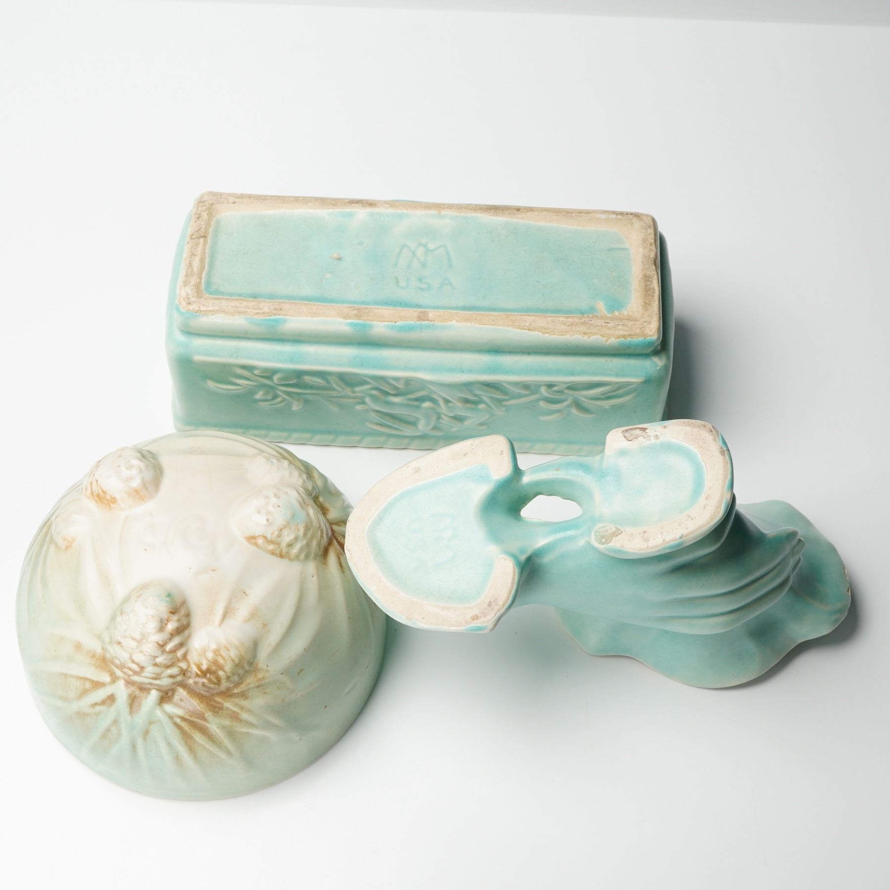 A charming group of three vintage McCoy pottery pieces, each finished in the company's signature aqua to turquoise glaze. This lot includes a rectangular planter featuring stylized gazelles running in foliage motif, marked McCoy USA to the base; a graceful vase modeled in the shape of a hand holding a flaring cornucopia; and a bowl with molded pinecone and needle decoration around the lower half, shaded in soft cream and light aqua tones. Each piece displays McCoy's distinctive midcentury style and American pottery craftsmanship.