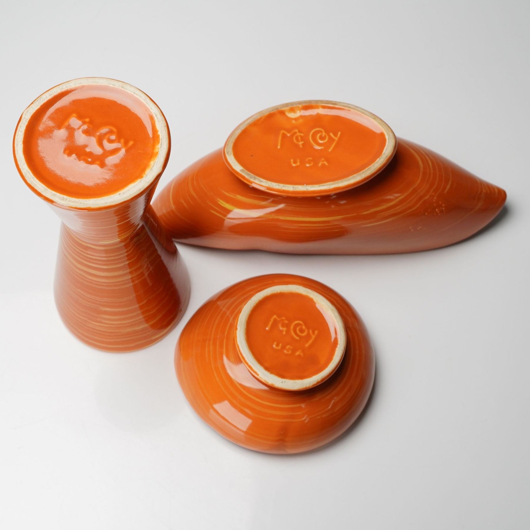 Featuring rich orange marbling with cream striations. This set includes a tall hourglass-shaped vase with a smooth flared rim, an elongated oval planter with a gentle upward sweep at each end, and a rounded pedestal bowl with a deep concave center. Each piece displays McCoy's signature glossy glaze and is marked "McCoy USA" on the base, reflecting the iconic mid-century craftsmanship of the company.