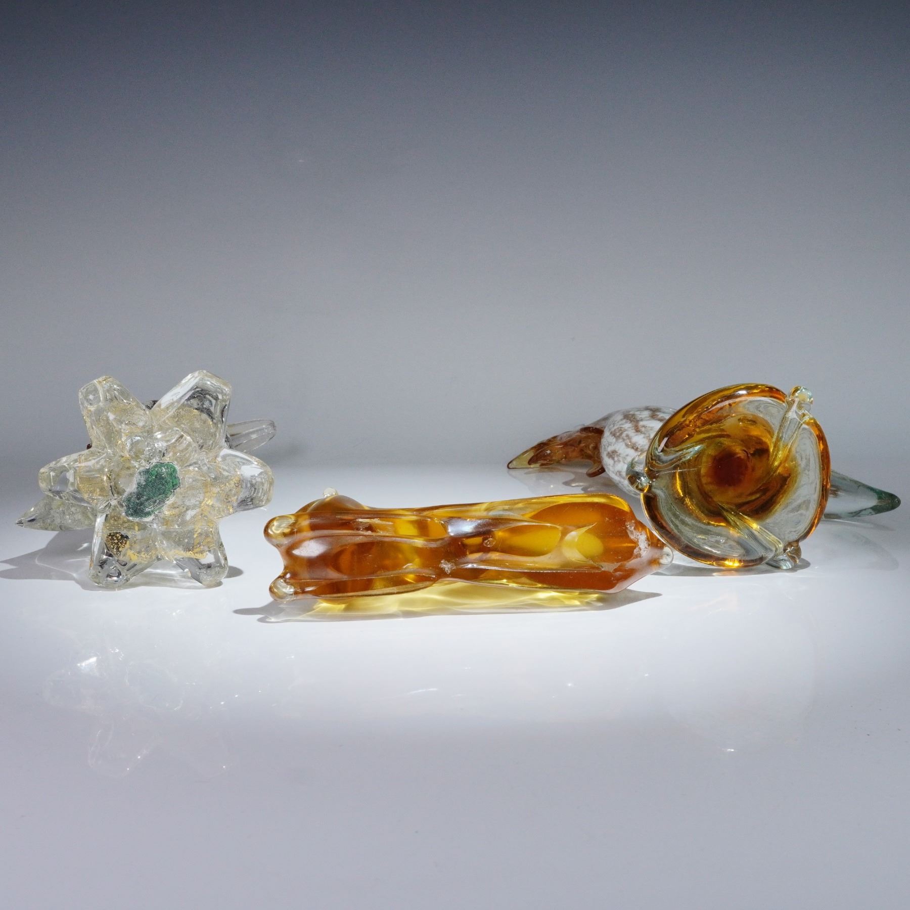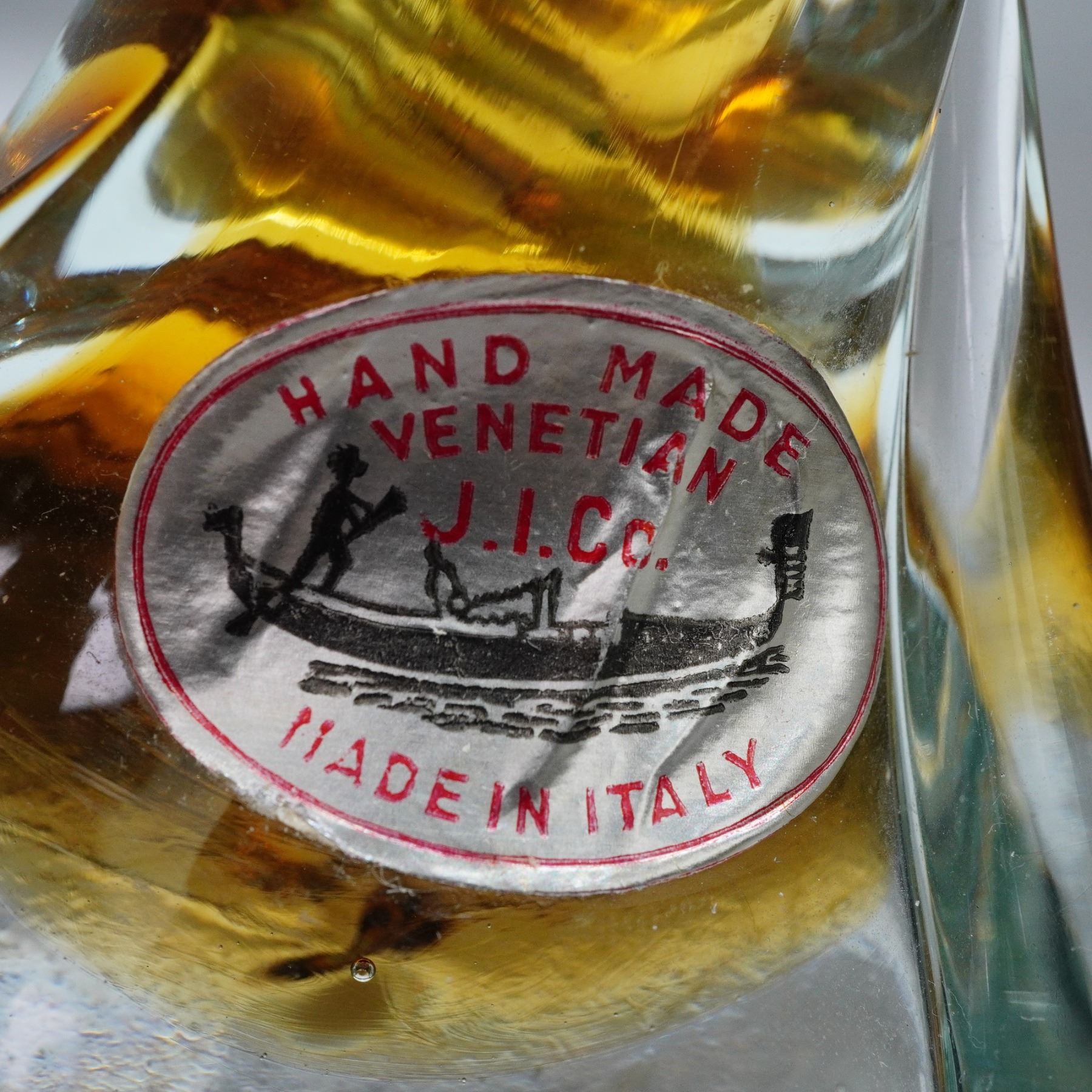 Group of three midcentury Italian art glass animal figures, including two labeled examples. The group features a rooster with scalloped comb and speckled white plumage on a gold-infused base; a swan-form figure in deep ruby with diamond-quilted clear body and applied beak, marked with a "Genuine Venetian Glass Handmade Murano Italy" label; and a stylized recumbent camel or llama rendered in clear amber glass, bearing a "Hand Made Venetian J.I. Co. Made in Italy" foil label. Each piece demonstrates the vibrant colors and expressive forms characteristic of Murano artistry.