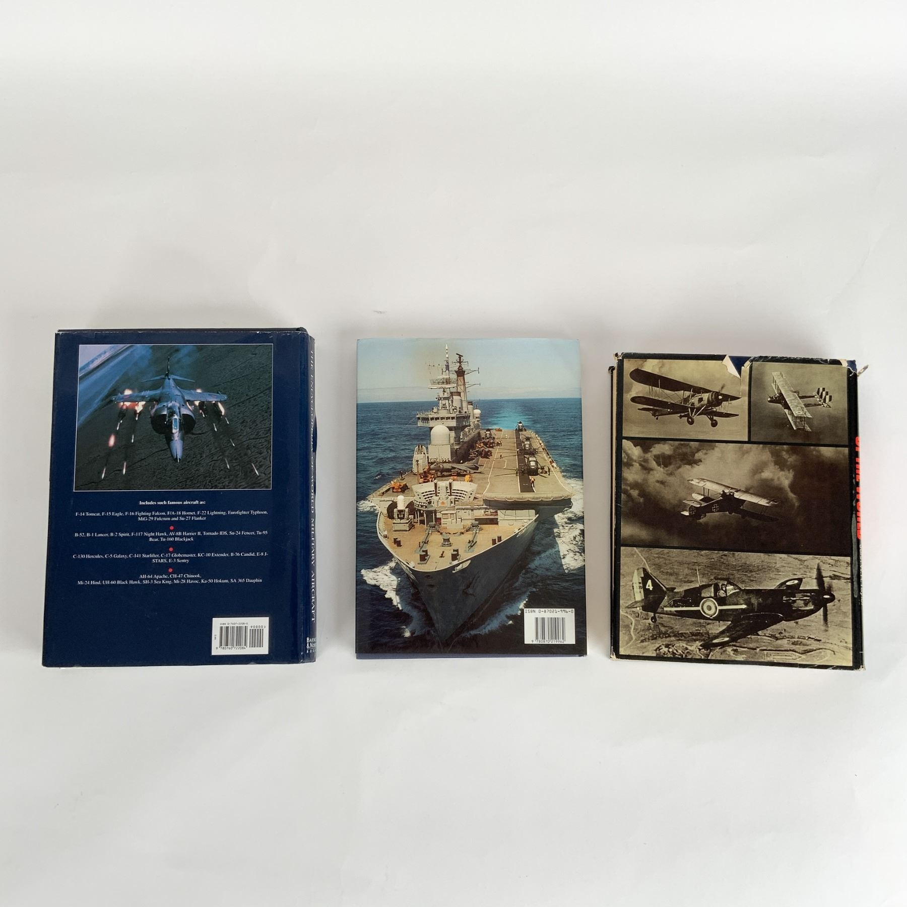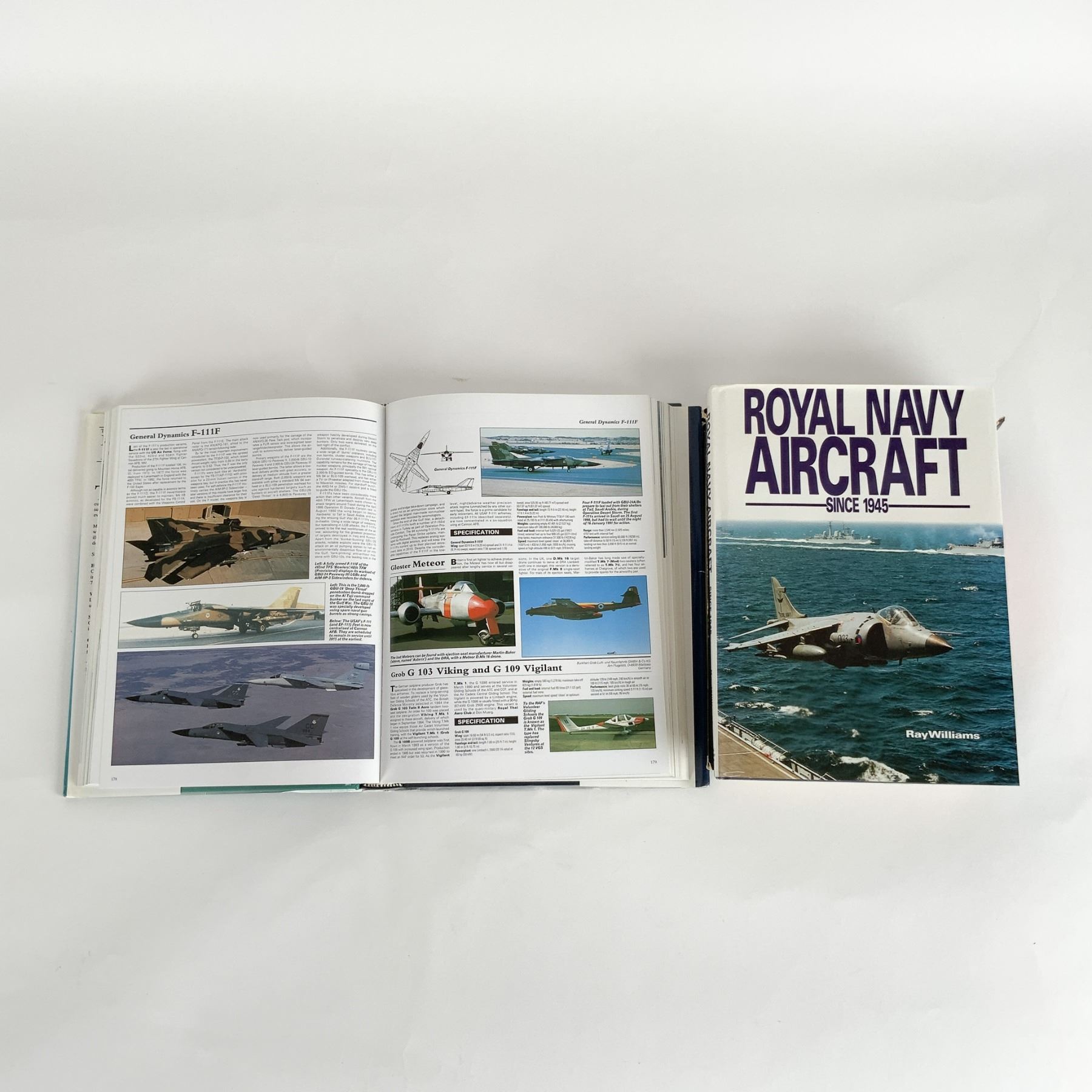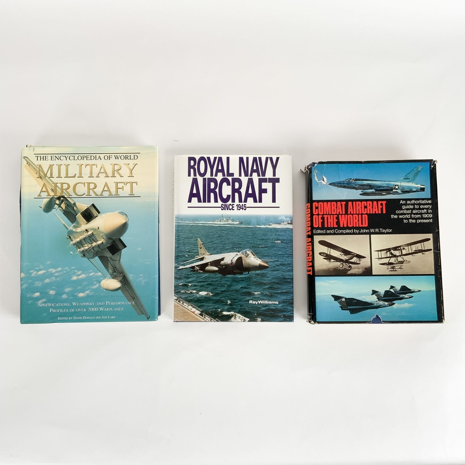 A collection of three books on military aircraft, providing extensive details on aviation history, specifications, and combat performance. Titles include "Royal Navy Aircraft Since 1945" by Ray Williams, "Combat Aircraft of the World" edited by John W.R. Taylor, and "The Encyclopedia of World Military Aircraft" edited by David Donald and Jon Lake. The books feature in-depth analysis, historical photographs, and technical data, making them essential for aviation enthusiasts and historians. The largest book measures 9.5"L x 1.75"W x 12.5"H.