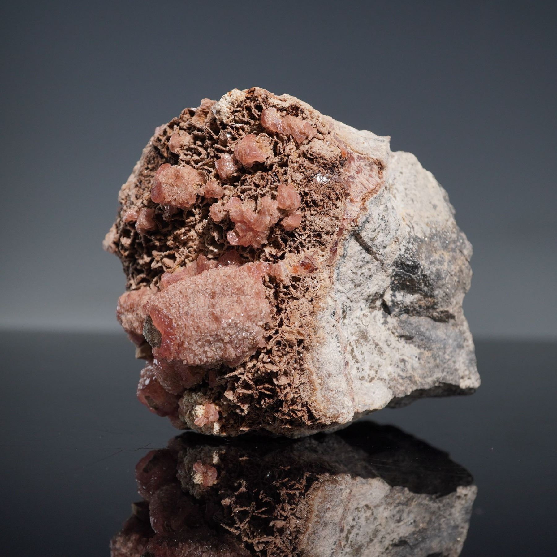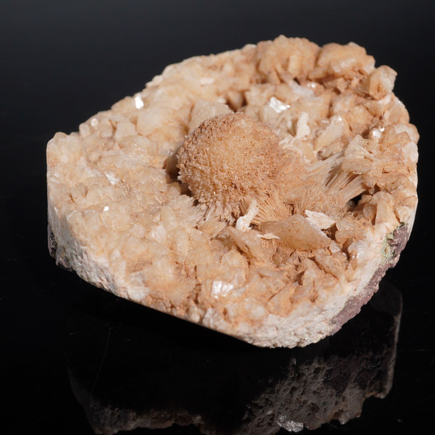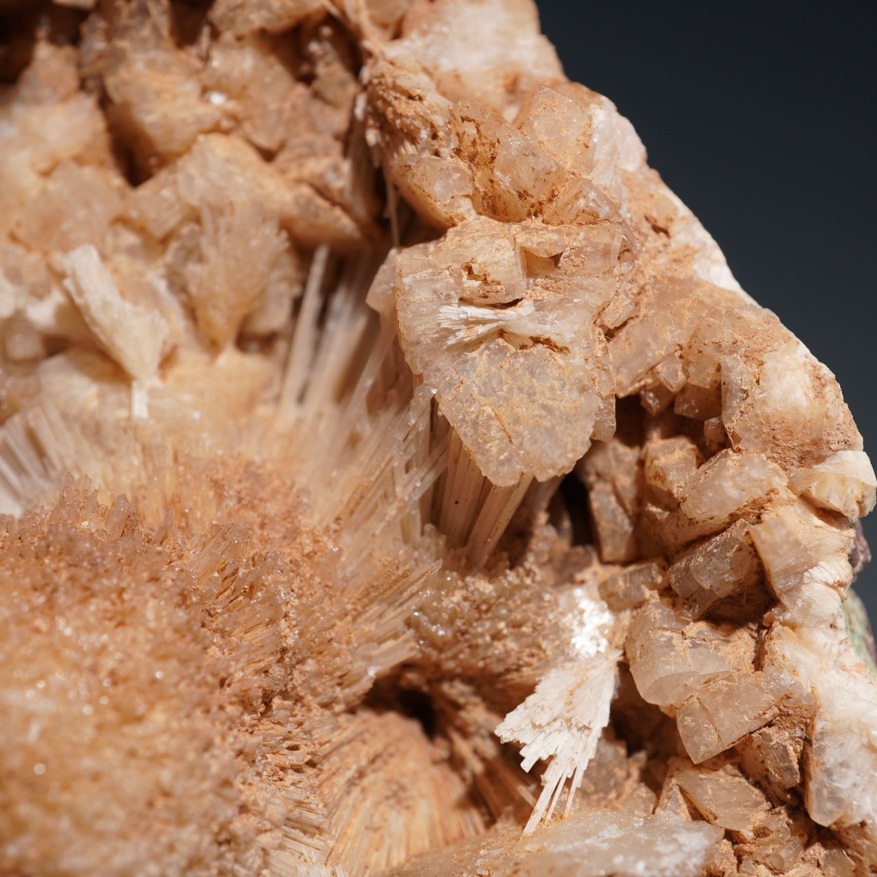 A captivating trio of natural mineral specimens featuring Thomsonite, Muscovite, and Rhodochrosite. The Thomsonite displays a radiant cluster of creamy, radial crystal formations resting within a matrix of pearlescent zeolite. The Muscovite piece glimmers with layered, reflective sheets of silvery-bronze mica accented by rich reddish tones. Completing the set, the Rhodochrosite exhibits a dynamic mix of rose-pink hues and botryoidal formations, nestled in contrasting dark matrix rock. Together, these specimens present an elegant harmony of texture, color, and natural artistry, ideal for collectors and connoisseurs of fine minerals.