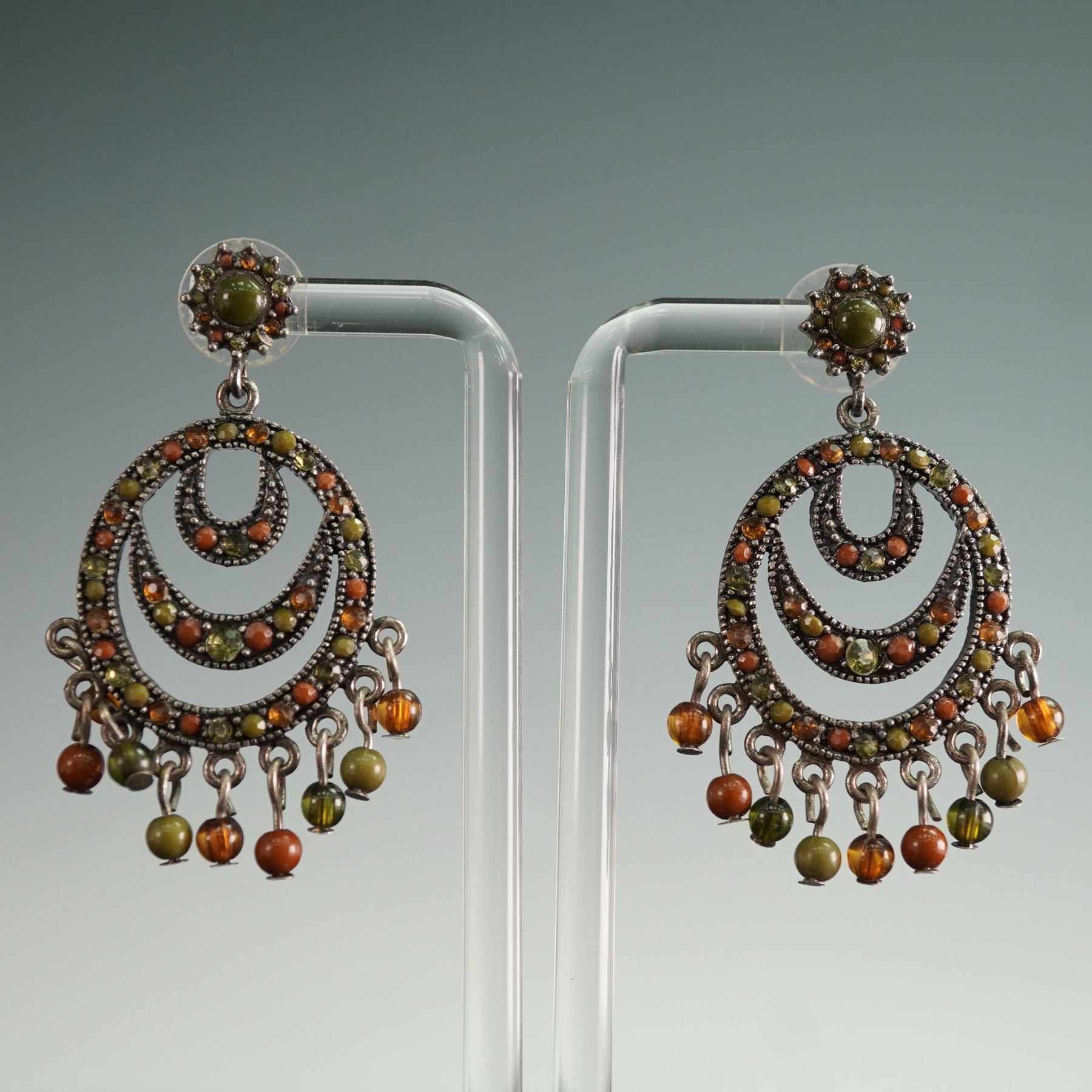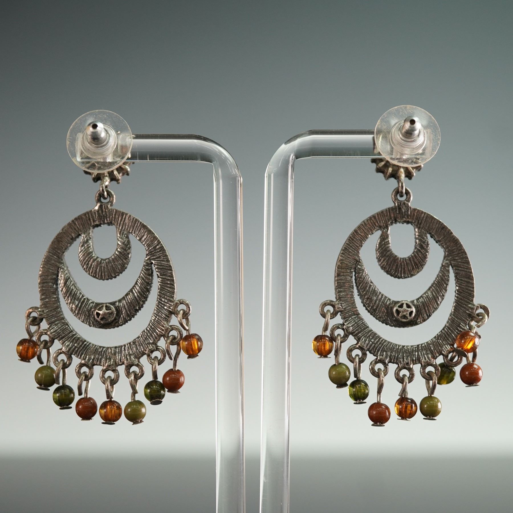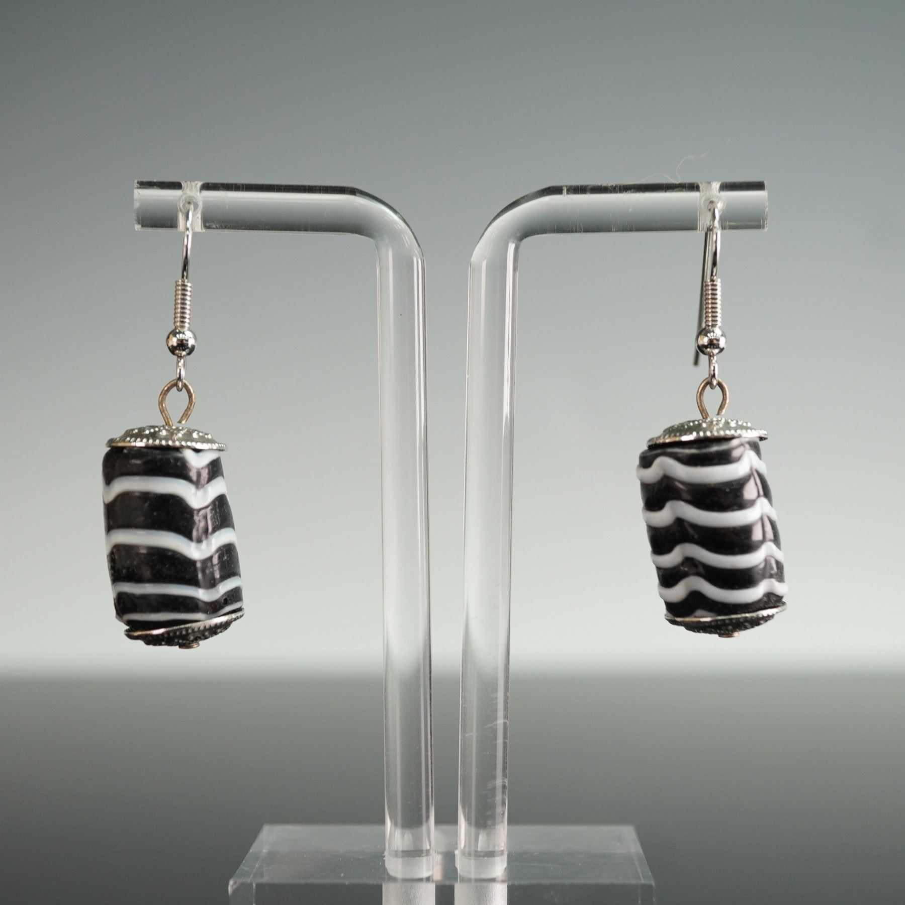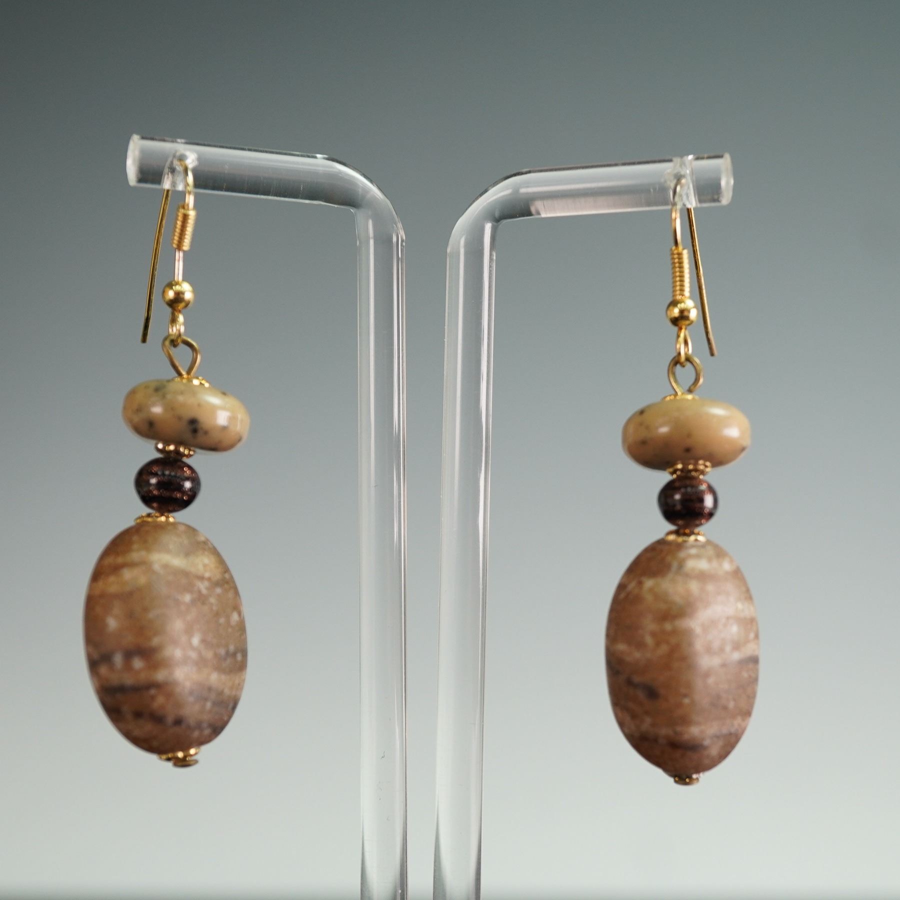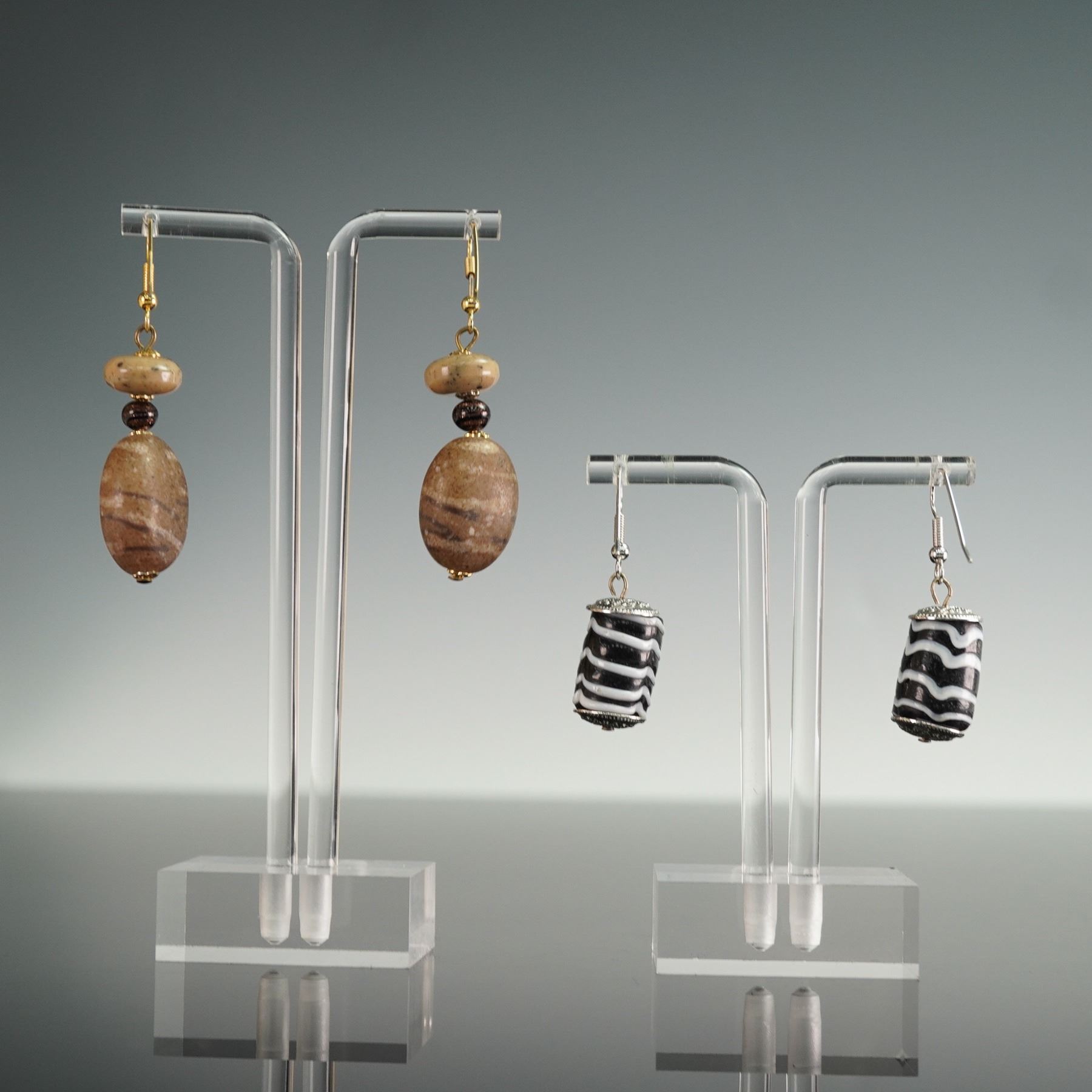 This set includes three pairs of earrings in a variety of styles, perfect for adding a touch of bohemian flair or artistic statement to any outfit. The first pair features intricate multi-tone beaded chandeliers with textured metal accents, capturing a vintage-inspired look with cascading beads in earthy tones. The second pair showcases large, natural stone drops with layered brown and beige tones, accented by polished beads and secure hook backings. The final pair offers a bold, modern aesthetic with black and white striped cylindrical beads, also with hook back findings. Sizes range from approximately 1.5"H to 2.5"H, making these pieces versatile for various styles and occasions.