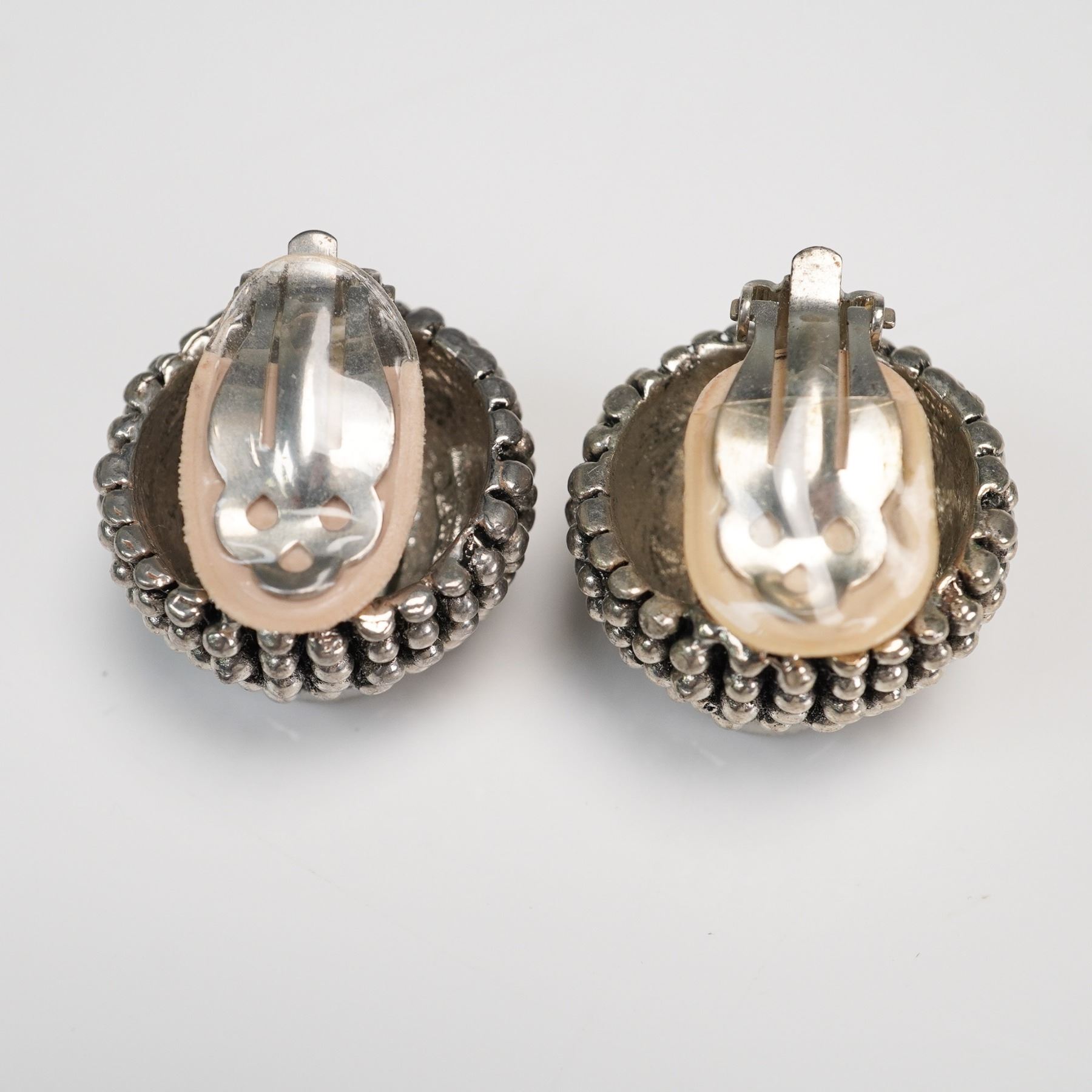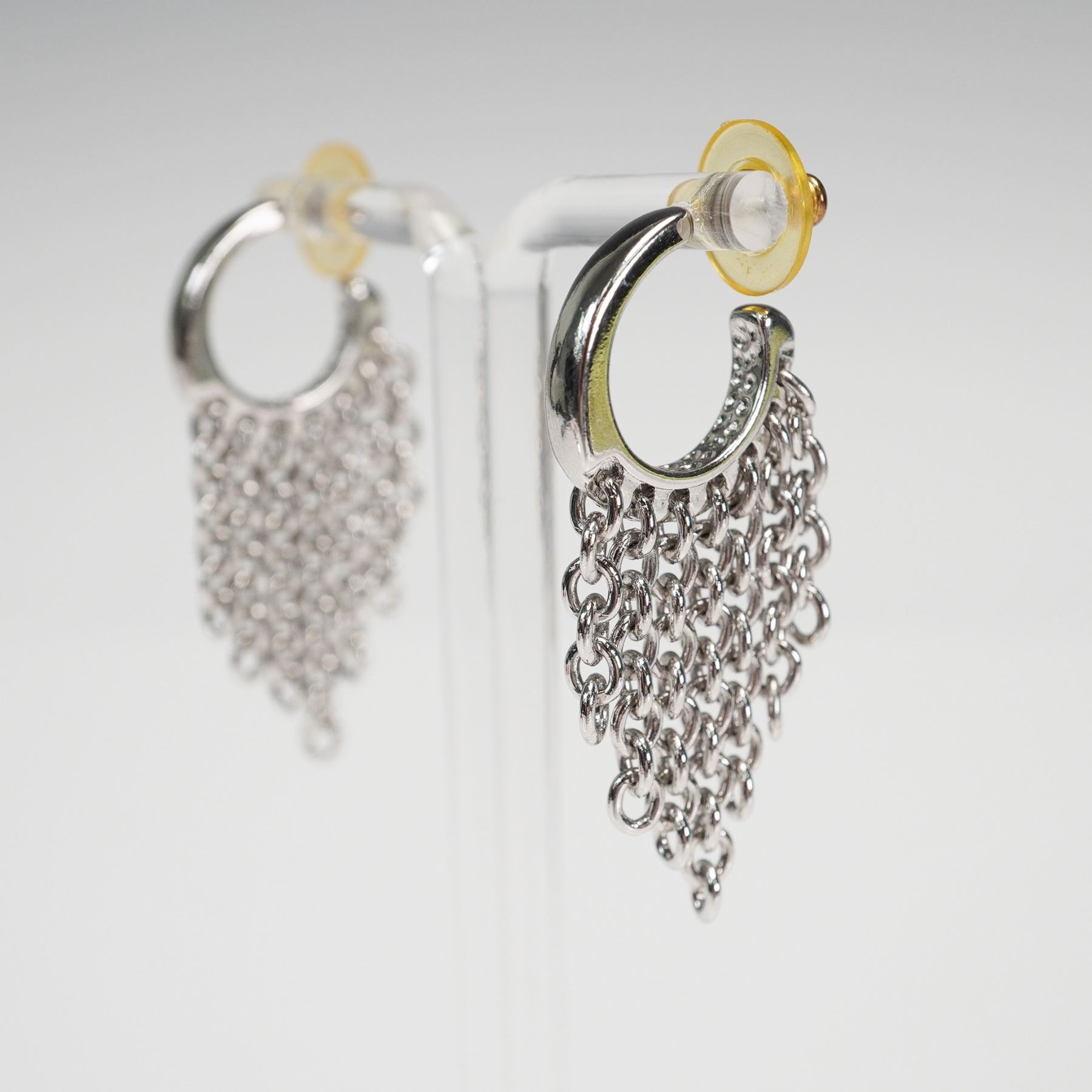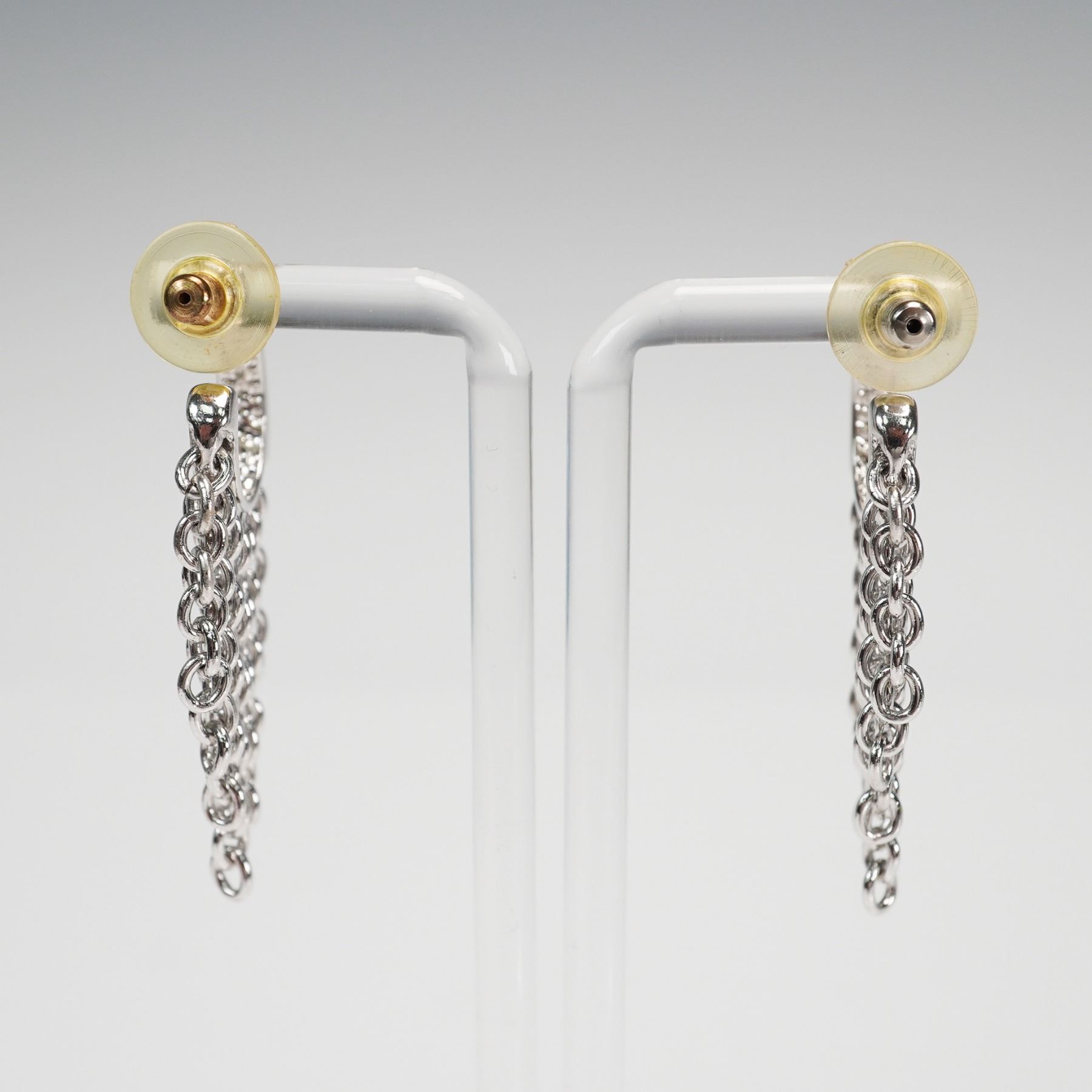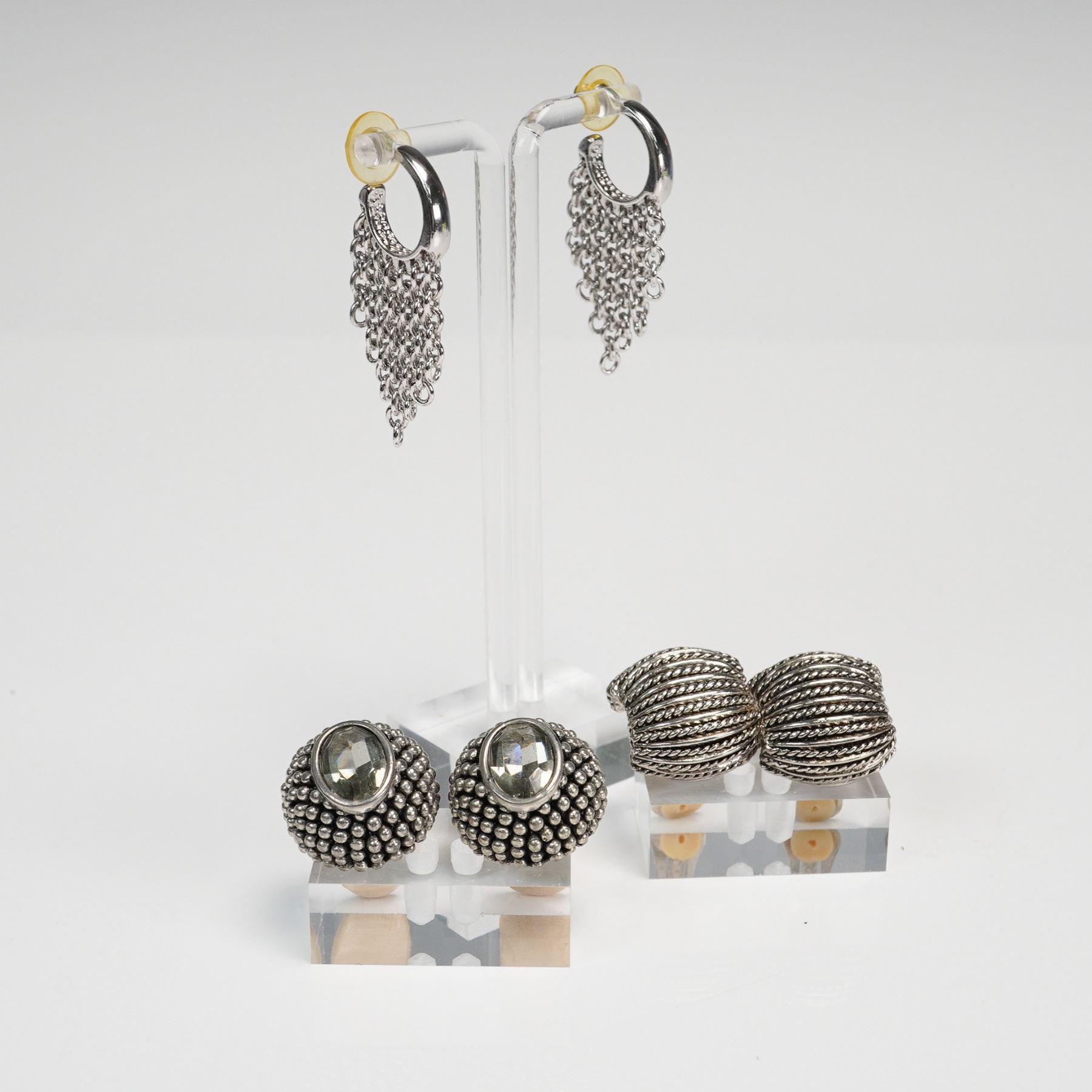 Group of three pairs of earrings in mixed silver-tone finishes, including: one pair of chain fringe dangle earrings with post backs and plastic stabilizers, one domed pair with raised beadwork surrounding a faceted clear stone, and one ribbed dome clip-on pair with twisted rope-like texture. Earring sizes range from approximately 1"H to 1.75"H.