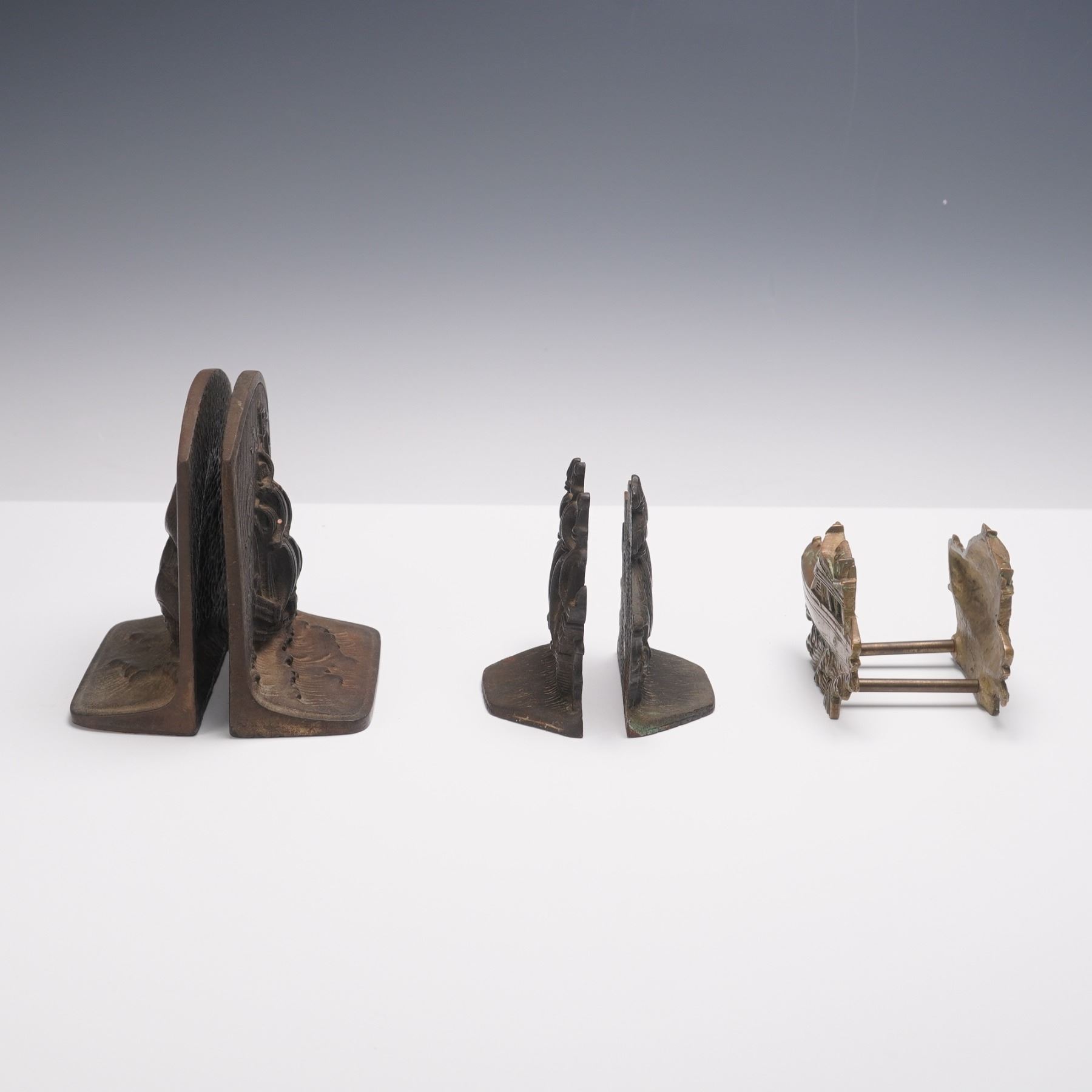One pair features a tall ship in full sail against a rising sun with textured waves beneath. Another pair is cast in the form of a three-masted galleon with detailed rigging and sails, presented in a free-standing relief. The final pair shows a stylized vessel framed by ornate scrolling waves, joined by rods at the back to form the bookends.
