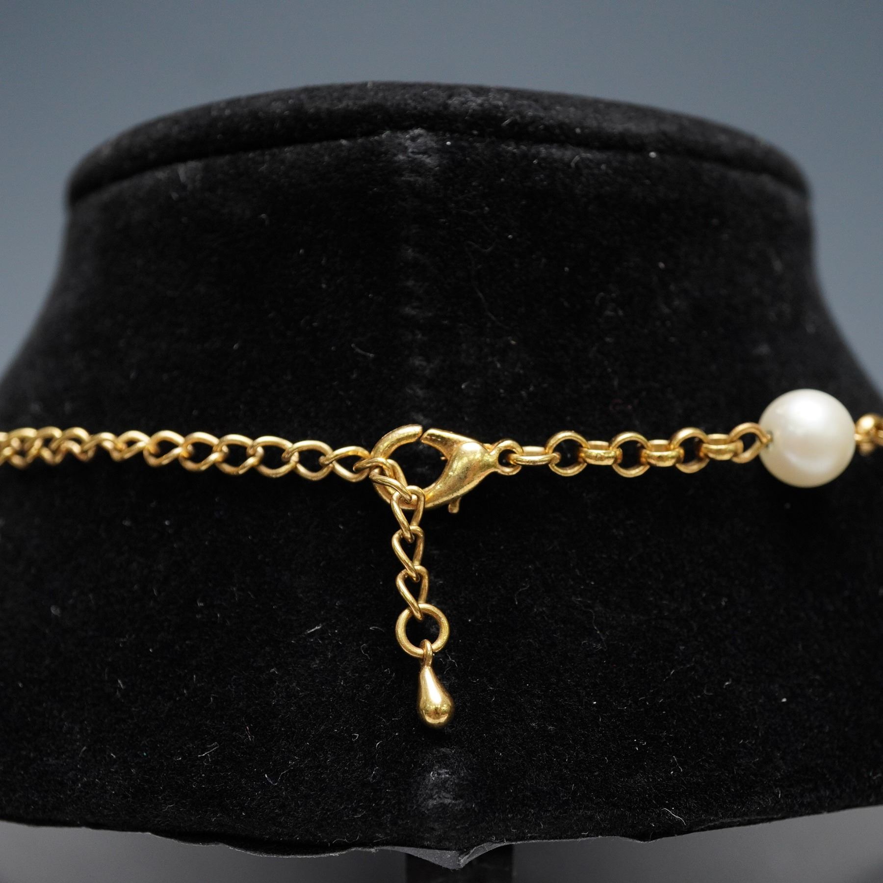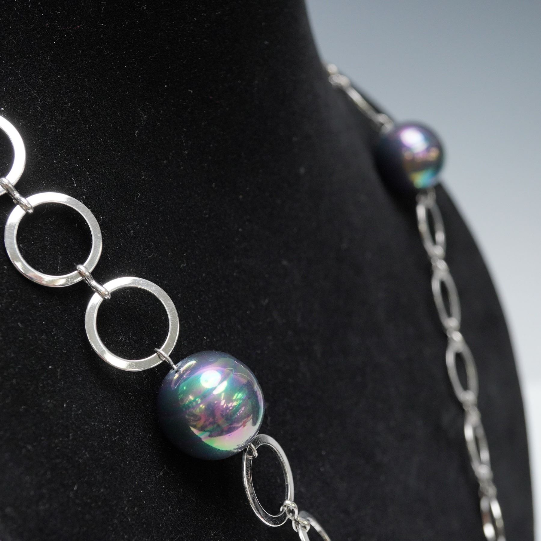 Eclectic three-piece necklace set including a long knotted cord necklace with painted ceramic beads and a fringe tassel; a choker-style piece featuring gold tone chain and simulated pearls with a lobster clasp; and a bold ring-link necklace with iridescent Mallorica-style beads and a circular open-link silver tone design. The tassel necklace measures 43"L clasp to clasp, the pearl and chain necklace measures 16"L clasp to clasp, and the Mallorica-style necklace measures 19"L end to end with no clasp.