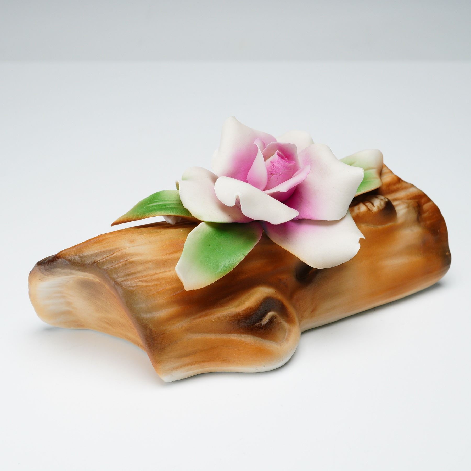 A three-piece lot of Nuova Capodimonte porcelain floral sculptures, each crafted and hand-painted in Italy. The collection features finely modeled blossoms in soft pink, yellow, and blue tones, arranged on textured log and stump-style bases with naturalistic detailing. One piece retains its original Nuova Capodimonte foil label, while all bear the crowned N and rearing horse backstamp with Made in Italy. These delicately rendered floral compositions exemplify the refined artistry and traditional craftsmanship associated with modern Capodimonte porcelain.