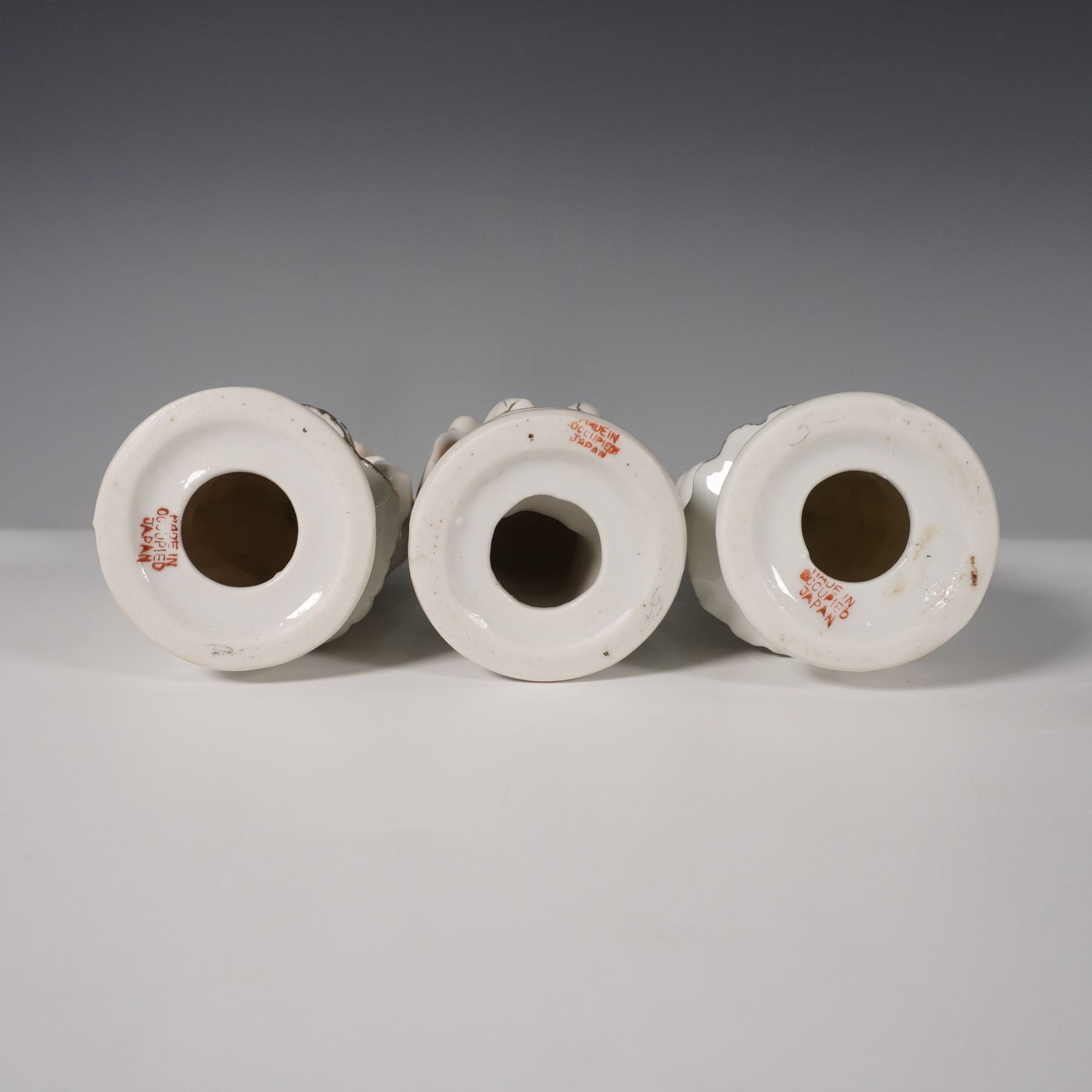This charming trio features two elegantly dressed female figures and one male figure in 18th-century-style attire. Each figurine is adorned with hand-painted gilt detailing, adding a touch of refinement to their intricate period costumes. The figurines exhibit delicate facial expressions and fine craftsmanship characteristic of Occupied Japan porcelain. Marked Made In Occupied Japan.