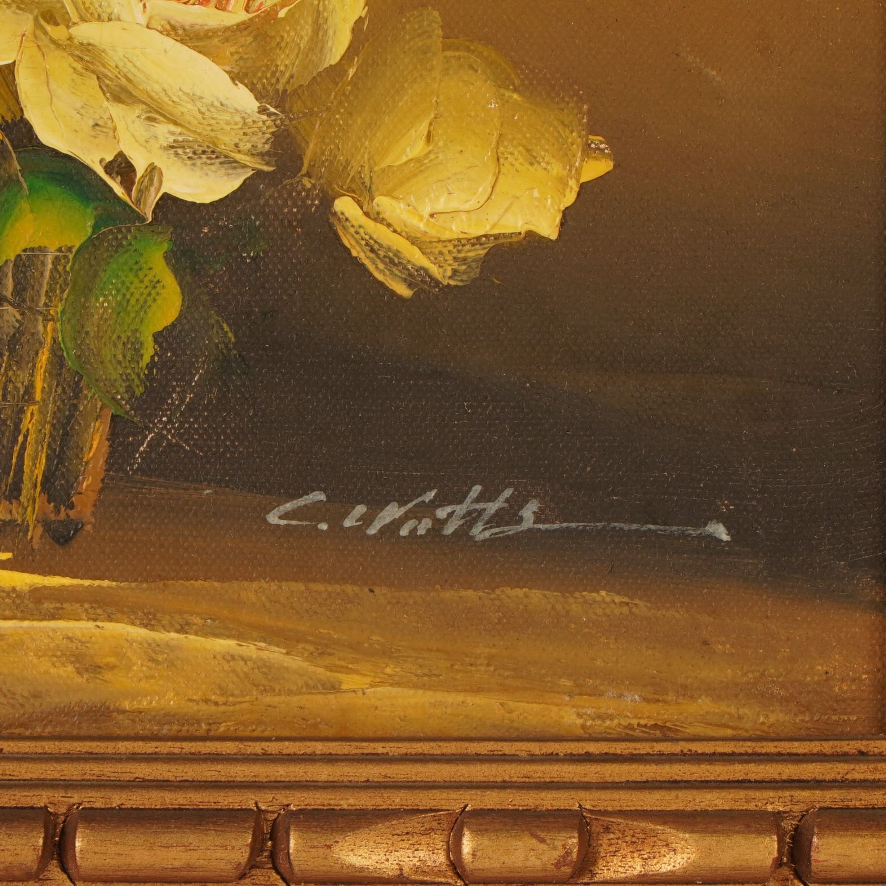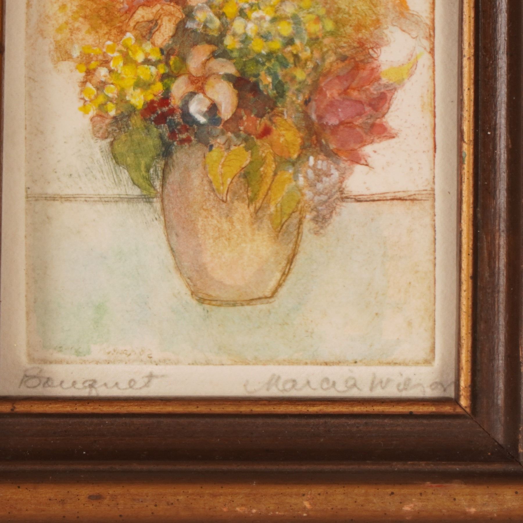 A charming collection of three floral-themed artworks featuring two oil paintings and one colored etching. The centerpiece, an oil on canvas signed C. Watts, captures a luminous bouquet of creamy yellow roses rendered with rich impasto texture and depth, beautifully complemented by its ornate gilt frame. The vertical oil painting, signed Rumeri, presents a bold arrangement of red, orange, and white blossoms against a dark background, showcasing vibrant color contrast and expressive brushwork. Completing the set is a delicate colored etching titled Bouquet and signed by Marcia Wilson, depicting a vase of mixed blooms in a soft, impressionistic hand with pastel hues and fine tonal detail. Each piece is individually framed, displaying distinctive styles yet harmonizing beautifully as a decorative ensemble.
