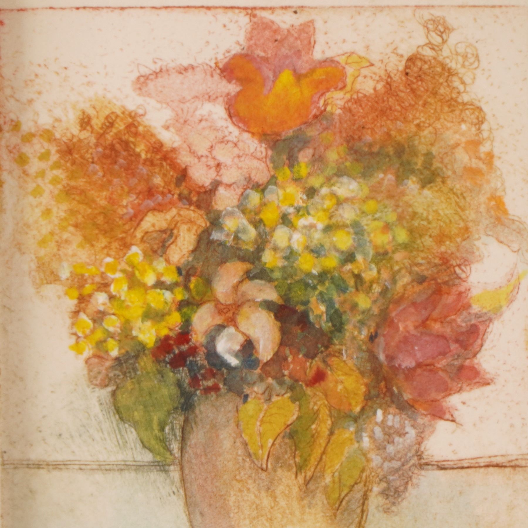 3pc Oil on Canvas Paintings & Color Etching, Floral Bouquets, Signed