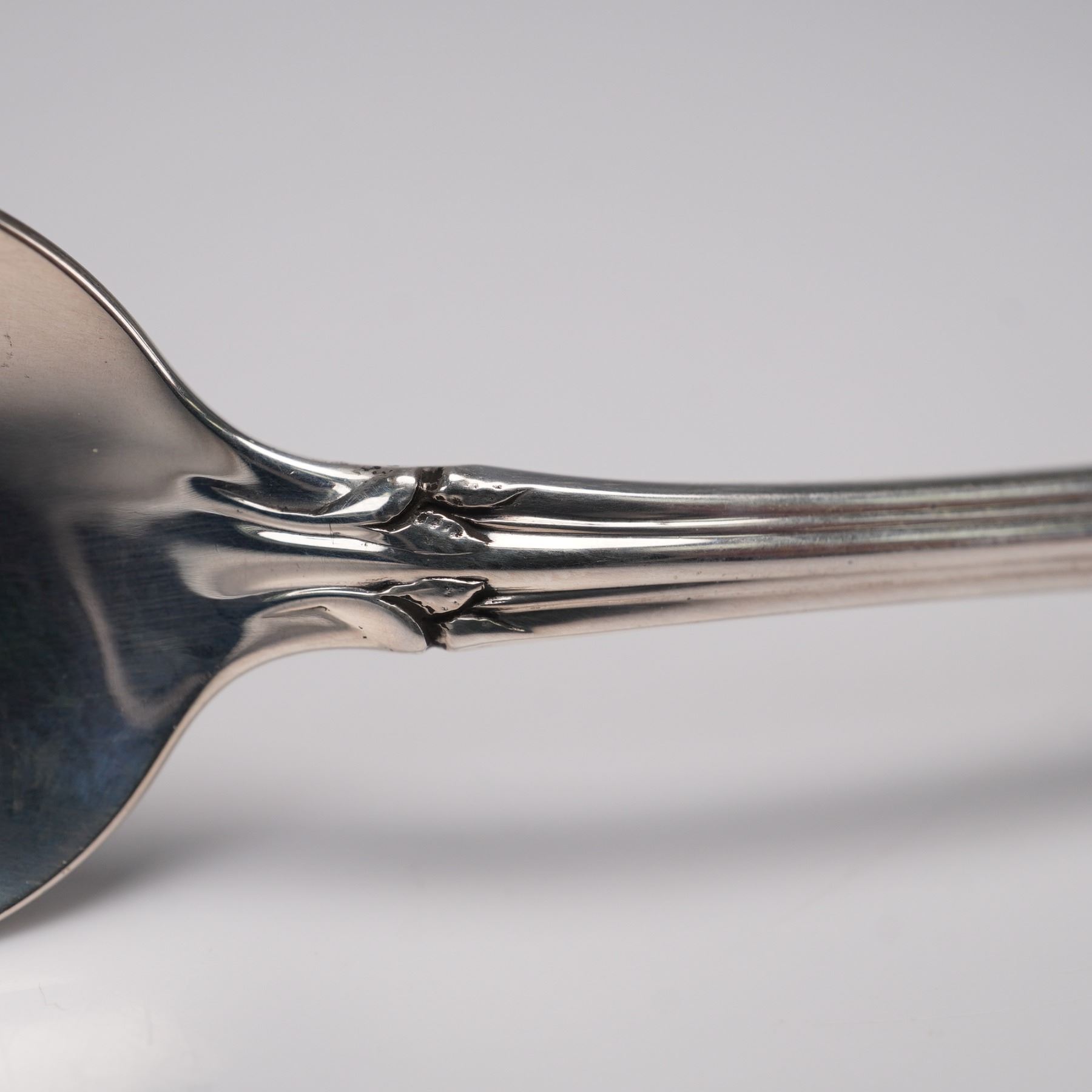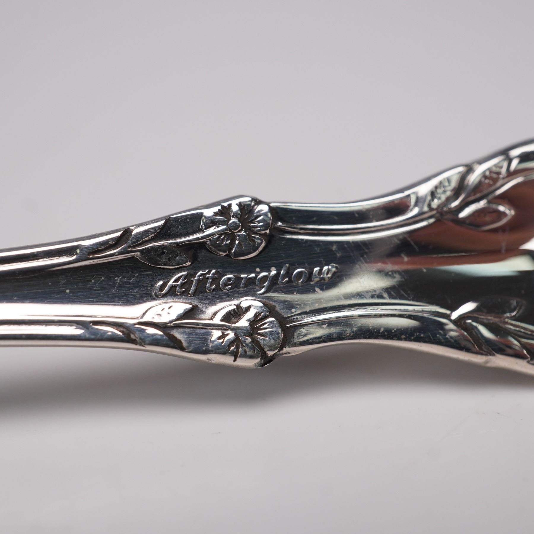 A stylish trio of sterling silver demitasse spoons in the "Afterglow" pattern. Each spoon showcasing an intricately cast floral motif with flowing botanical scrollwork adorning the handles. Inscribed "Afterglow". Oneida Sterling hallmarked. Net Silver 1.28 troy oz.