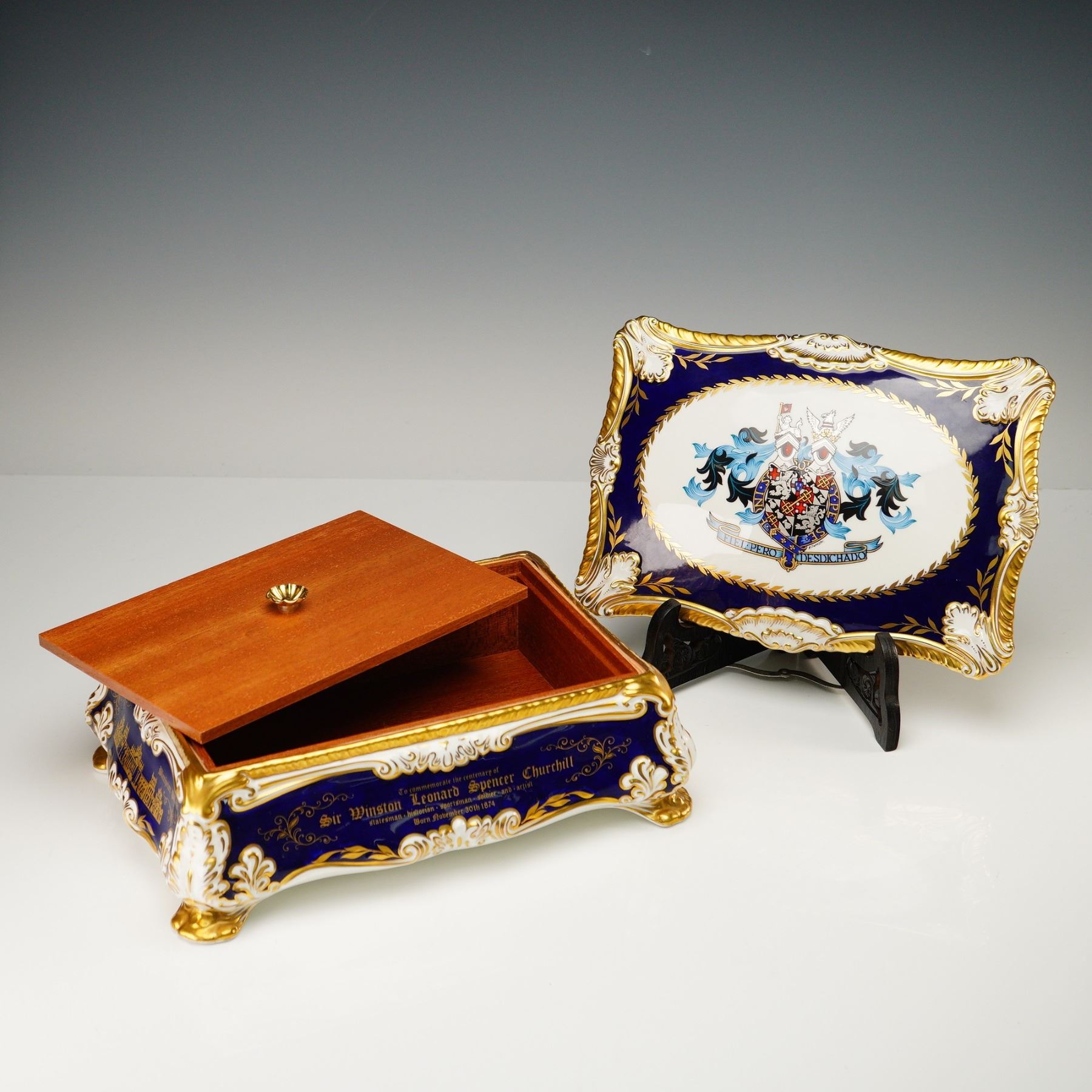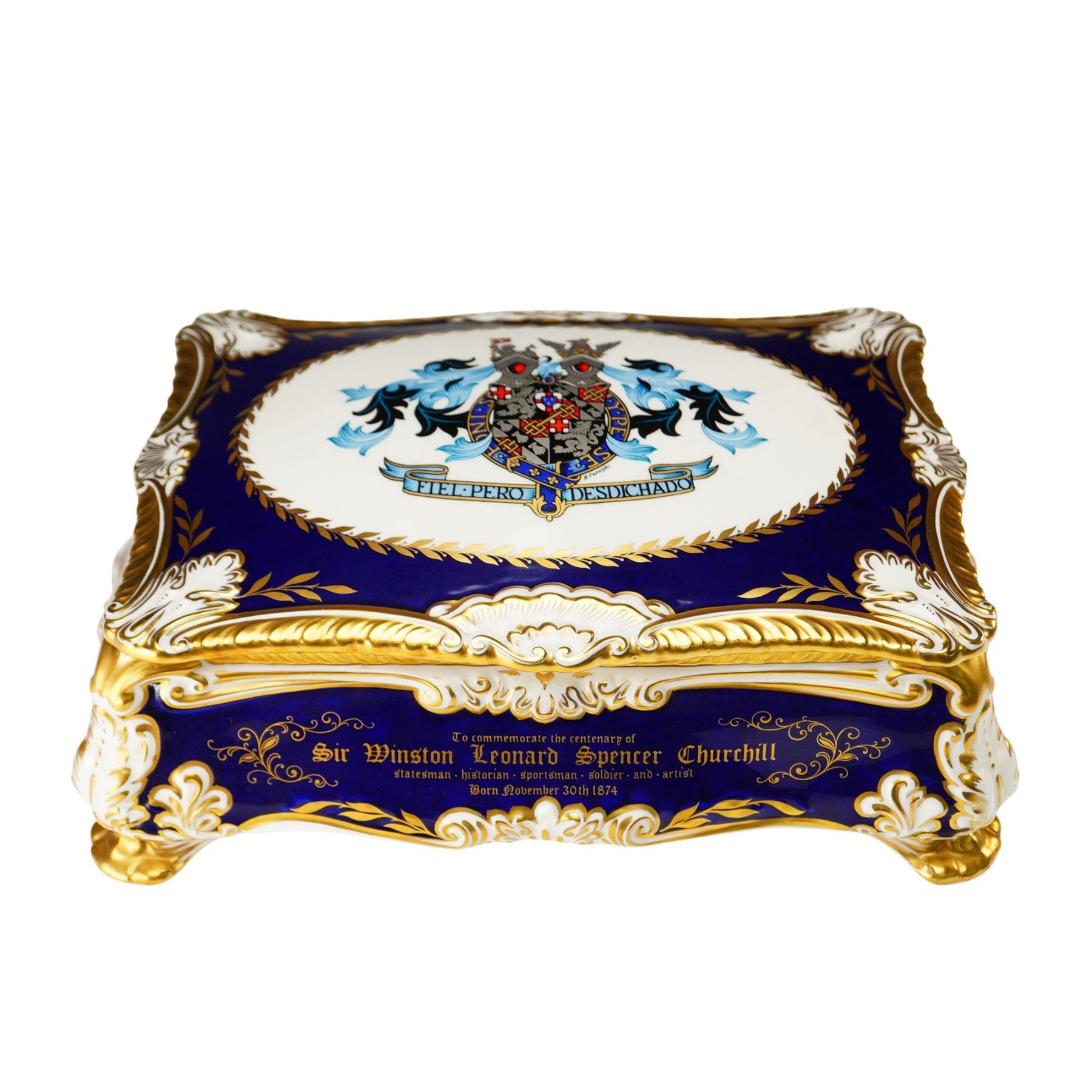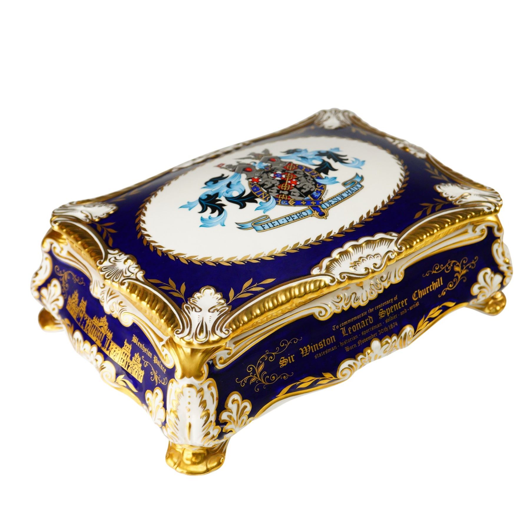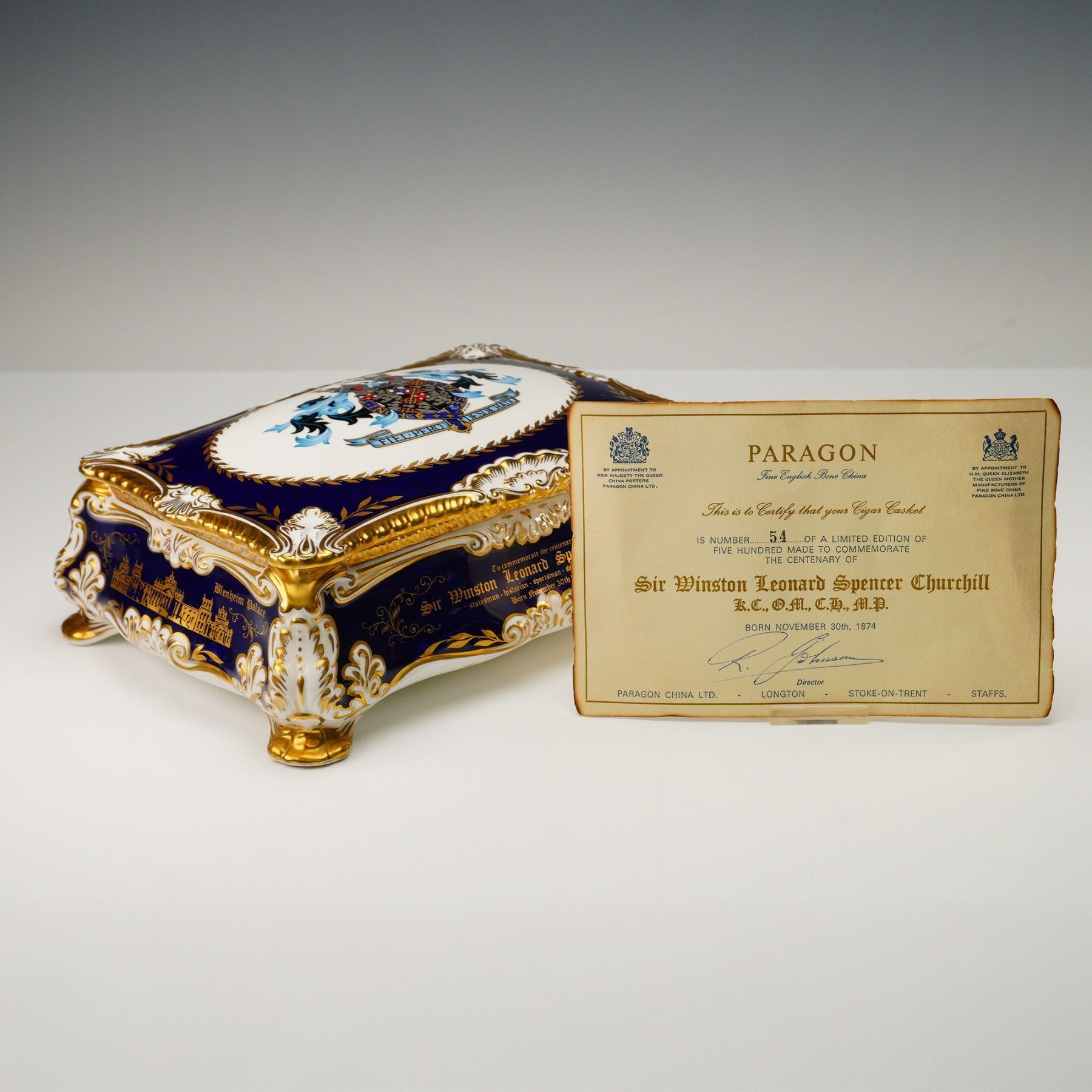 Limited edition covered cigar box by Paragon Fine Bone China, created to commemorate the centenary of Sir Winston Leonard Spencer Churchill (1874-1974). This commemorative box is number 54 of a limited edition of 500 pieces. Crafted in England, the piece features a deep cobalt blue ground with rich gold accents, white highlights, and gilt trim throughout. The domed porcelain lid is decorated with the Churchill family coat of arms bearing the motto FIEL PERO DESDICHADO, encircled by a gilt laurel border. The box is further embellished with elaborate gold-painted illustrations of architectural landmarks, including Blenheim Palace, and inscribed tributes detailing Churchill's titles and accomplishments as a statesman, historian, orator, soldier, and artist. The interior reveals a removable wooden insert with a brass knob, designed to store cigars. The underside is printed with a dedication and royal warrant. Includes the original certificate of authenticity issued by Paragon China Ltd., Stoke-on-Trent, identifying the piece as part of the official limited edition commemorating Churchill's birth on November 30, 1874.