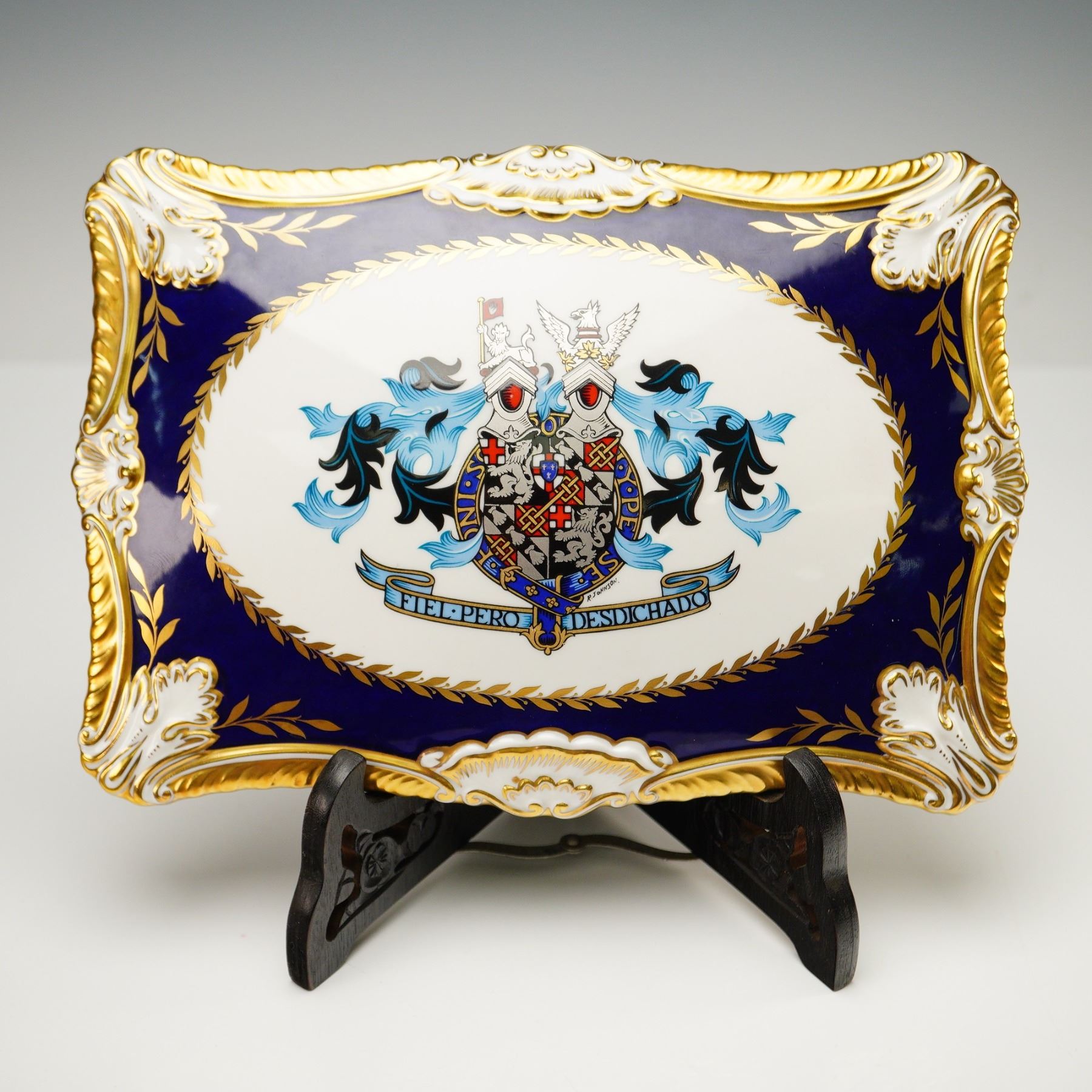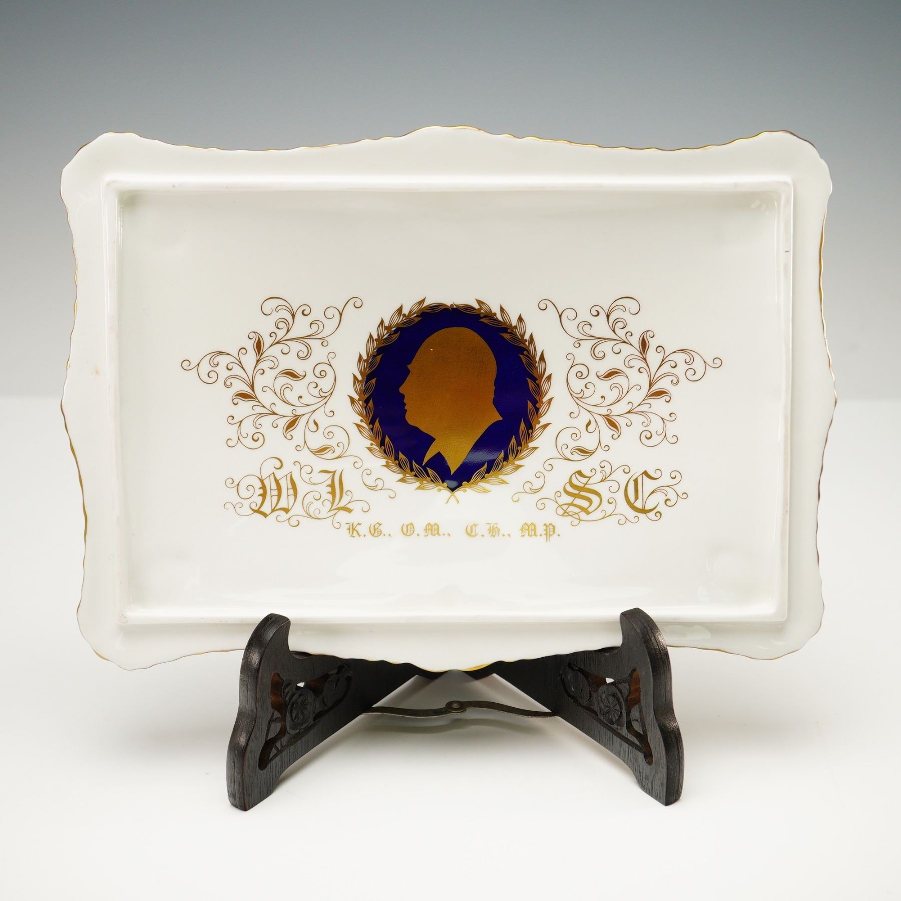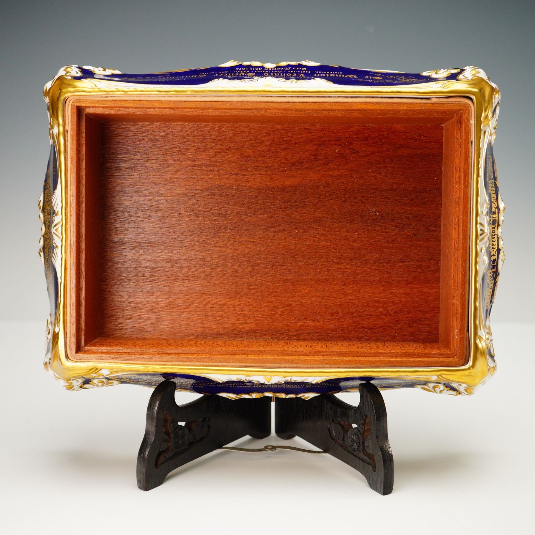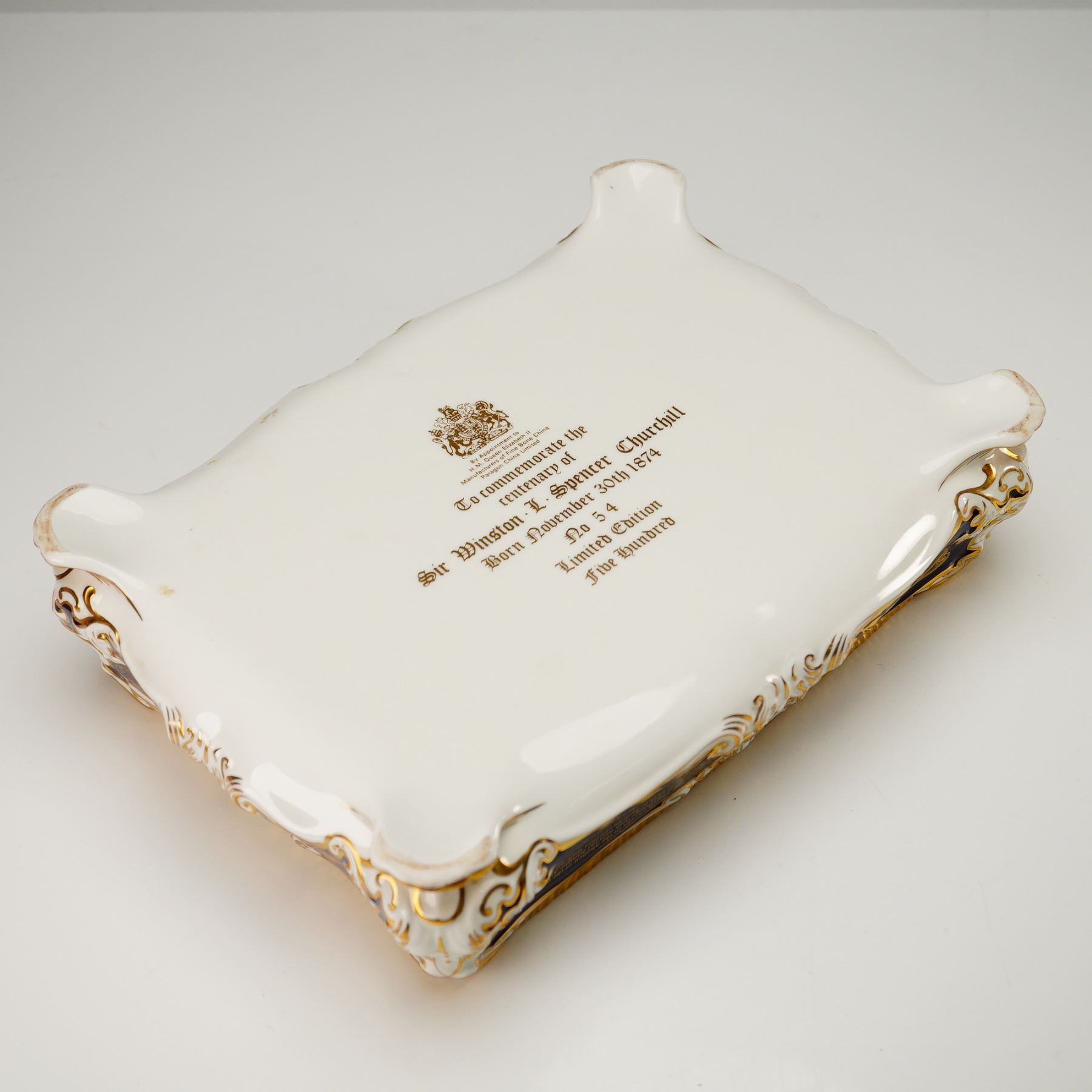 Limited edition covered cigar box by Paragon Fine Bone China, created to commemorate the centenary of Sir Winston Leonard Spencer Churchill (1874-1974). This commemorative box is number 54 of a limited edition of 500 pieces. Crafted in England, the piece features a deep cobalt blue ground with rich gold accents, white highlights, and gilt trim throughout. The domed porcelain lid is decorated with the Churchill family coat of arms bearing the motto FIEL PERO DESDICHADO, encircled by a gilt laurel border. The box is further embellished with elaborate gold-painted illustrations of architectural landmarks, including Blenheim Palace, and inscribed tributes detailing Churchill's titles and accomplishments as a statesman, historian, orator, soldier, and artist. The interior reveals a removable wooden insert with a brass knob, designed to store cigars. The underside is printed with a dedication and royal warrant. Includes the original certificate of authenticity issued by Paragon China Ltd., Stoke-on-Trent, identifying the piece as part of the official limited edition commemorating Churchill's birth on November 30, 1874.