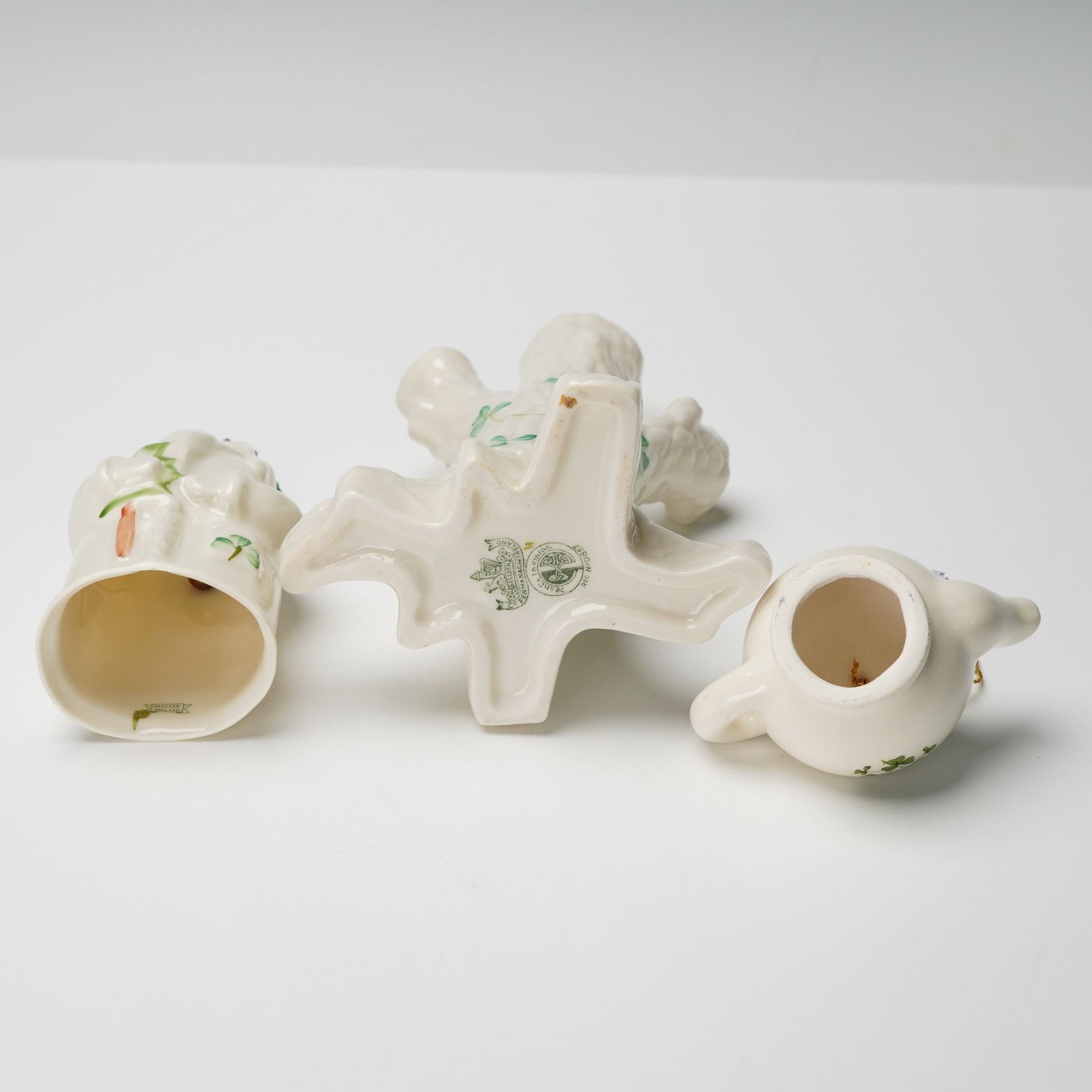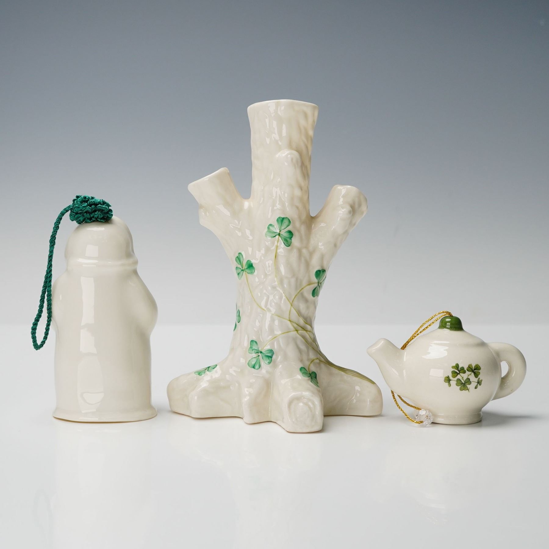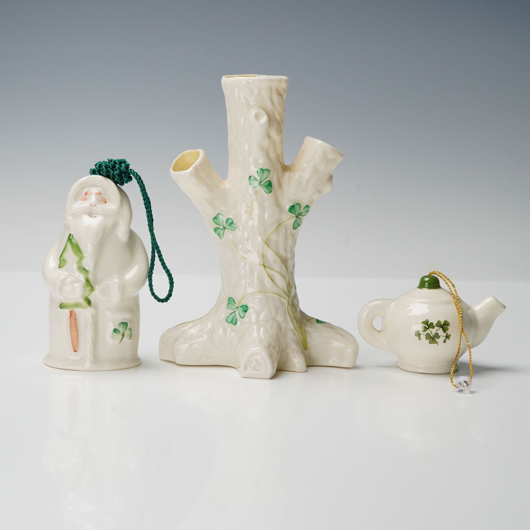 This 3-piece group includes one tree trunk form bud vase, one Santa ornament, and one teapot ornament with shamrock decoration. The vase and Santa ornament have Belleek Ireland backstamps.