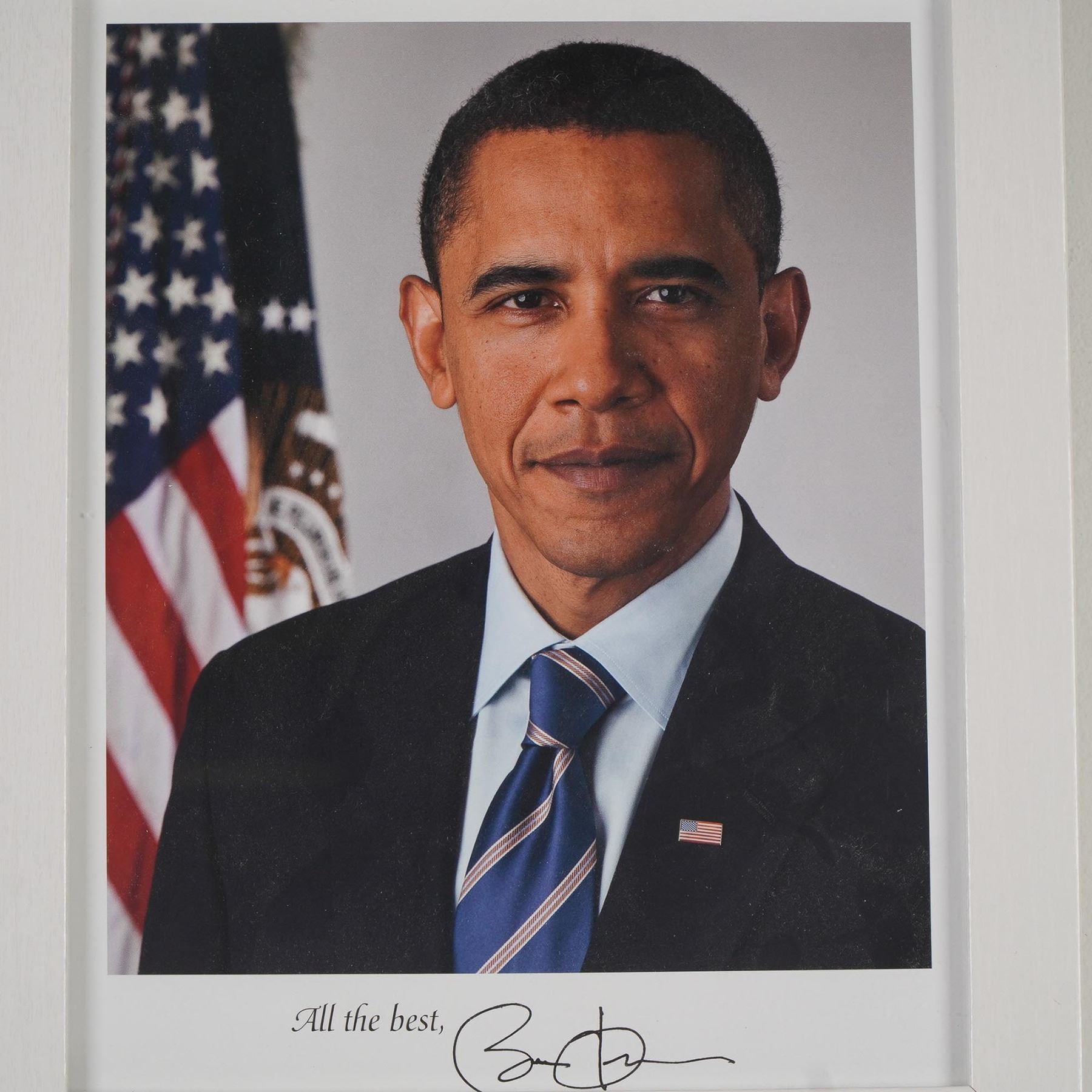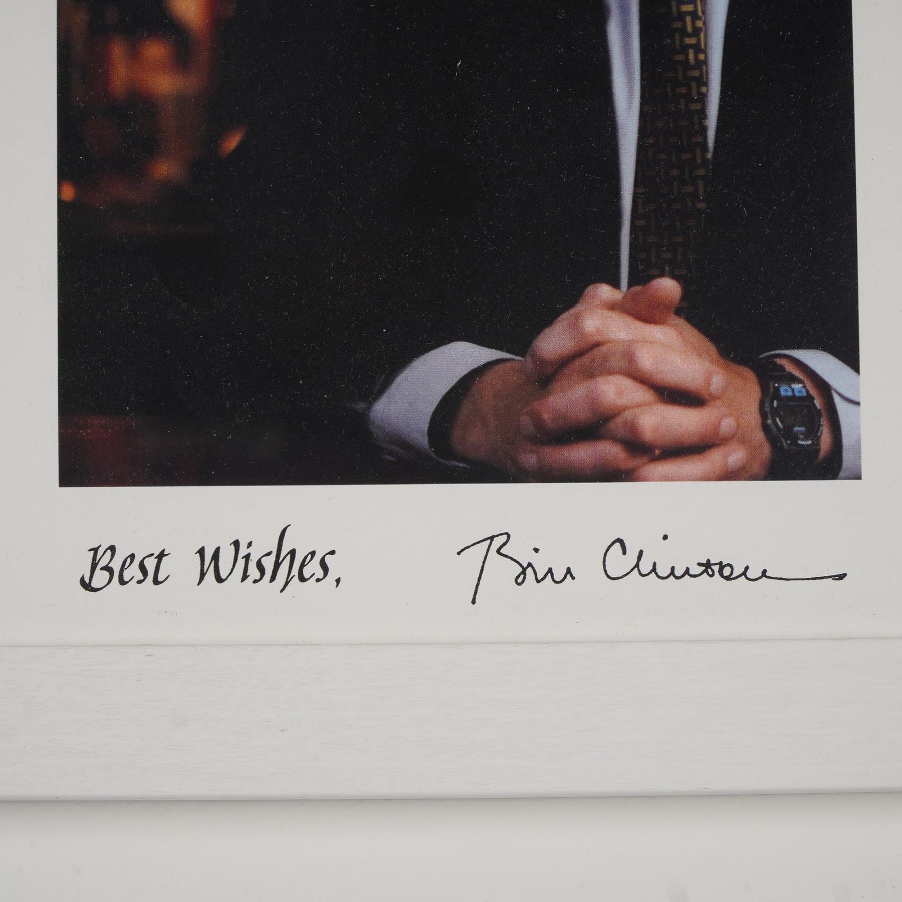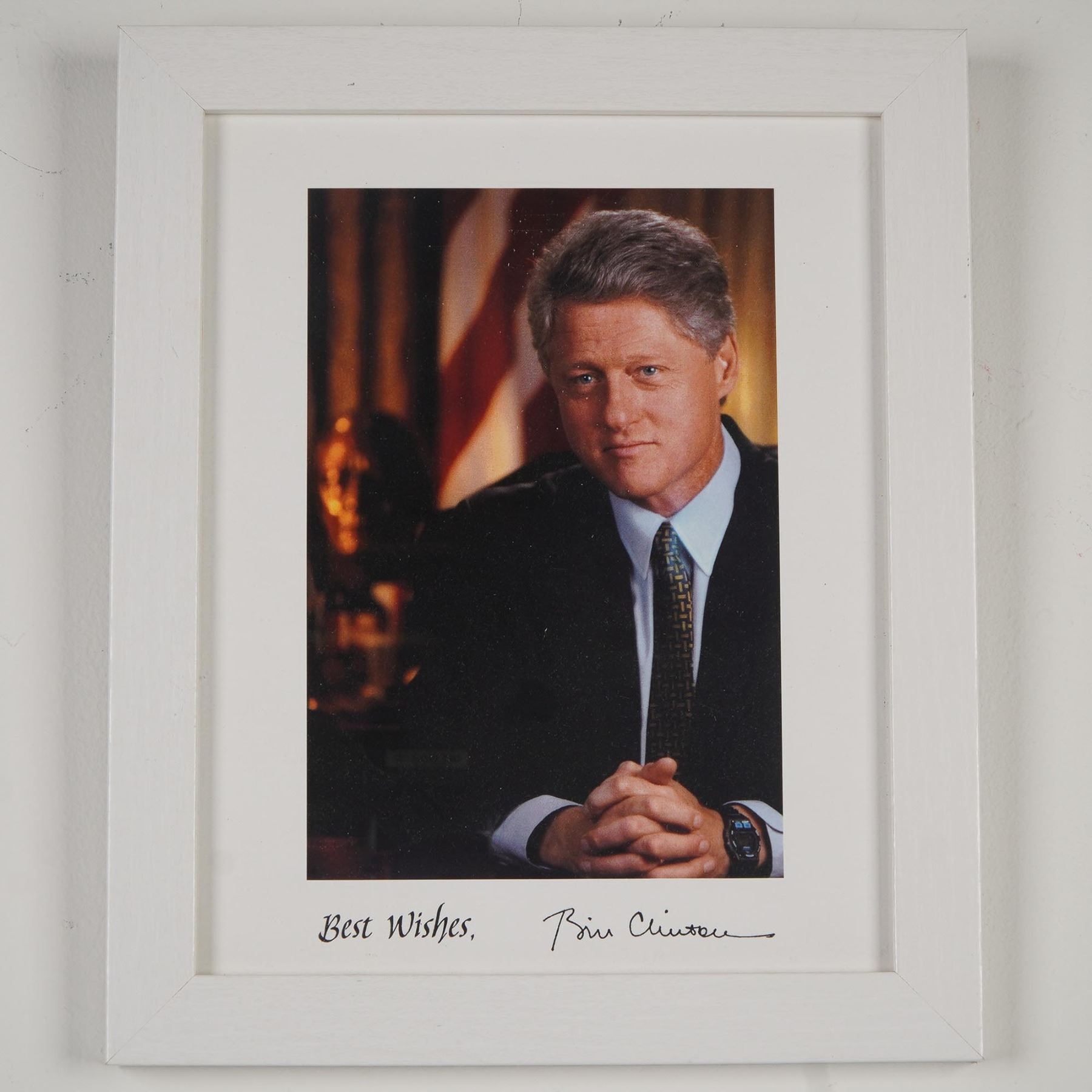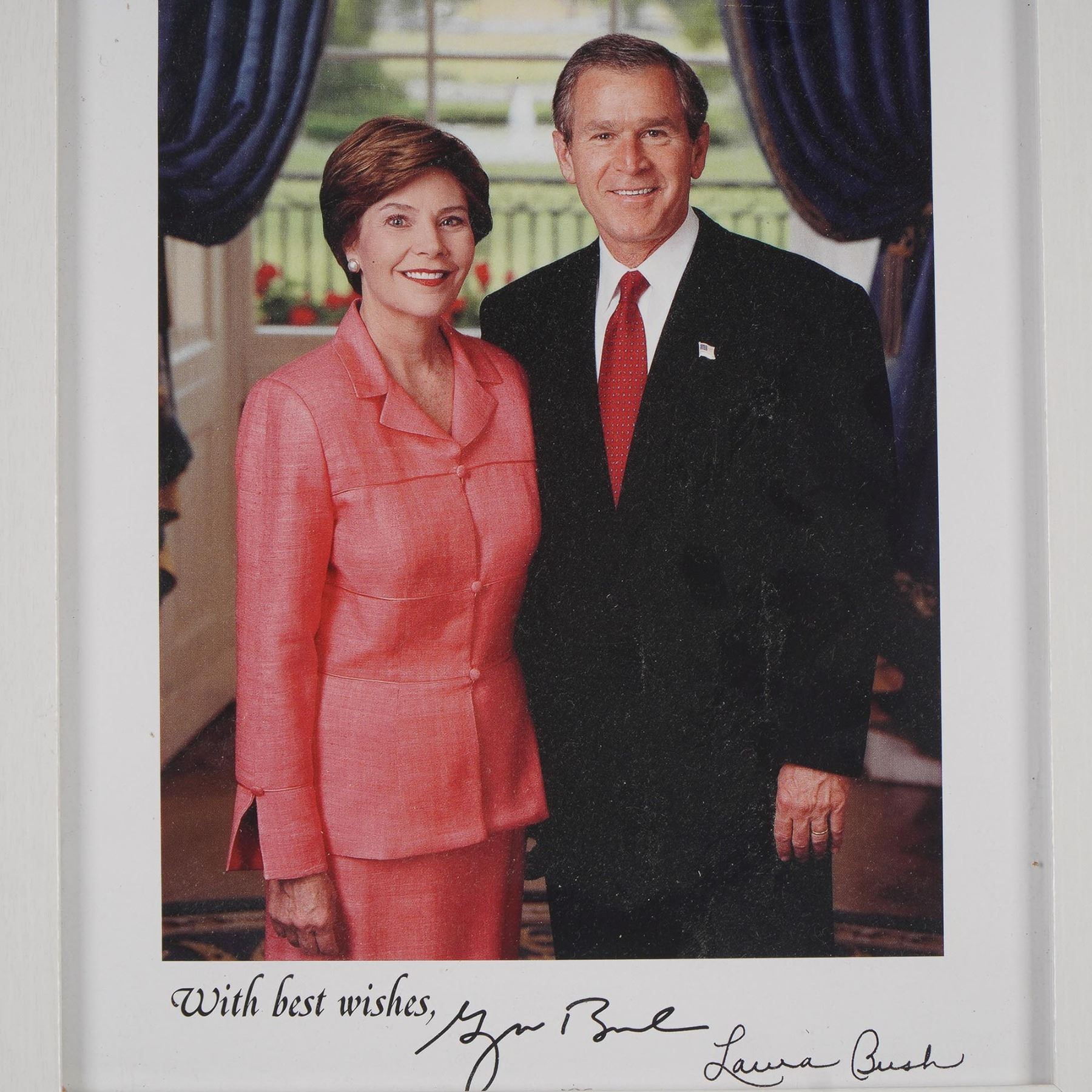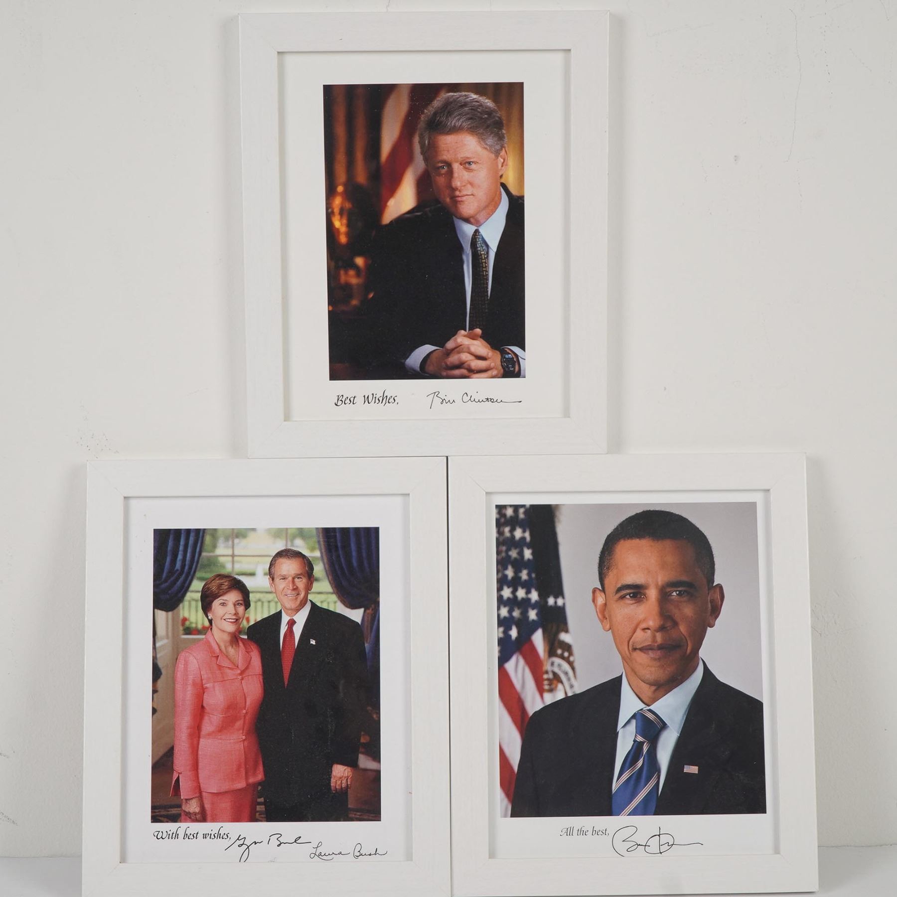 Group of three framed color portraits featuring U.S. Presidents Bill Clinton, George W. Bush (with First Lady Laura Bush), and Barack Obama. Each image is printed with a facsimile signature and personalized message. The Clinton portrait reads "Best Wishes," the Bush portrait is inscribed "With best wishes" and includes both George and Laura Bush's printed signatures, while the Obama image includes the phrase "All the best." These official-style photographic prints are presented in matching white frames and offer a collectible display of modern American political history.