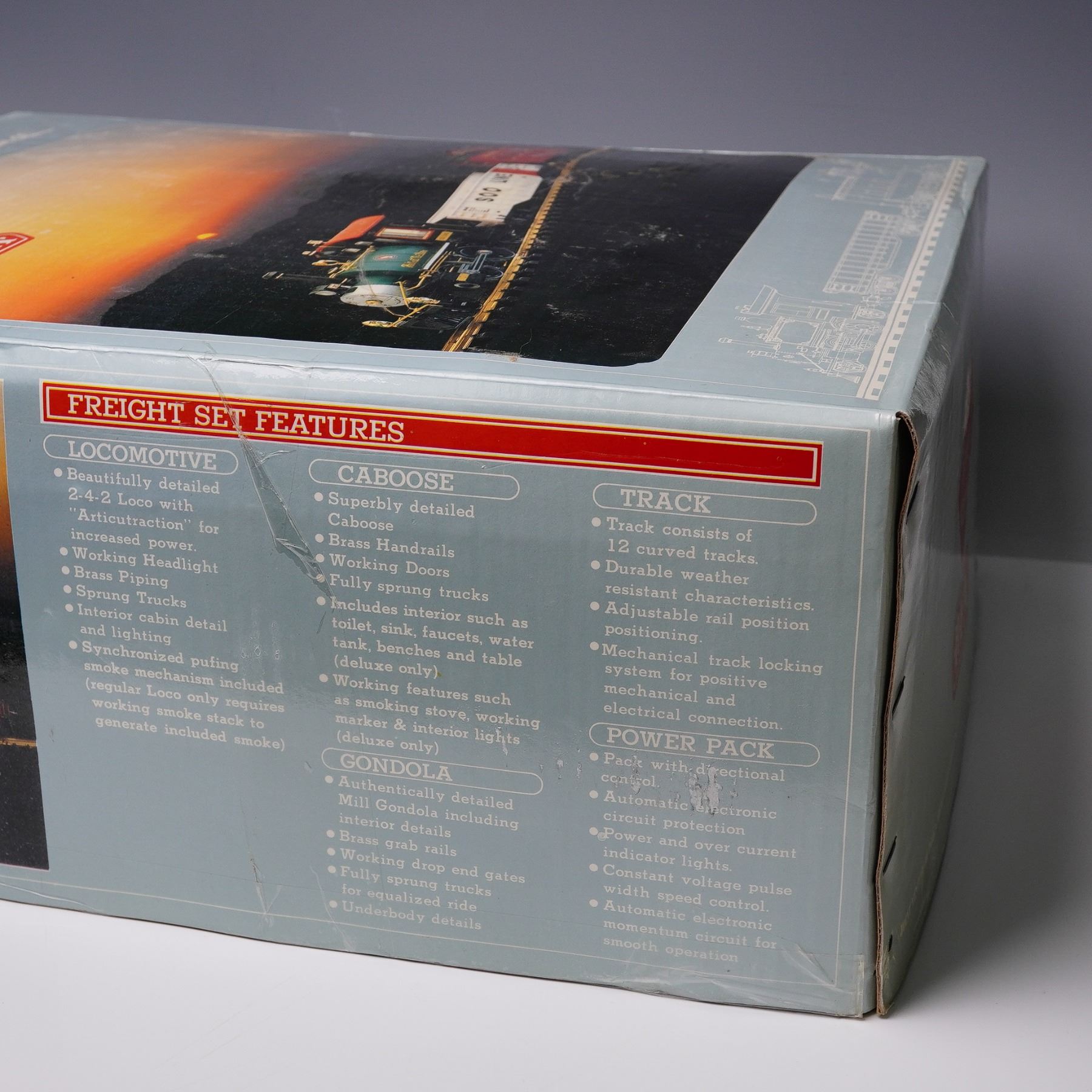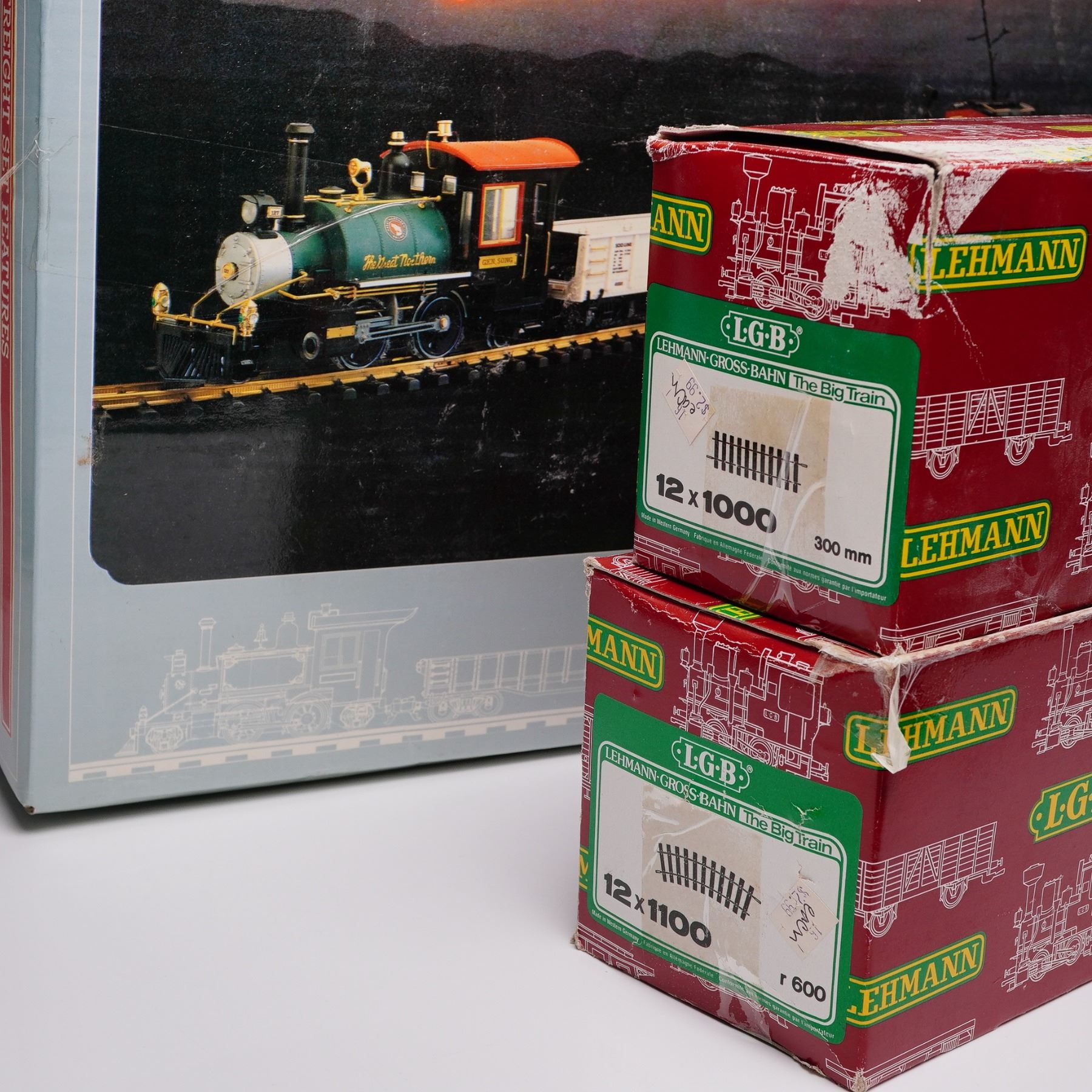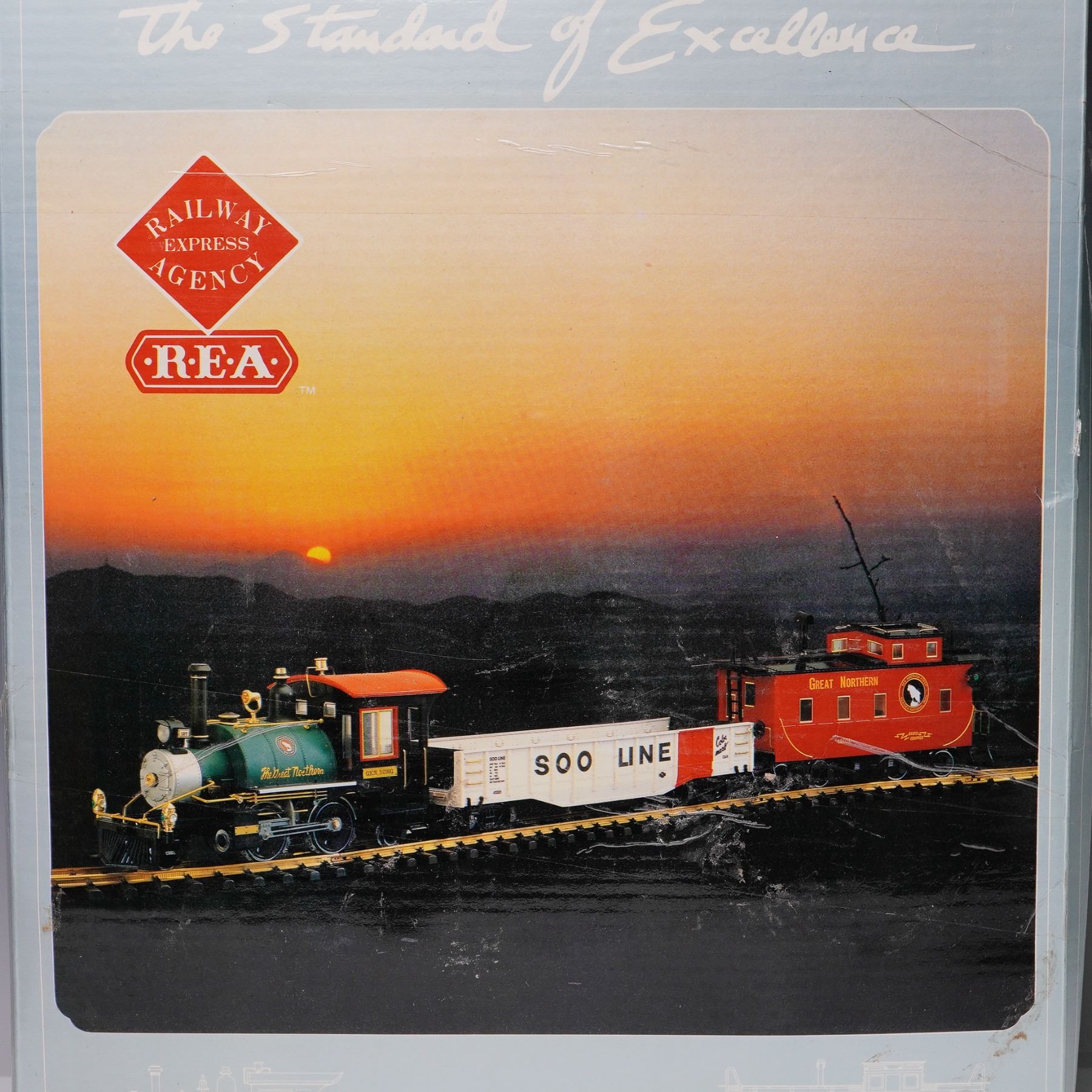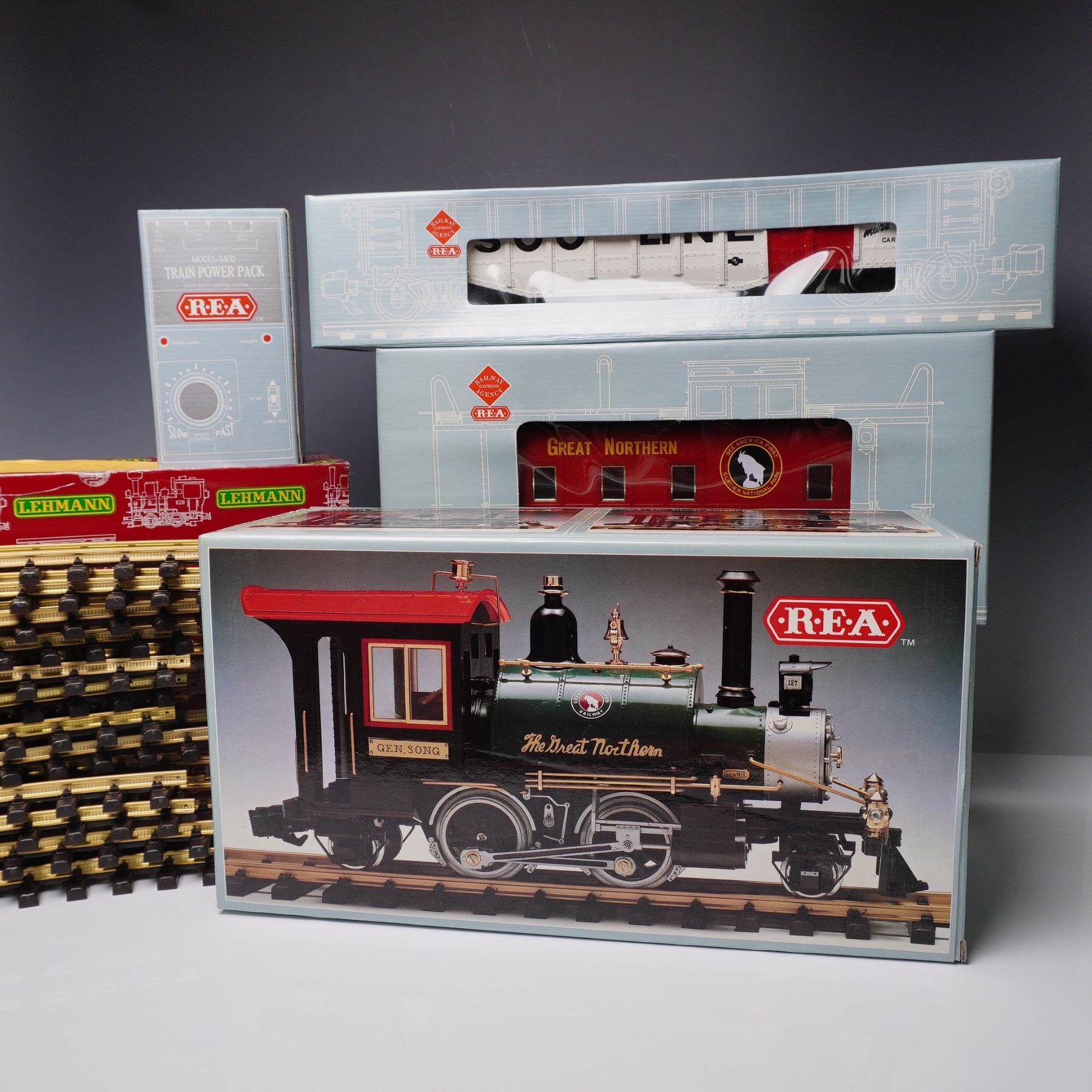 REA (Railway Express Agency) G scale Great Northern freight train set including a steam locomotive marked "Gen. Song," red caboose, and white gondola, all housed in original boxes with interior packaging. The set includes a 2-4-2 articulated locomotive with working headlight, synchronized smoke mechanism, brass piping, sprung trucks, and detailed cab interior. Accompanied by an REA transformer power pack and two boxes of LGB Lehmann track sections (12 straight No. 1000 and 12 curved No. 1100). Track pieces are brass rail and compatible with G scale layout systems. All housed in its original packaging Outer packaging lists deluxe interior and lighting features.
