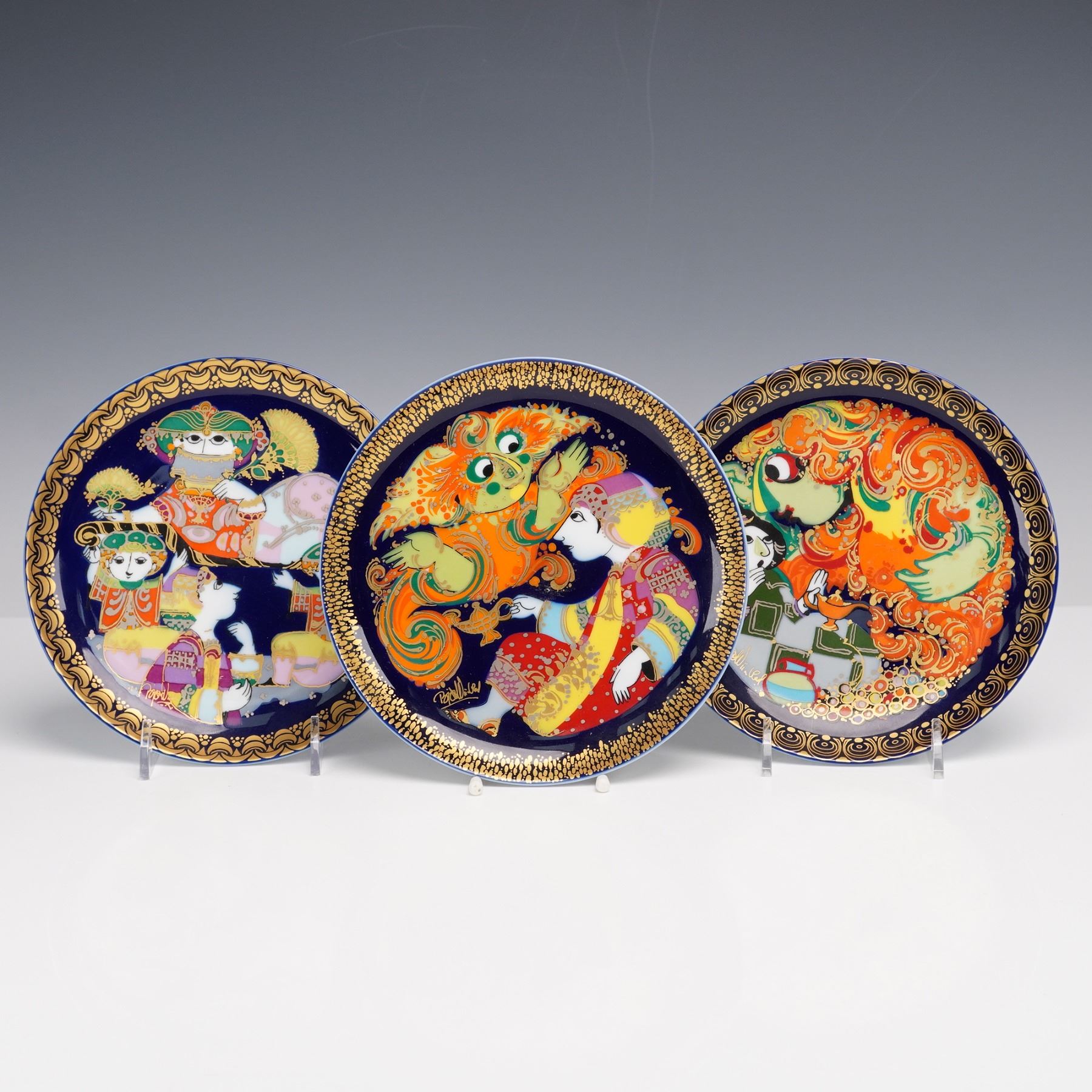 This 3-piece set of Rosenthal plates features numbers 1, 6, and 7 from the Aladdin und die Wunderlampe series. Each plate showcases vibrant, colorful artwork with whimsical depictions of Aladdin and his magical adventures. The bold colors and intricate designs, including rich blues and gold accents, create a captivating visual experience. Designed by Bjorn Wiinblad, these plates reflect his signature style and imagination. Ideal for display, they feature detailed hand-painted designs and the classic Rosenthal backstamp.