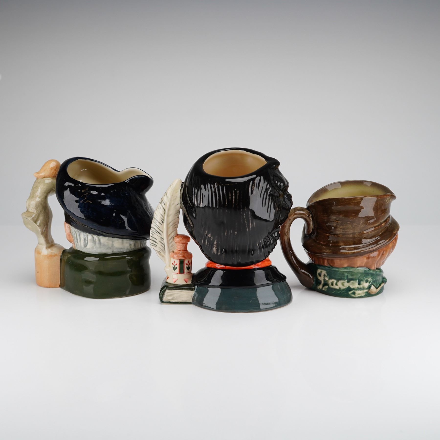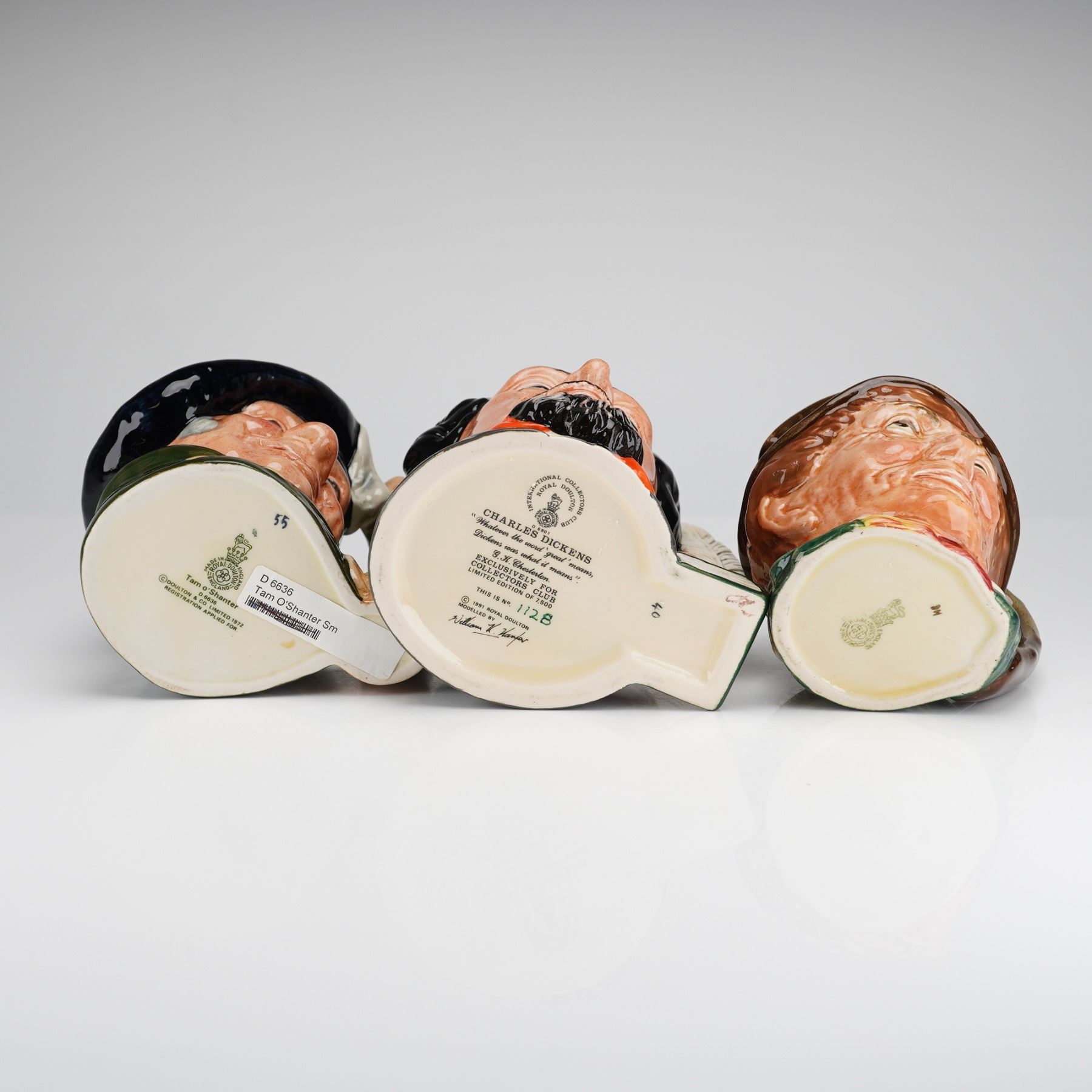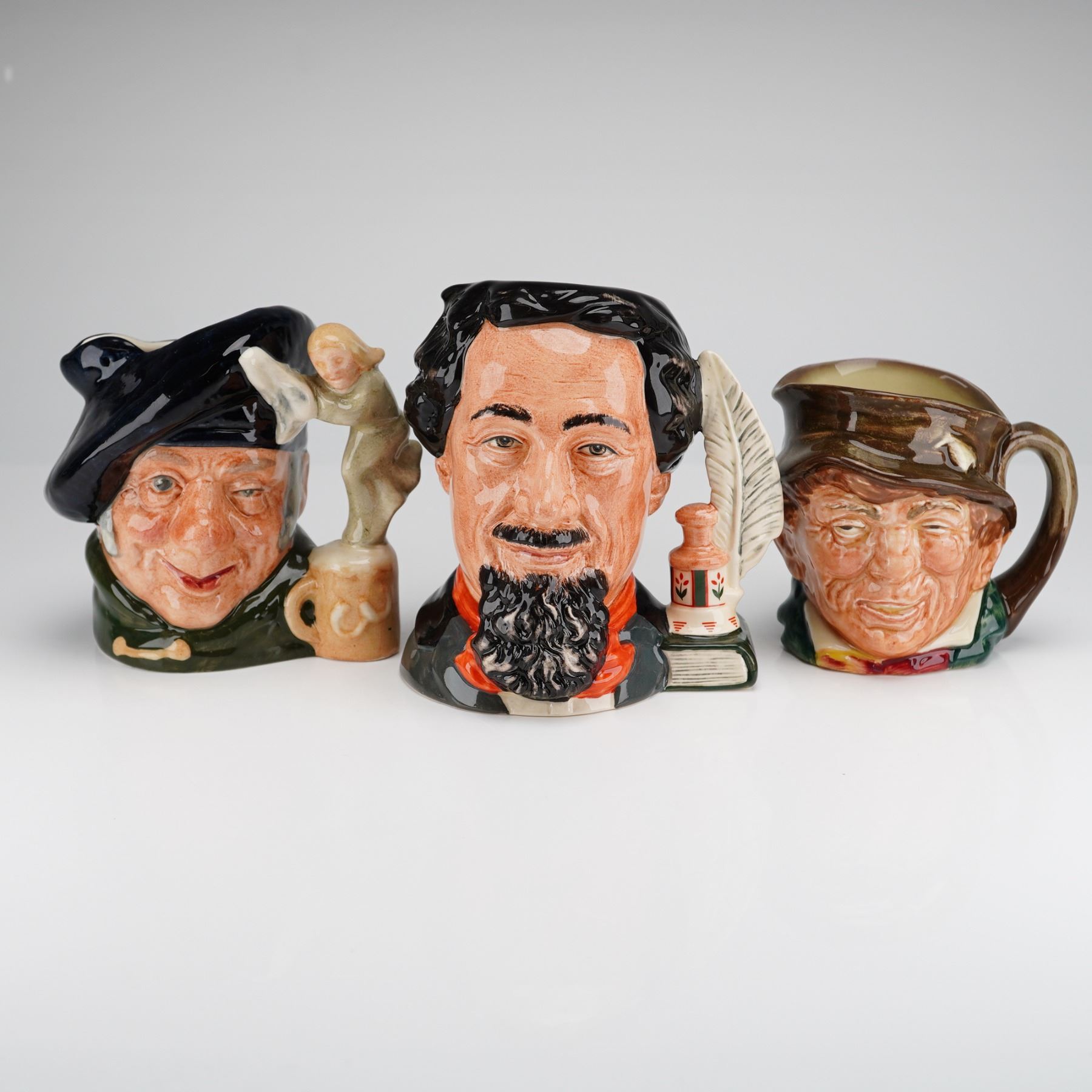 Three small Royal Doulton character jugs including Tam O Shanter D6636, Charles Dickens D6901, and Paddy D5768. Each piece is finished in a polychrome glaze and bears the standard Royal Doulton backstamp on the base along with specific model information. The Tam O Shanter jug (D6636) features a figural handle. The Charles Dickens jug (D6901) is a limited edition numbered 1,128 of 7,500 for the International Collectors Club; it was modeled by William K. Harper and features a quill and inkpot handle with a printed quote by G.K. Chesterton. The Paddy jug (D5768) is depicted with a classic handle and a shamrock-adorned hat with a pipe.
