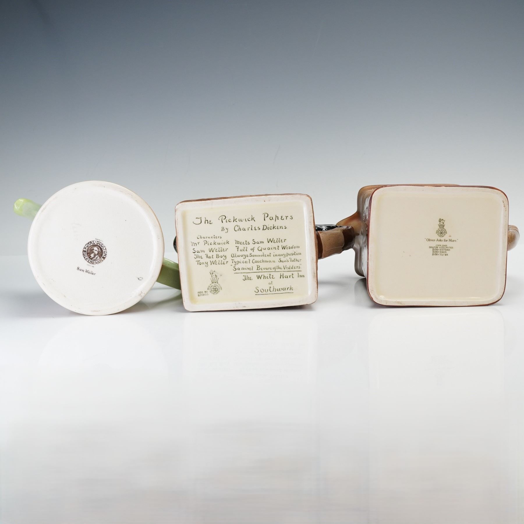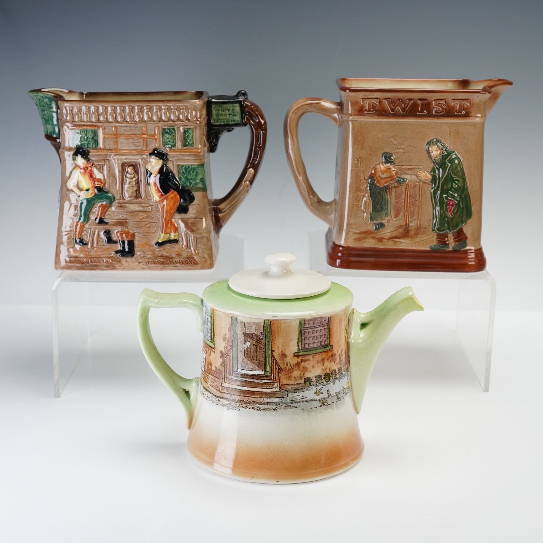 Group of three Royal Doulton Dickens Ware pieces depicting scenes from the novels of Charles Dickens. Includes two relief-molded pitchers showing Oliver asking for more and The White Hart Inn at Southwark from The Pickwick Papers, along with a teapot decorated with Sam Weller. Each features hand-painted detail and the Royal Doulton backstamp beneath. Base inscriptions read: The Pickwick Papers by Charles Dickens, The White Hart Inn at Southwark and Oliver Asks for More, both with Royal Doulton marks.