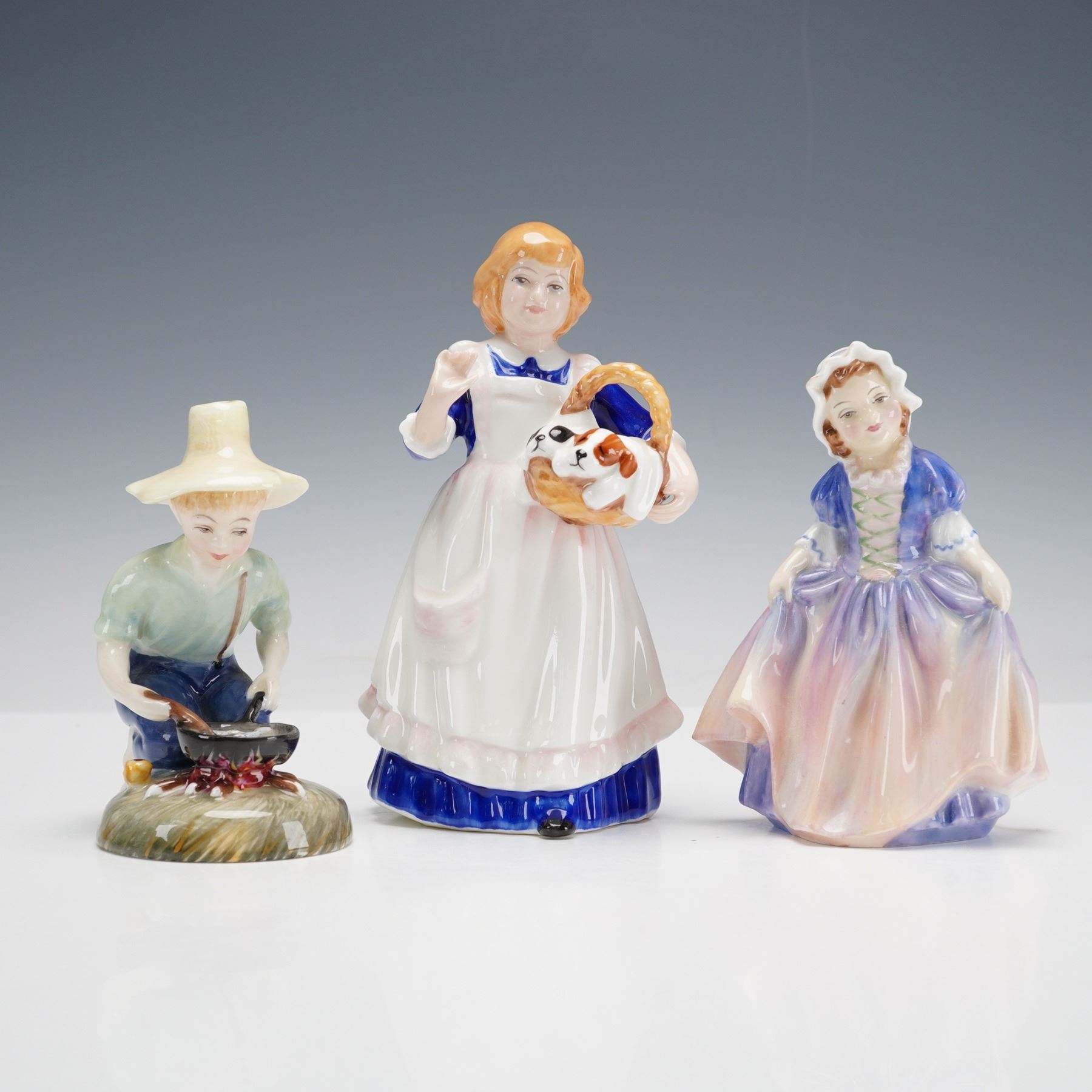 A charming trio of Royal Doulton porcelain figurines including River Boy HN2128, depicting a young boy cooking over a campfire; Quiet They're Sleeping HN3657, featuring a girl holding a basket with two sleeping puppies; and Dinky Doo HN1678, a delicately modeled young girl in a pastel dress and bonnet. Each piece bears the Royal Doulton backstamp to the underside.