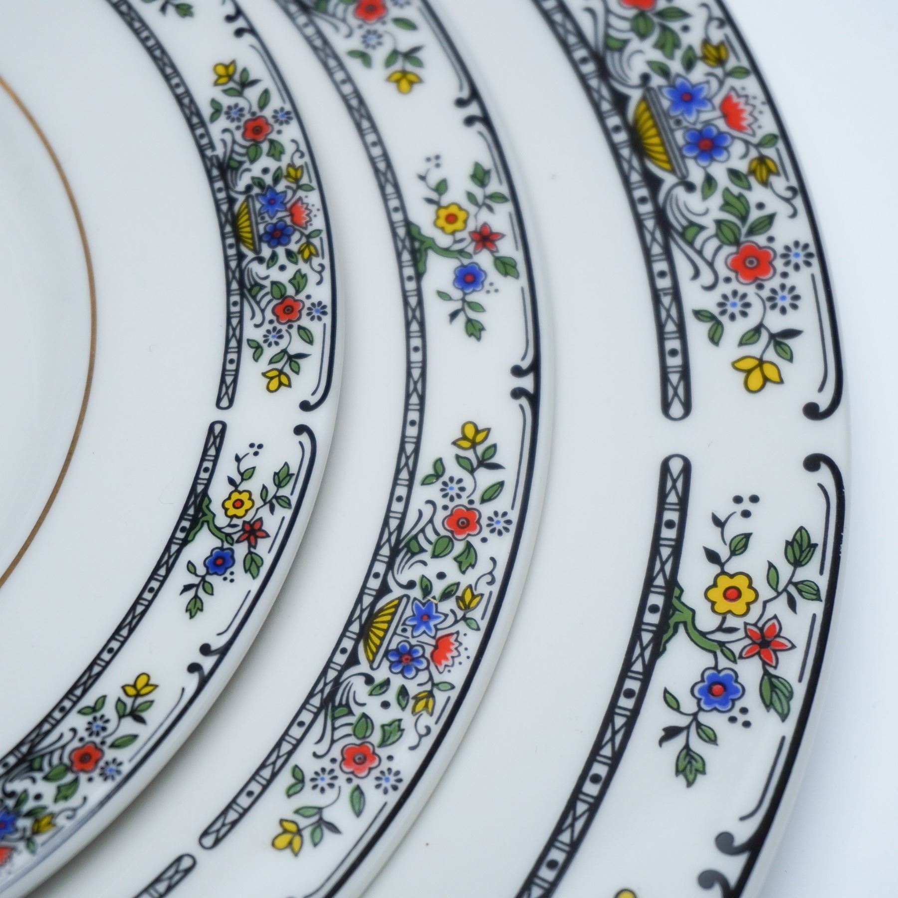 Royal Doulton fine china dinnerware set in the Tavistock pattern. This collection includes a dinner plate, a salad plate, and a bread and butter plate. The design features a central floral medallion surrounded by a decorative border of multicolored flowers, black scrollwork, and geometric elements. The backstamp identifies the pattern as Tavistock, produced by Royal Doulton. Dinner plate: 0.75"H x 10.75" dia. Salad plate: 0.5"H x 8" dia. Bread and butter plate: 0.5"H x 6.5" dia.