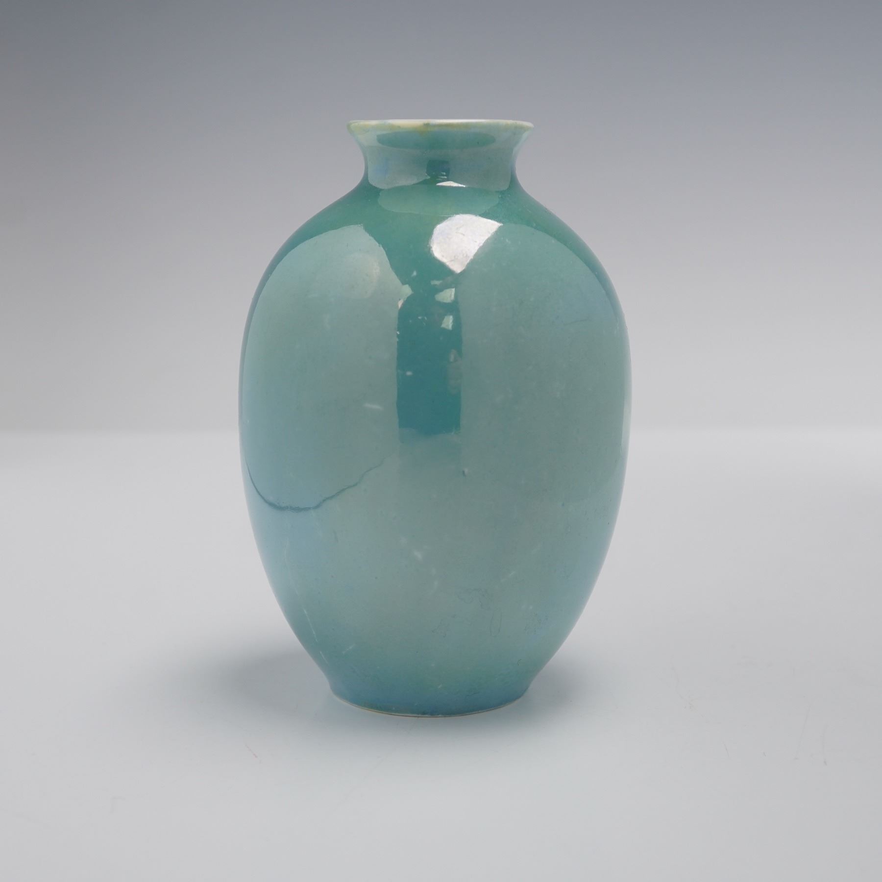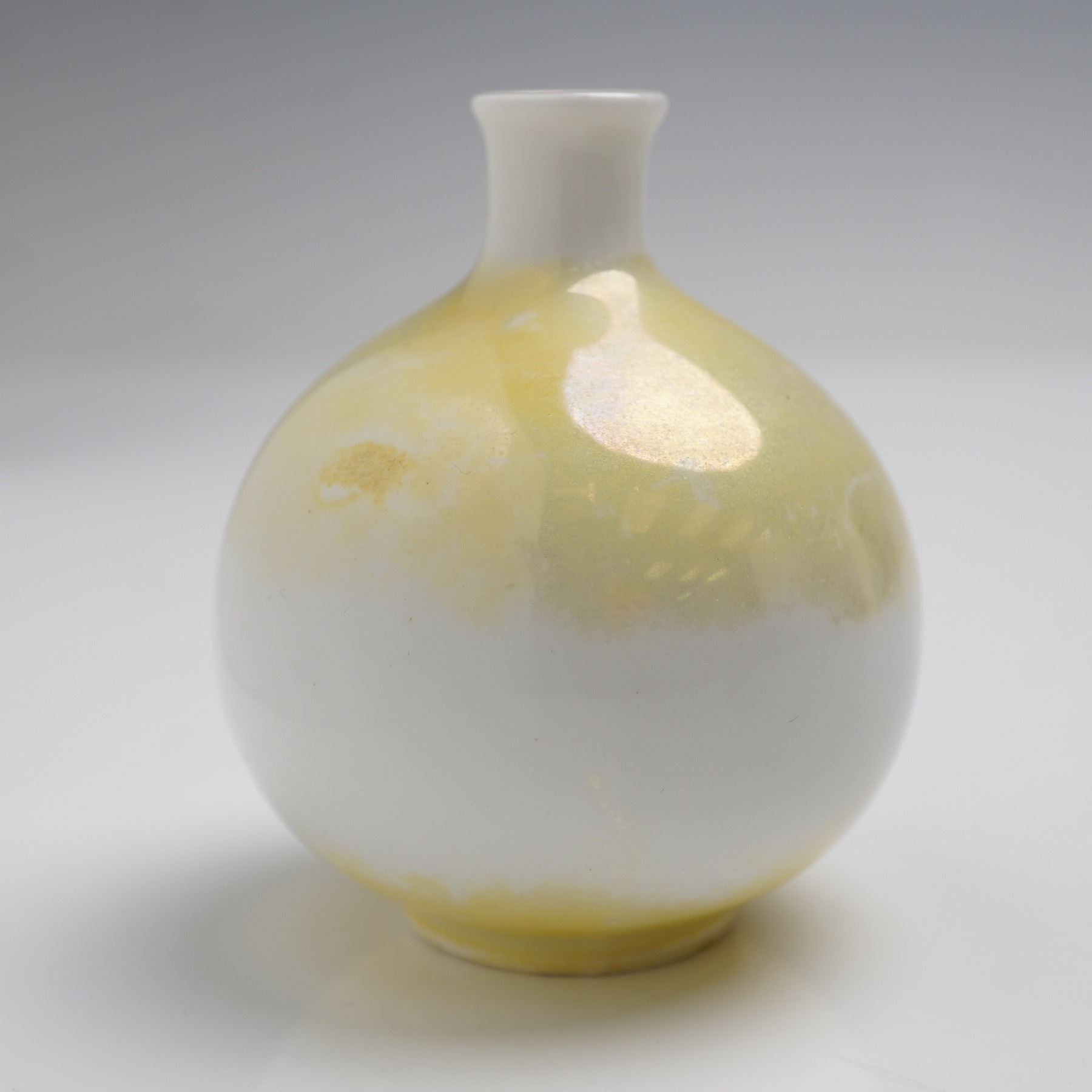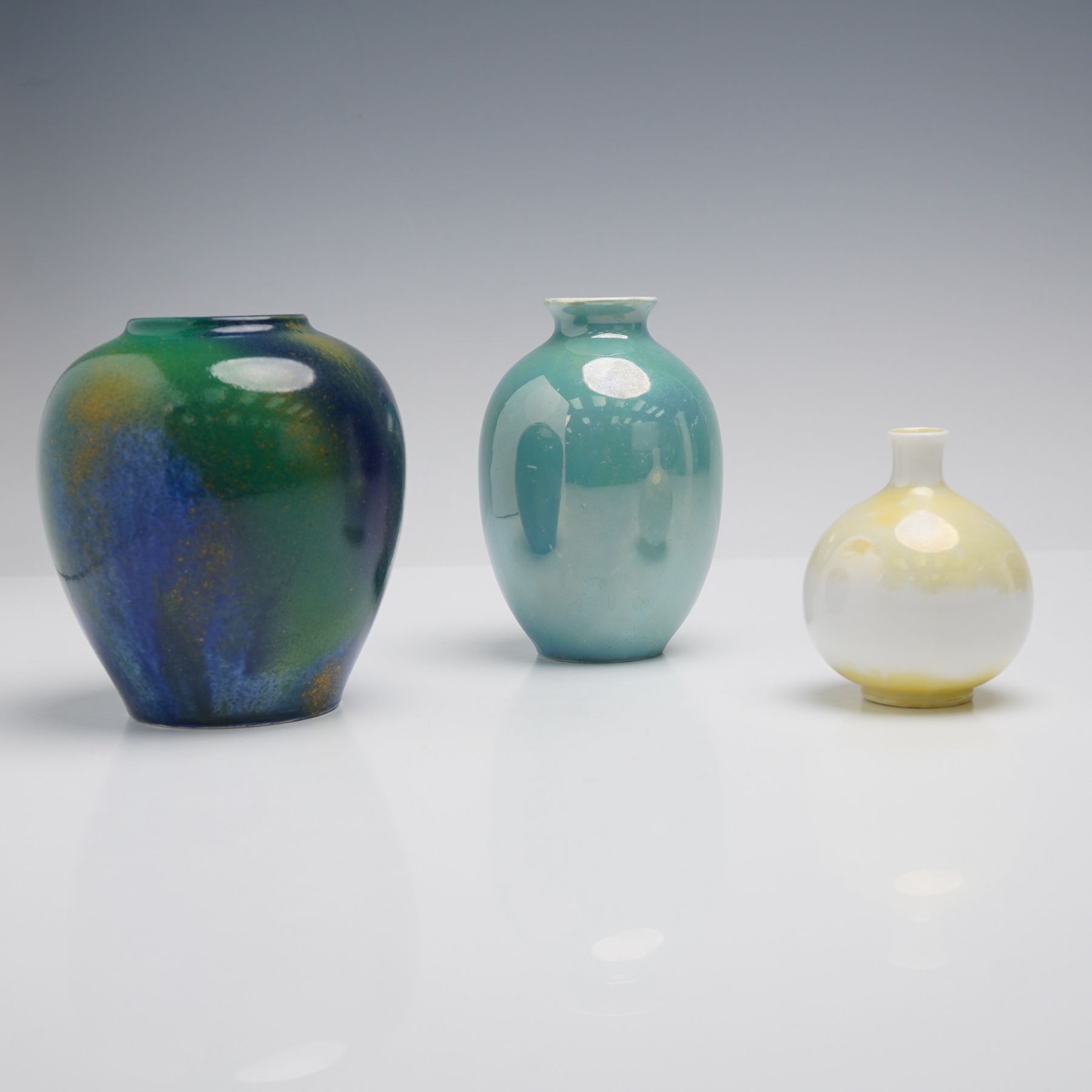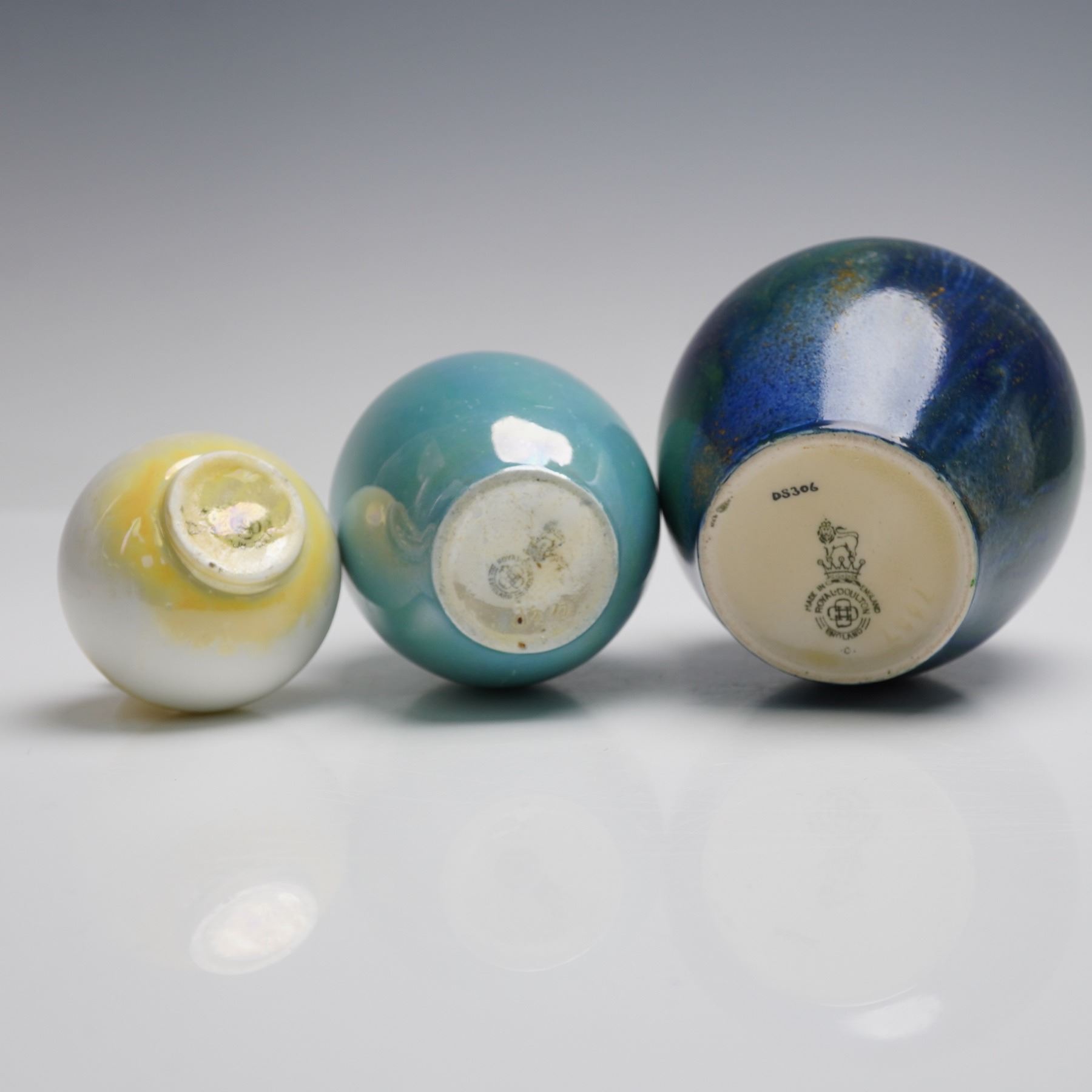 The collection features three distinct examples of Royal Doulton's lustre ware, each with unique glaze application. Included is a miniature vase with a rounded body, narrow neck, and white ground overlaid with a pale yellow iridescent sheen. Also present is a medium-sized vase with a slightly flared rim, decorated in a blue-green lustre glaze with subtle variations in tone and areas of yellow highlights. The third vase is of ovoid form with short neck, finished in a blue and green surface accented with yellow speckling throughout, underside marked DS306 along with the Royal Doulton crown and lion backstamp. All three pieces are Royal Doulton marked on the base.