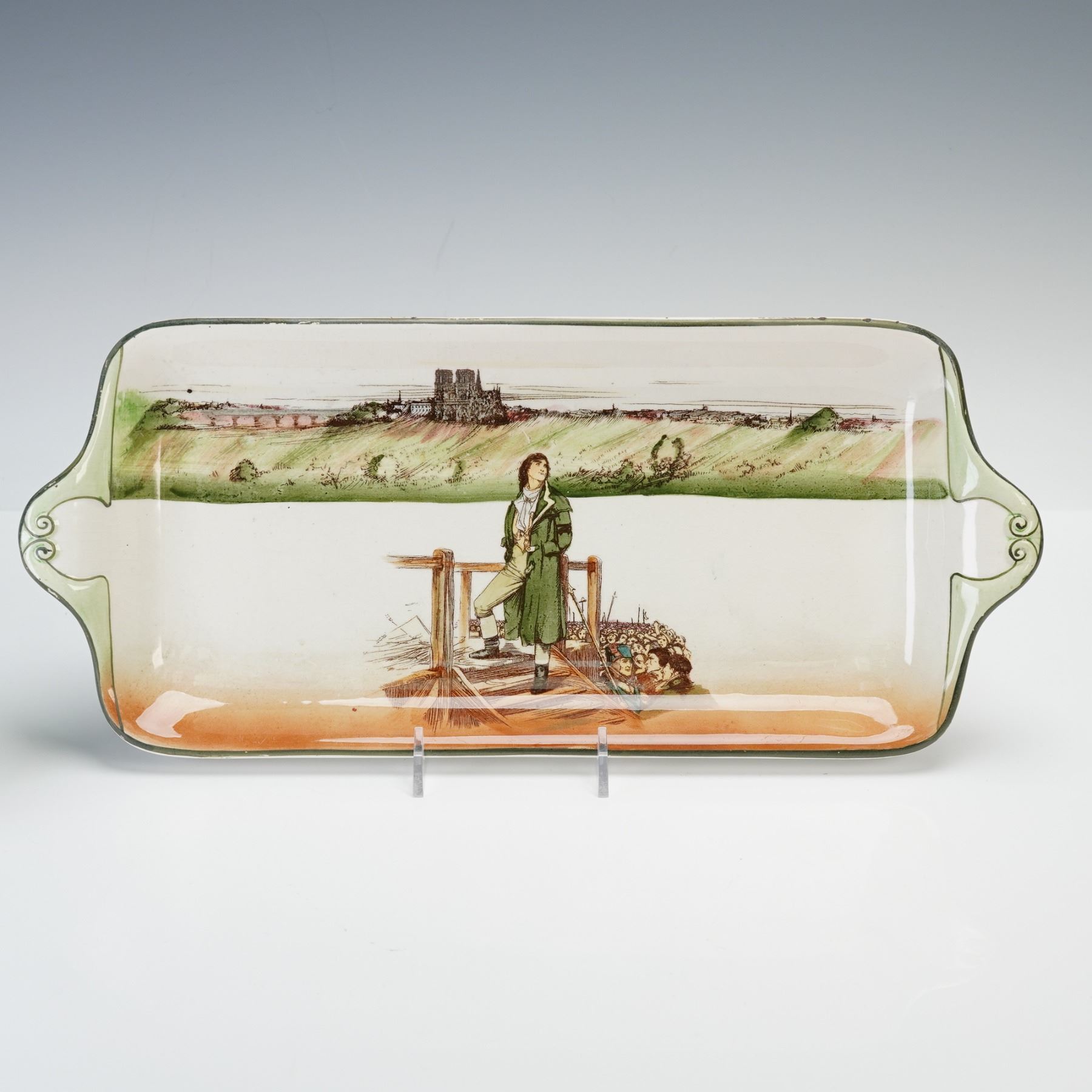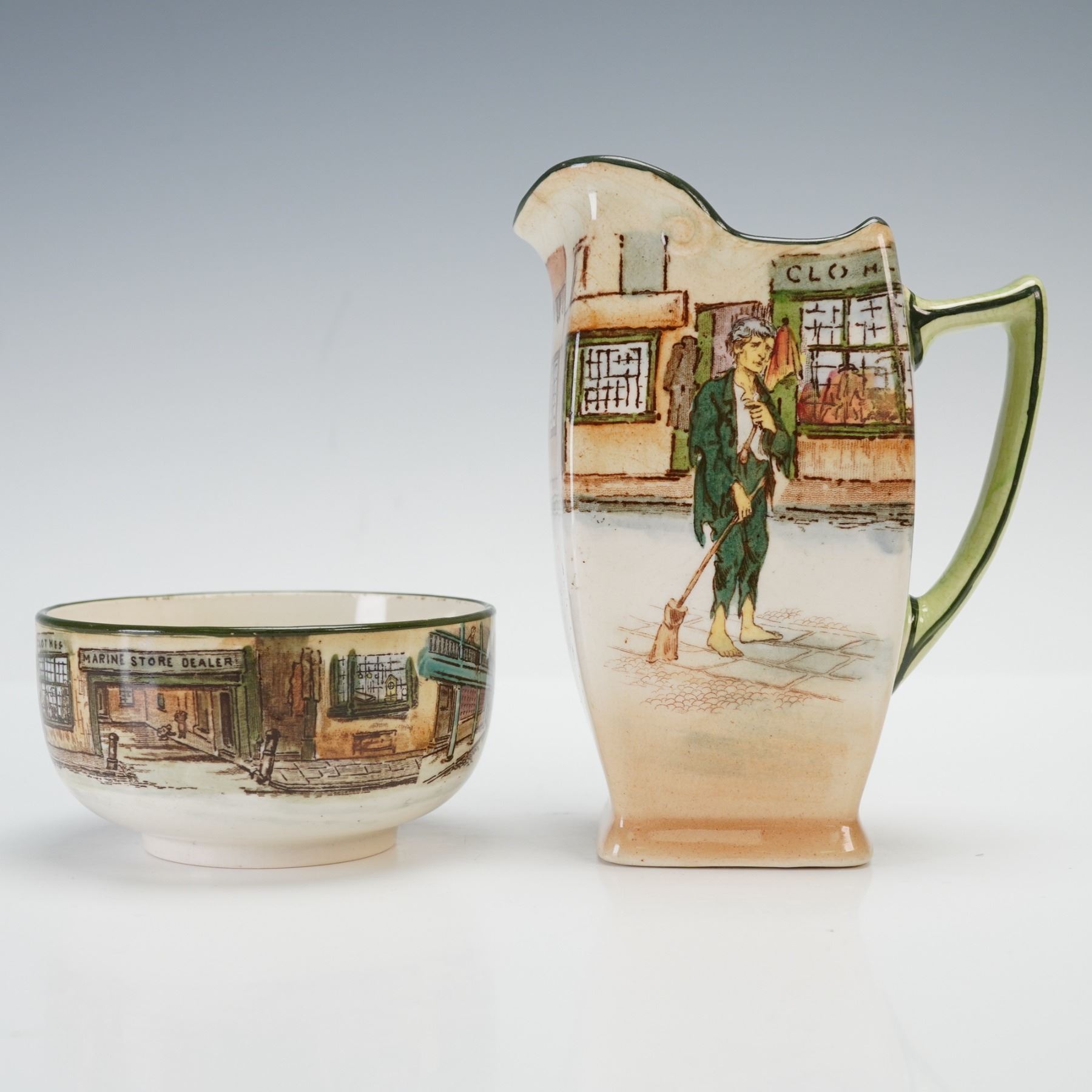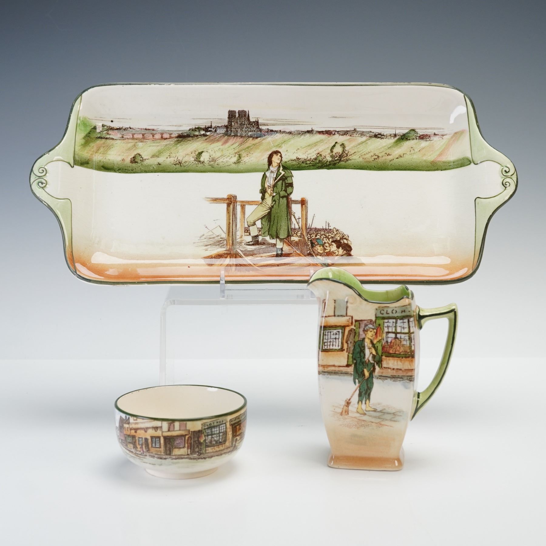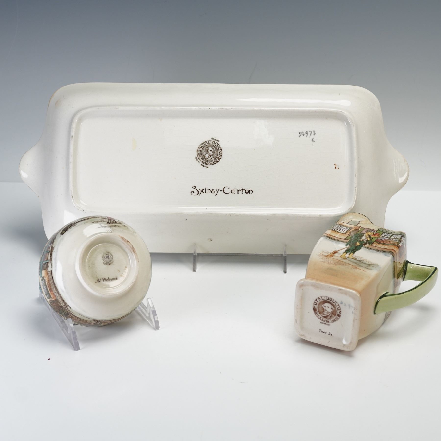 A three-piece Royal Doulton Dickens Ware Series A collection comprising a handled rectangular tray titled Sydney Carton, a jug titled Poor Jo, and a bowl titled Mr. Pickwick. Each piece features hand-colored scenes inspired by Charles Dickens novels, with the distinctive green and orange shading characteristic of early 20th century production. All are marked to the underside with the Royal Doulton backstamp and corresponding character titles.