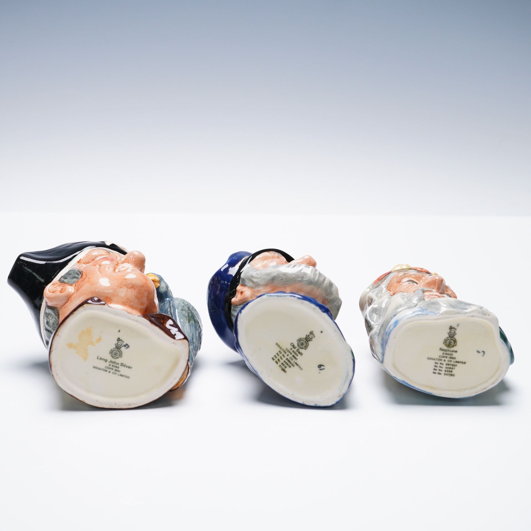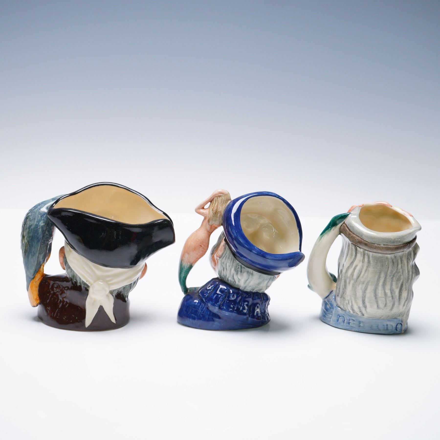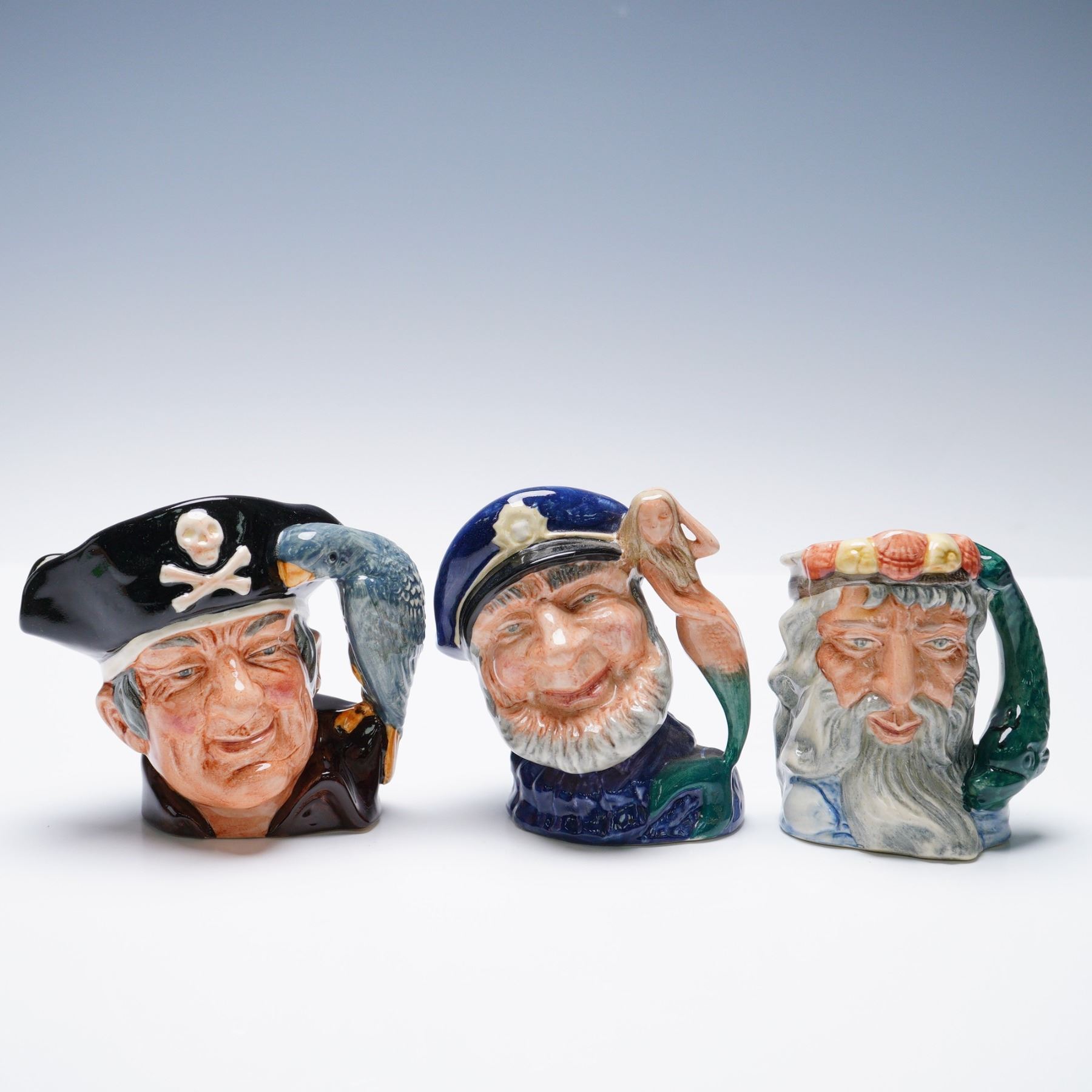 A group of three Royal Doulton small character jugs featuring nautical themes. Included are Long John Silver (D6386), depicting the infamous pirate with a parrot perched on his shoulder; Neptune (D6552), modeled as the mythological god of the sea with a dolphin handle; and Old Salt (D6554), representing a seasoned sailor with a mermaid forming the handle. Each jug is finely hand-painted in vivid colors and bears the Royal Doulton mark underside.