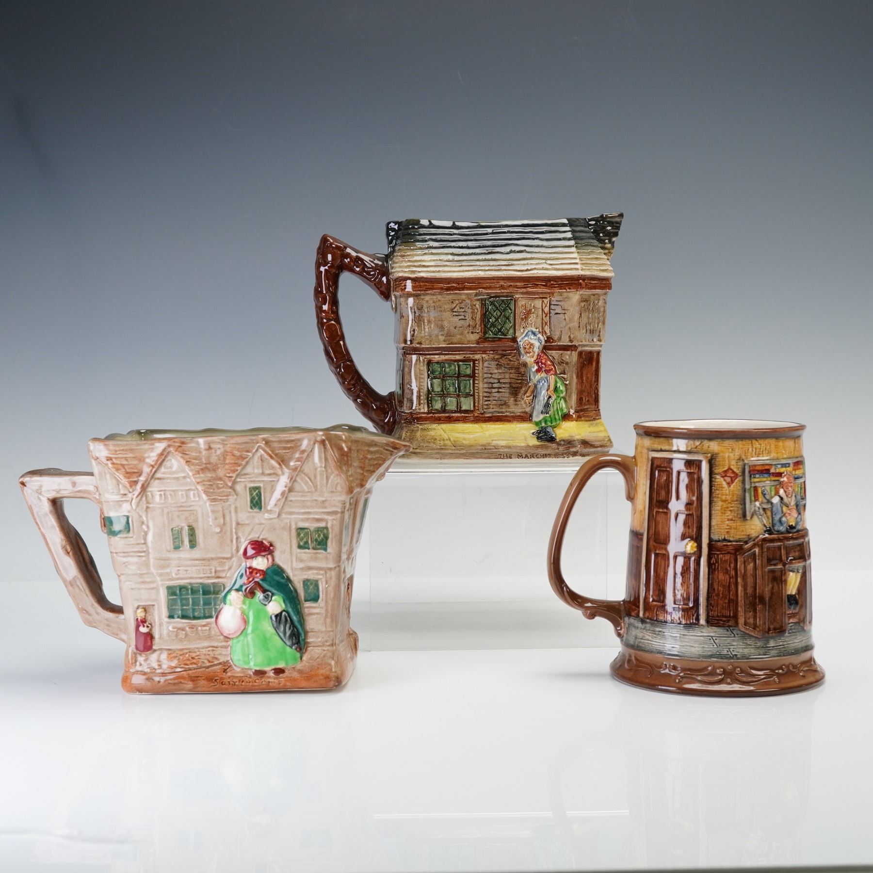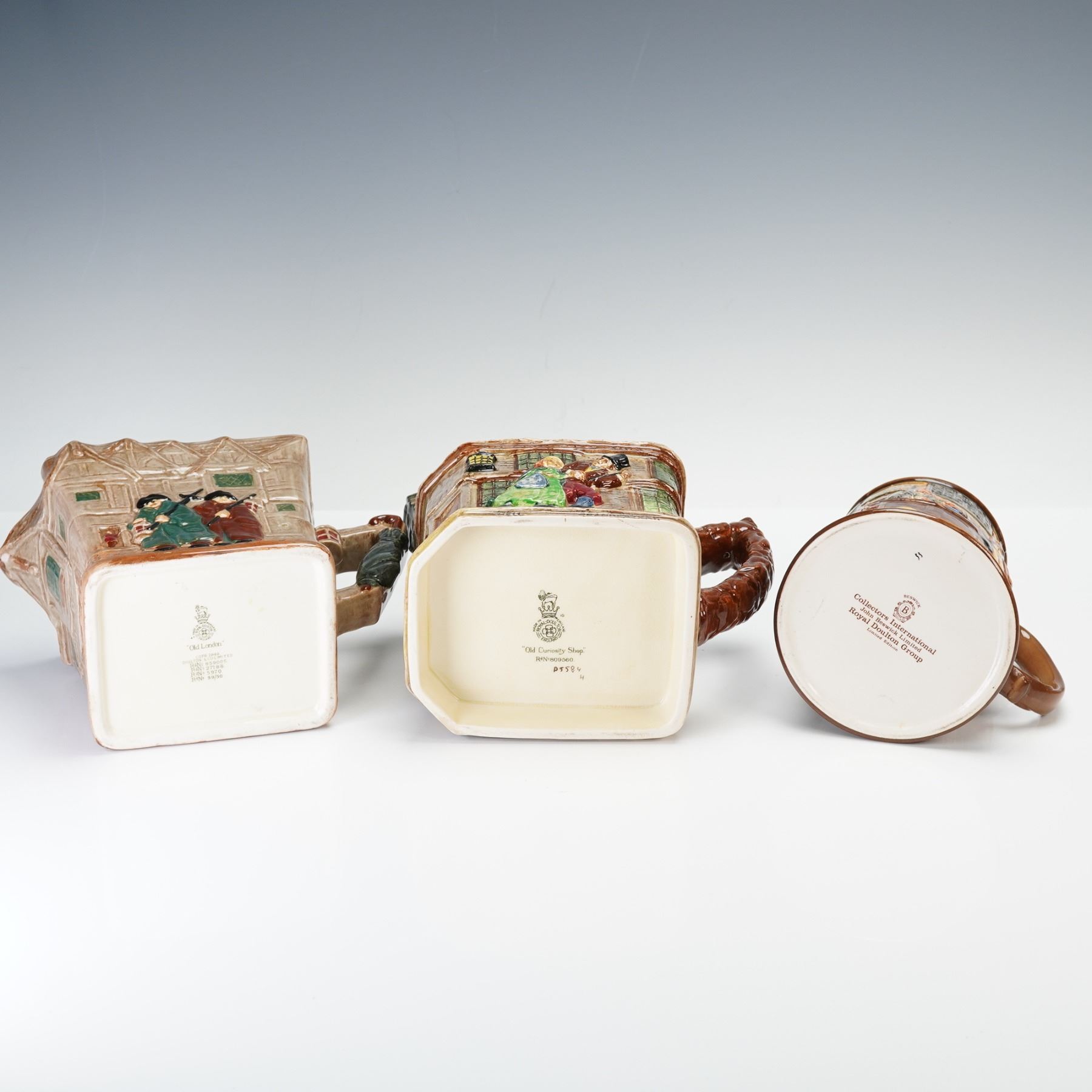 Three molded and hand-painted ceramic pieces featuring scenes inspired by Charles Dickens. Includes two Royal Doulton Dickens Ware pitchers, Old Curiosity Shop and Old London, both relief-molded with architectural street scenes, and one Beswick mug produced under the Royal Doulton Group with Collectors International John Beswick backstamp. Each piece displays figural detail and glazed coloration typical of mid-20th-century production. Backstamps read: Royal Doulton Old Curiosity Shop D5174, Royal Doulton Old London D4570, and Collectors International John Beswick Royal Doulton Group England.