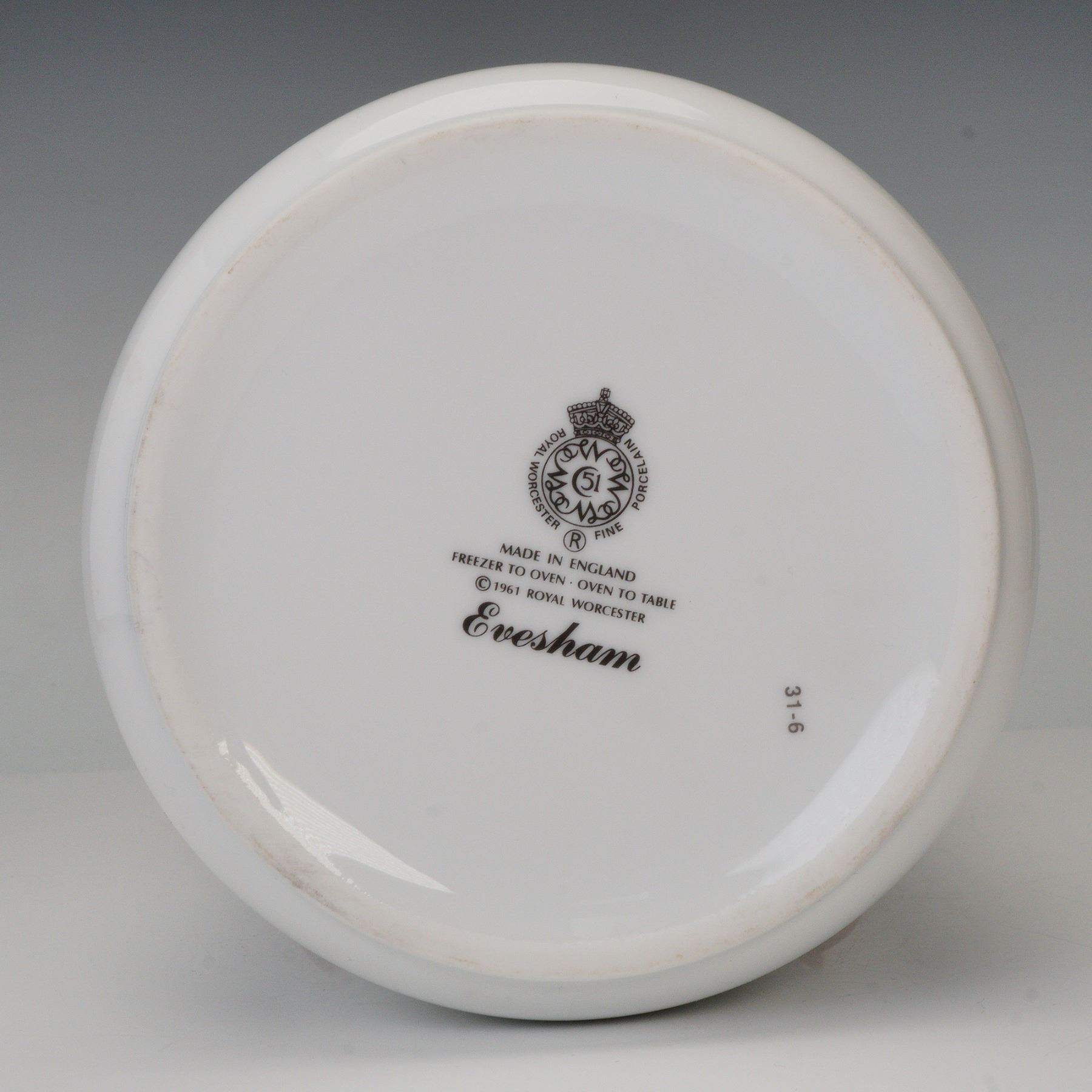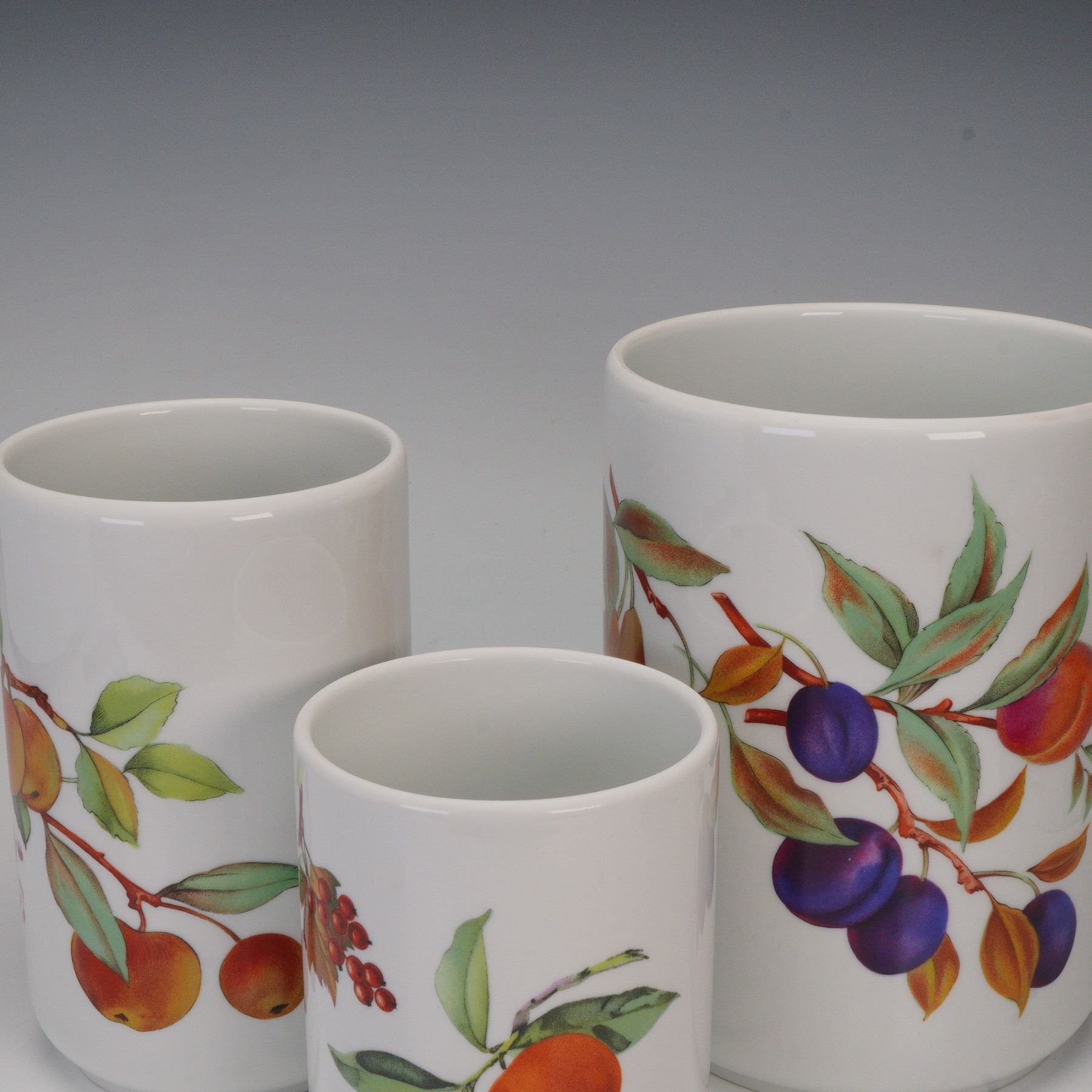 Fine porcelain canister set in the Evesham pattern, made in England. Each cylindrical jar is decorated with vibrant fruit and botanical motifs including plums, cherries, and apples, accented with rich green leaves on a white ground. The canisters feature fitted turned wood lids and are marked "Freezer to Oven Oven to Table." Designed in 1961, the Evesham pattern remains one of Royal Worcester's most iconic mid-century collections, combining utility with classic English charm.