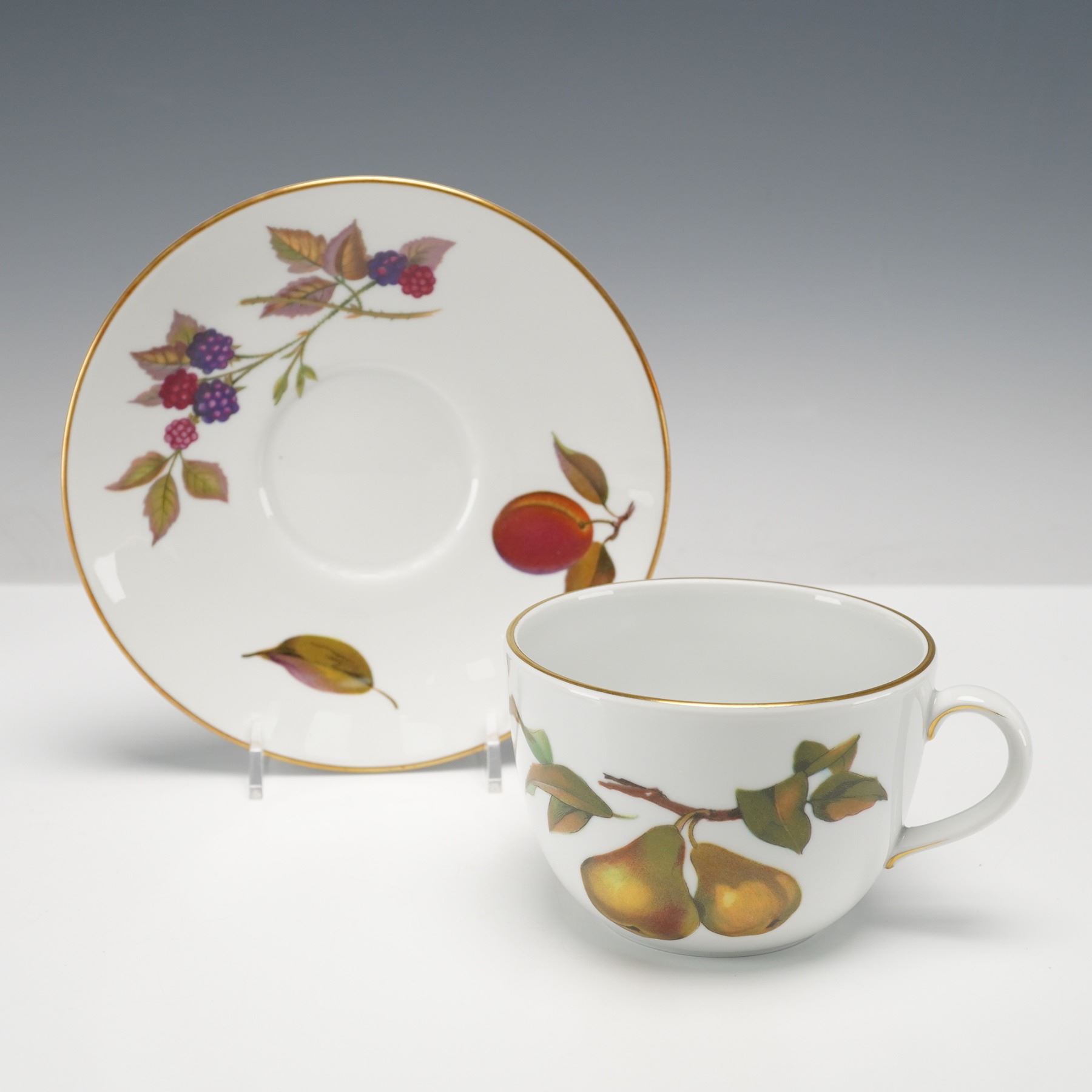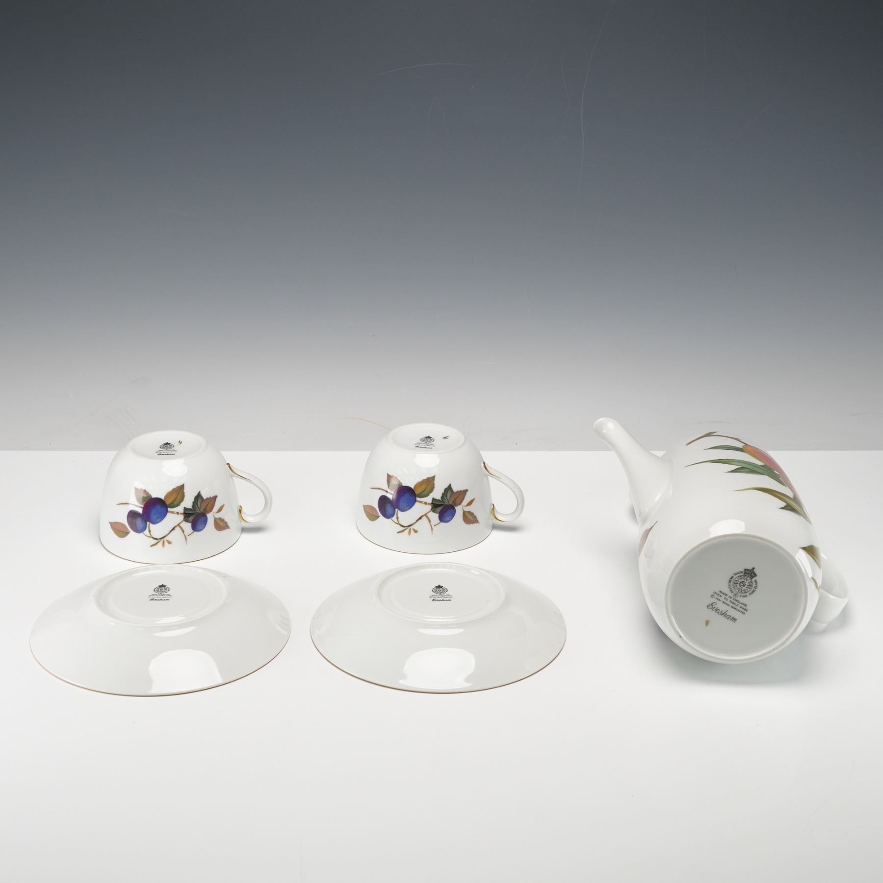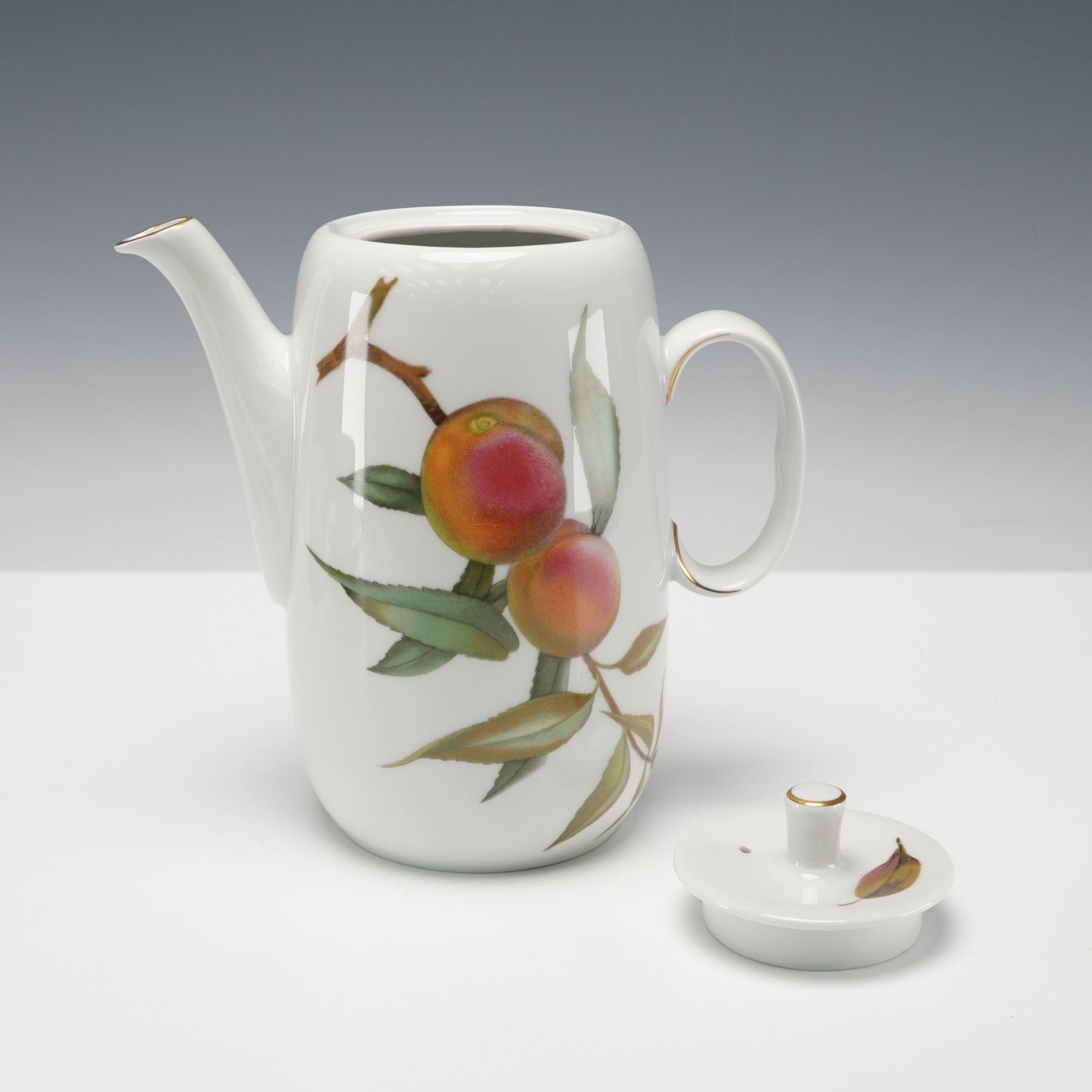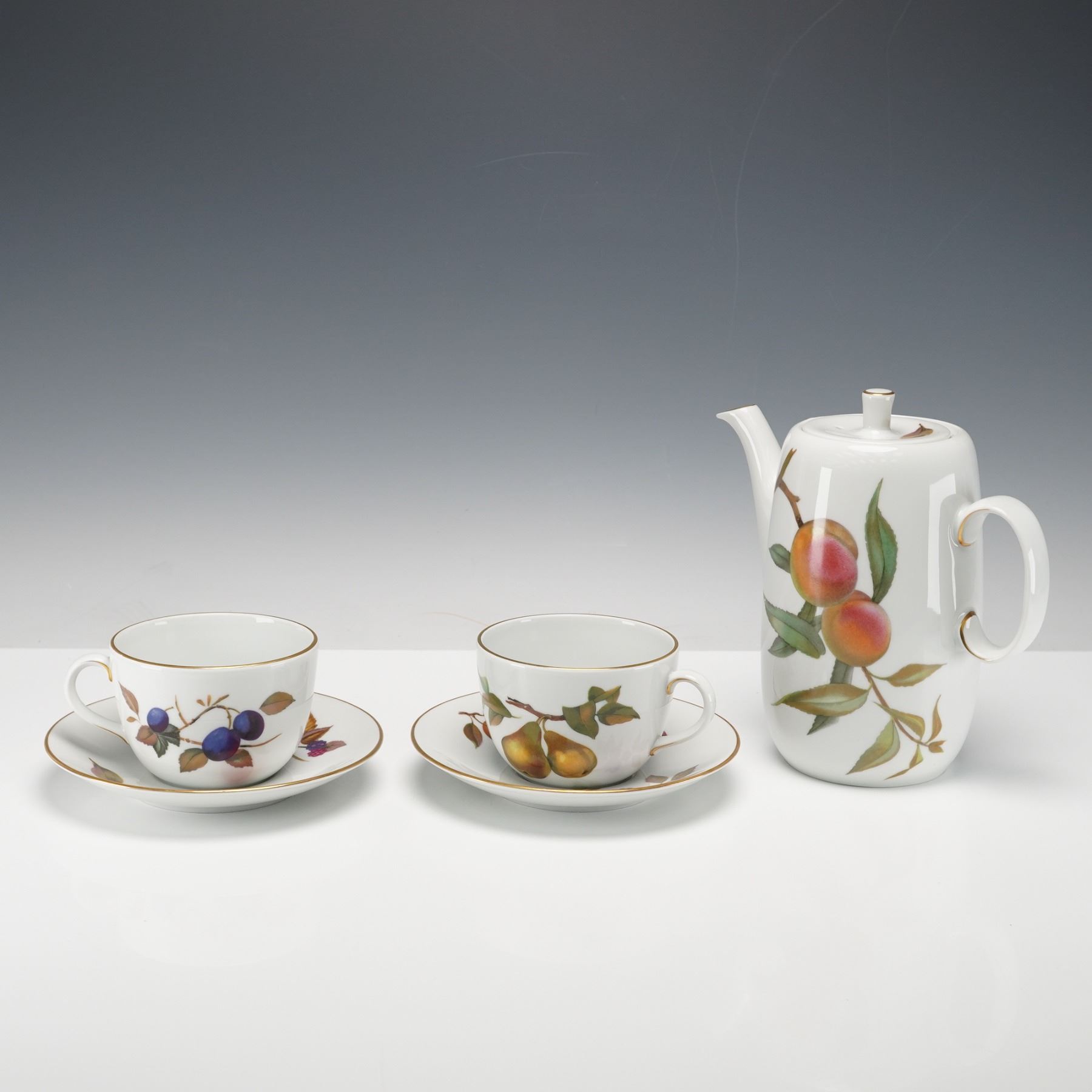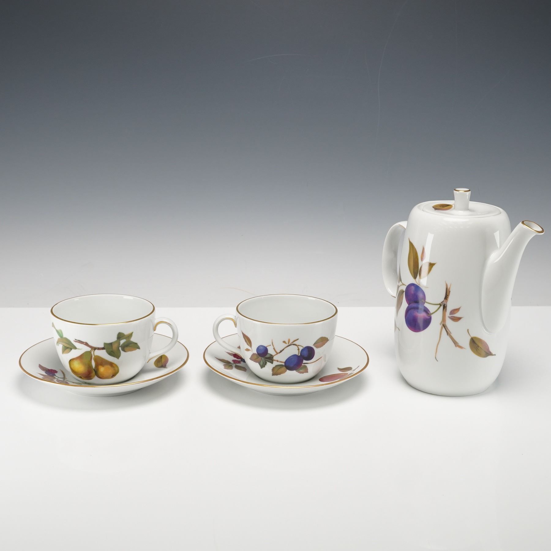 A three-piece set totaling six items, comprising two breakfast cup and saucer sets and one coffee pot with lid. Each piece decorated with fruit still-life motifs in natural tones on a white ground with gold-toned trim. All items bear the Royal Worcester Fine Porcelain Evesham backstamp.