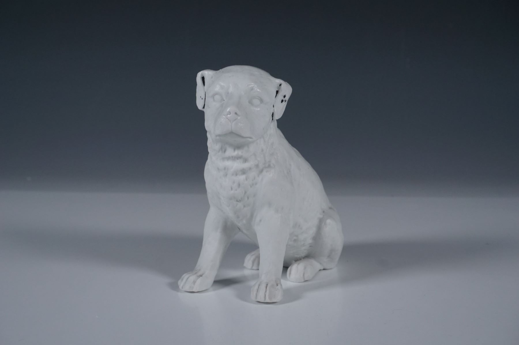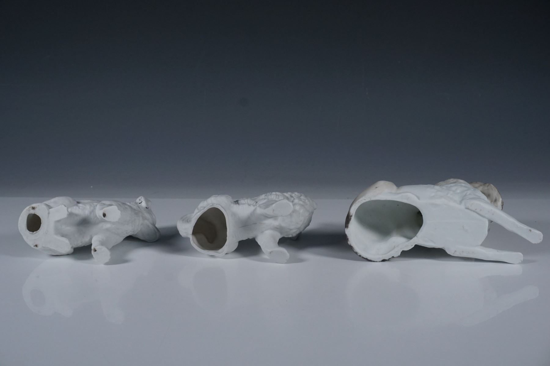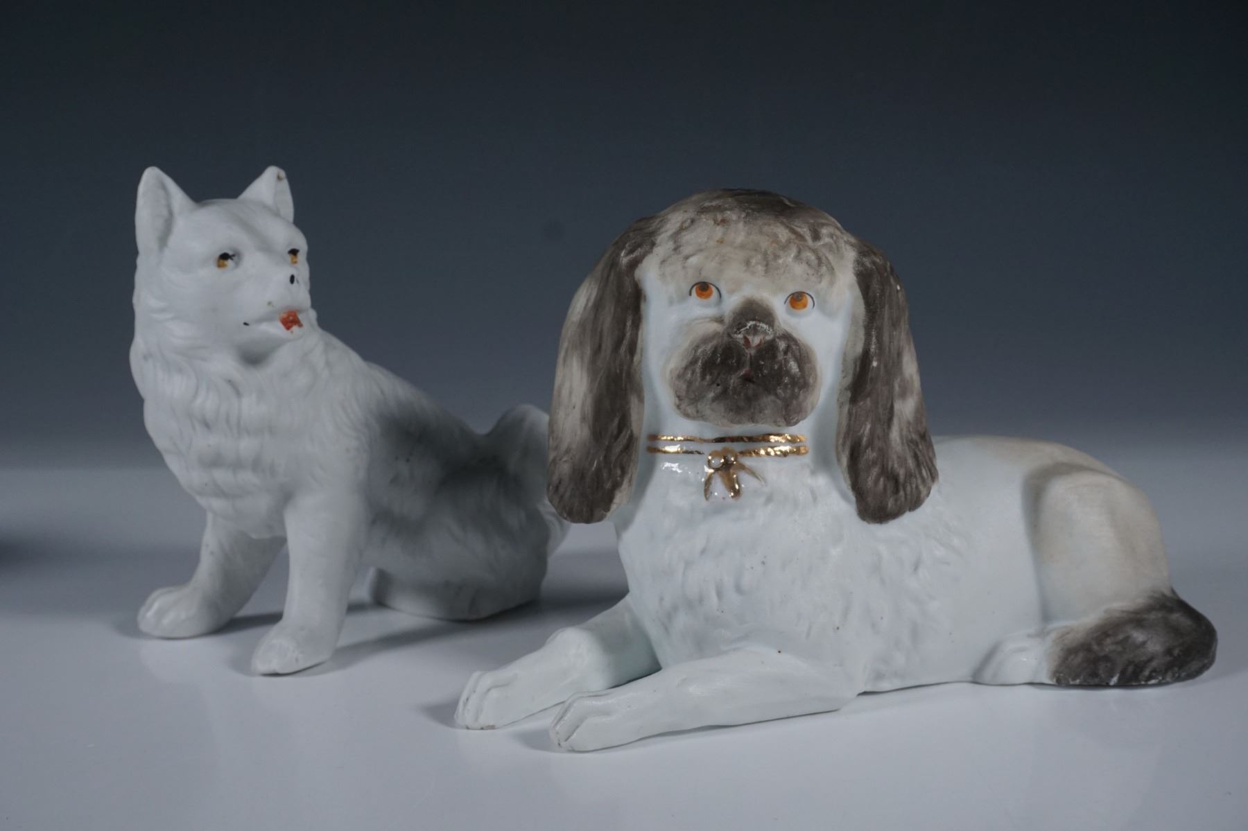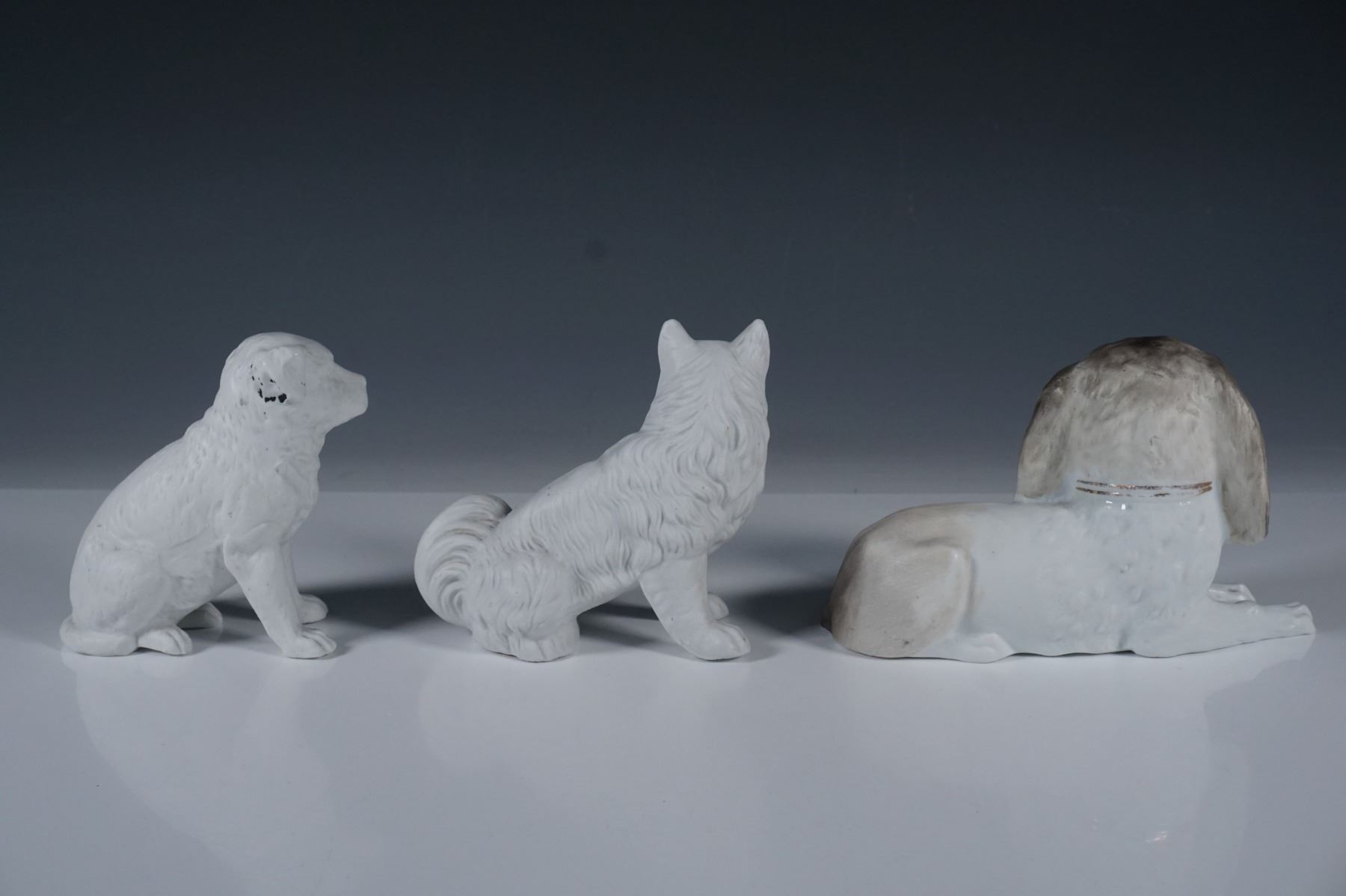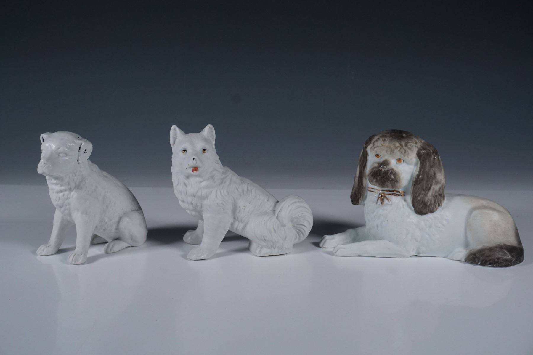 A set of three porcelain dog figurines, each uniquely crafted with fine detailing and hand-painted accents. The set includes a seated dog with black and gold highlights, a fluffy-tailed canine with subtle facial features, and a reclining dog adorned with a gilded collar. The figures showcase intricate sculpting, characteristic of antique or vintage European porcelain craftsmanship.