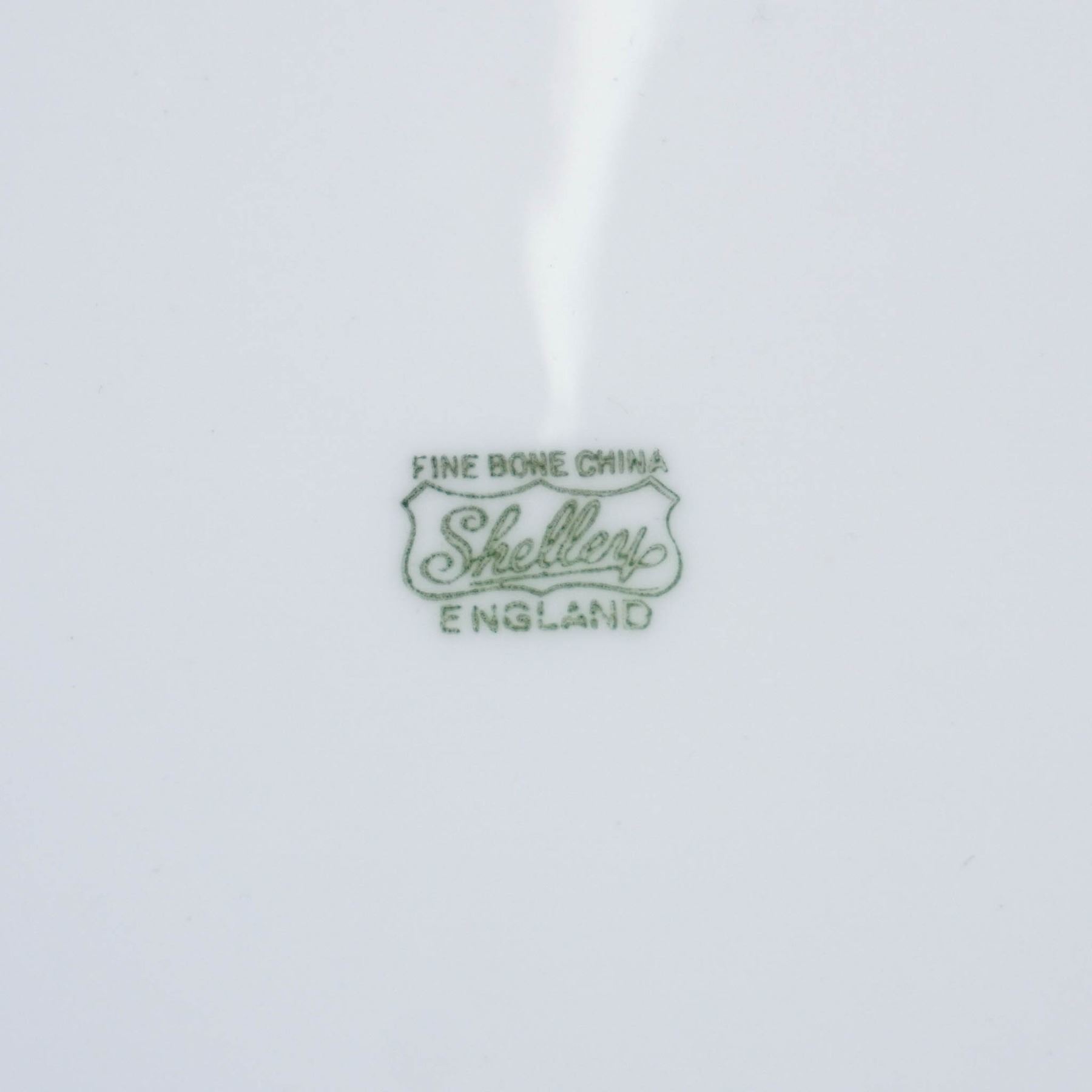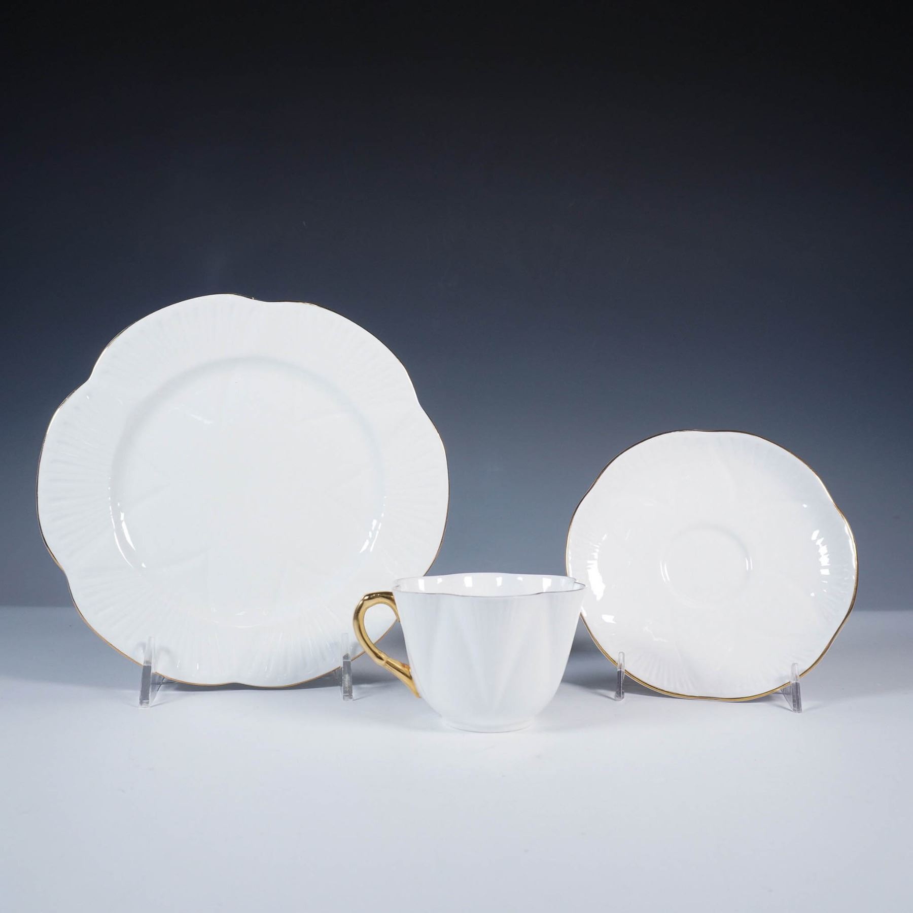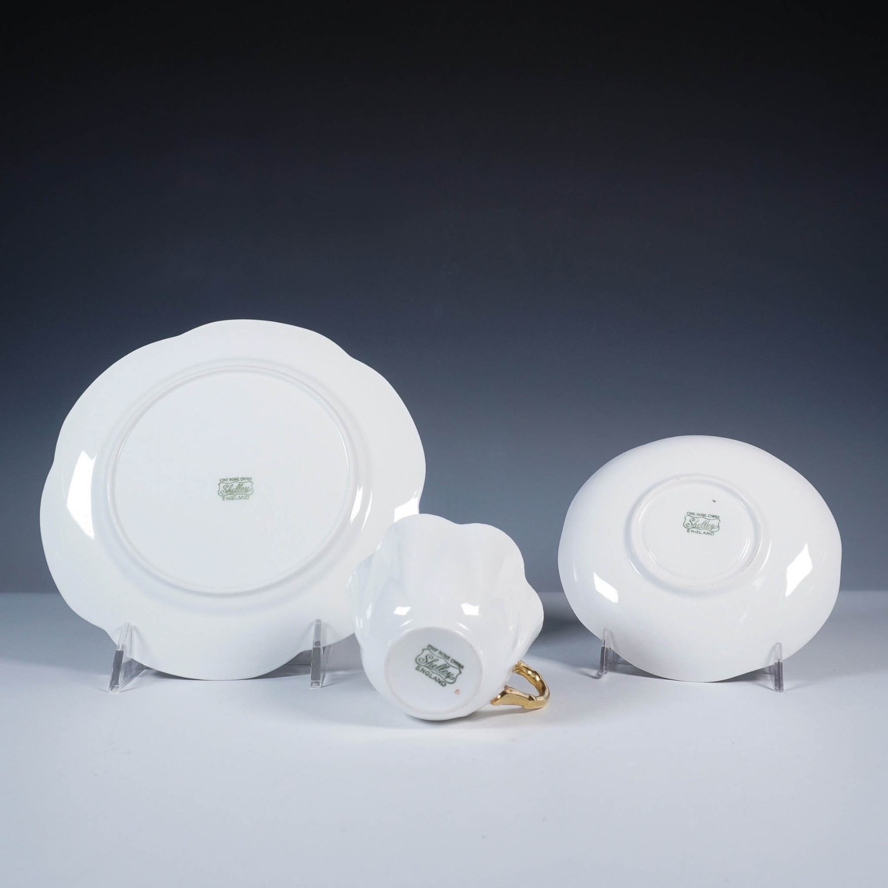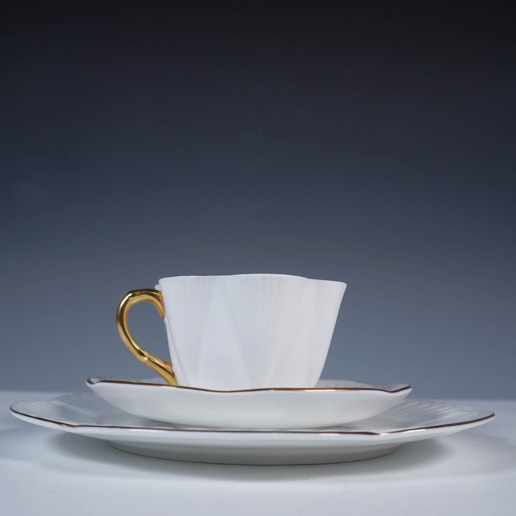 Shelley fine bone china tea trio in the elegant Regency pattern, featuring a crisp white glaze with rich gold trim. The set includes a scalloped-edge luncheon plate, matching saucer, and a teacup with a striking gold handle. The body showcases subtle ribbing that enhances the classic design. Each piece bears the Shelley England fine bone china backstamp. Approximate measurements are: teacup 2.5"H, saucer 5.75"Dia, and plate just over 8"Dia. A timeless and refined Shelley set ideal for collectors and formal tea service.