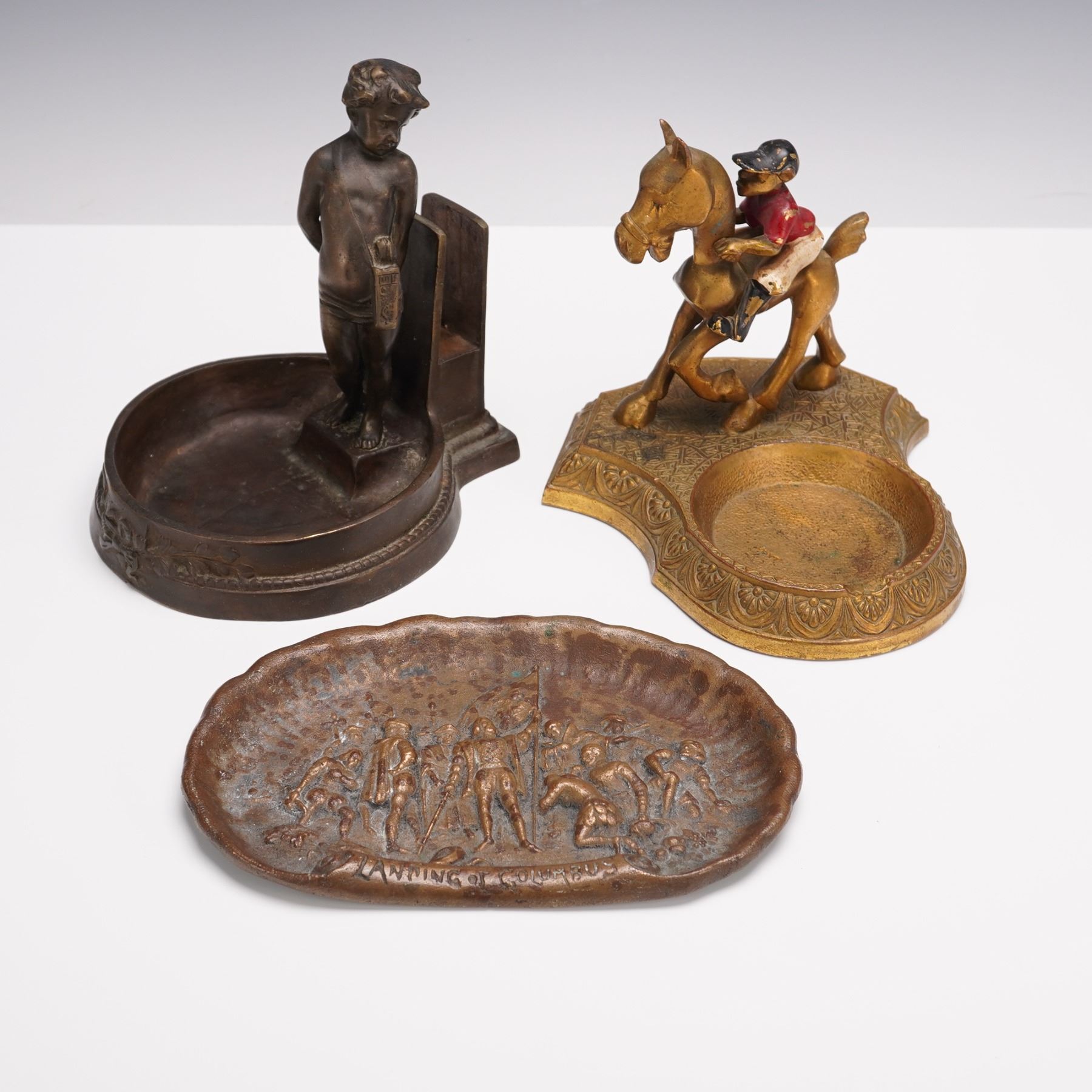 A three-piece assortment of metal collectibles. Includes a c. 1890 solid brass relief plaque tray of Landing of Columbus, a bronze polo player ashtray, and a bronze letter opener after Peter Tereszuzuk. Each piece is crafted in heavy cast metal with distinctive motifs and decorative embellishments. Bronze letter holder marked "A Peter Tereszuzuk".