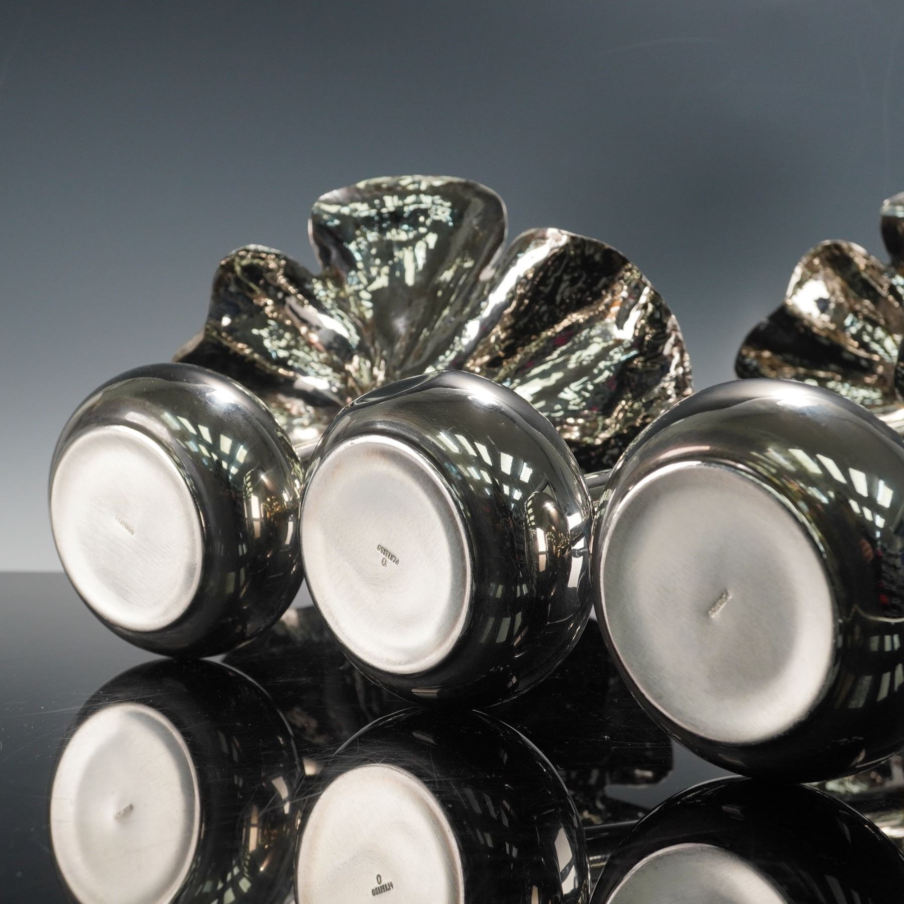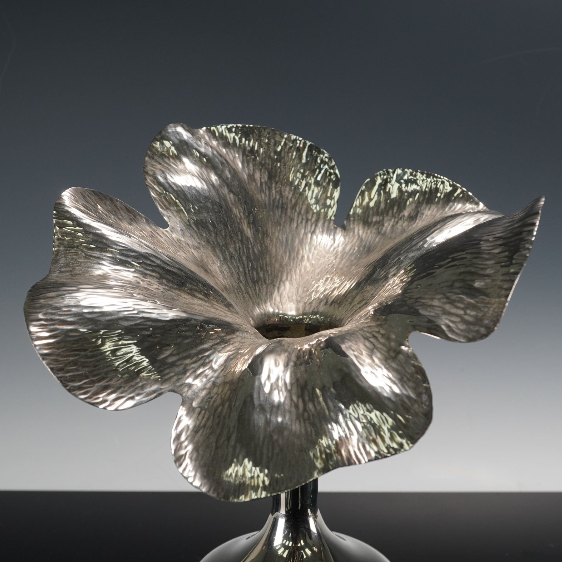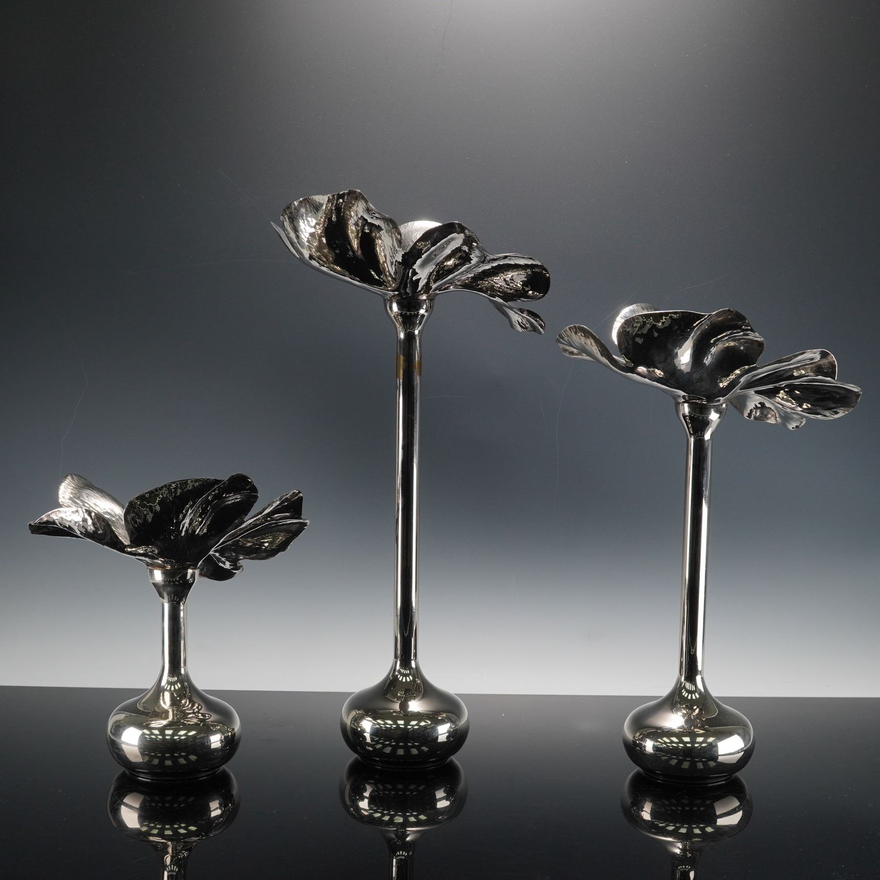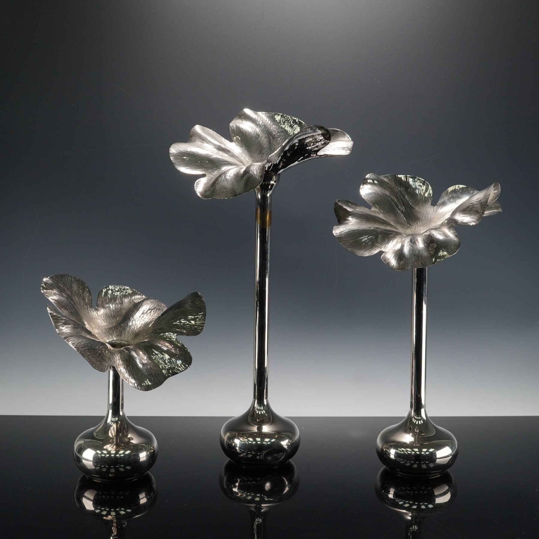 Three Spanish silver plated vases, each formed with a tall slender stem rising from a rounded weighted base and topped with a sculptural flower head featuring broad textured petals, the trio presenting slight variations in height and blossom profile. Inspired by Marilena Mariotto original design.