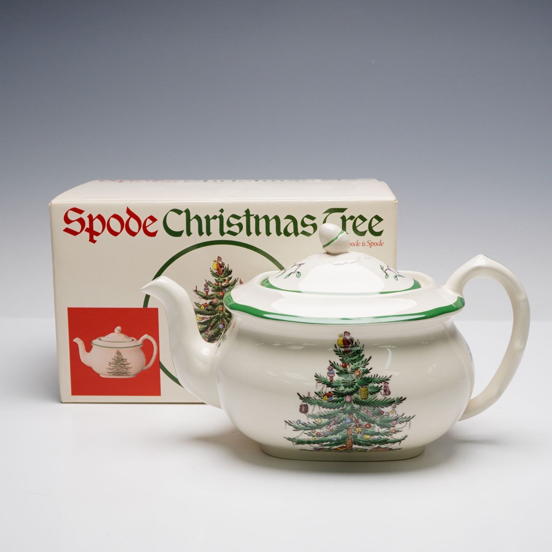 A 3-piece tea service featuring a teapot with lid, creamer, and covered sugar bowl. Each piece is crafted from fine earthenware and decorated with Spode's classic Christmas Tree motif, first introduced in 1938. Both the teapot and sugar bowl include matching fitted lids with finial handles. The teapot is accompanied by its original box, while the creamer and sugar bowl are presented without boxes. All items bear the Spode backstamp beneath.