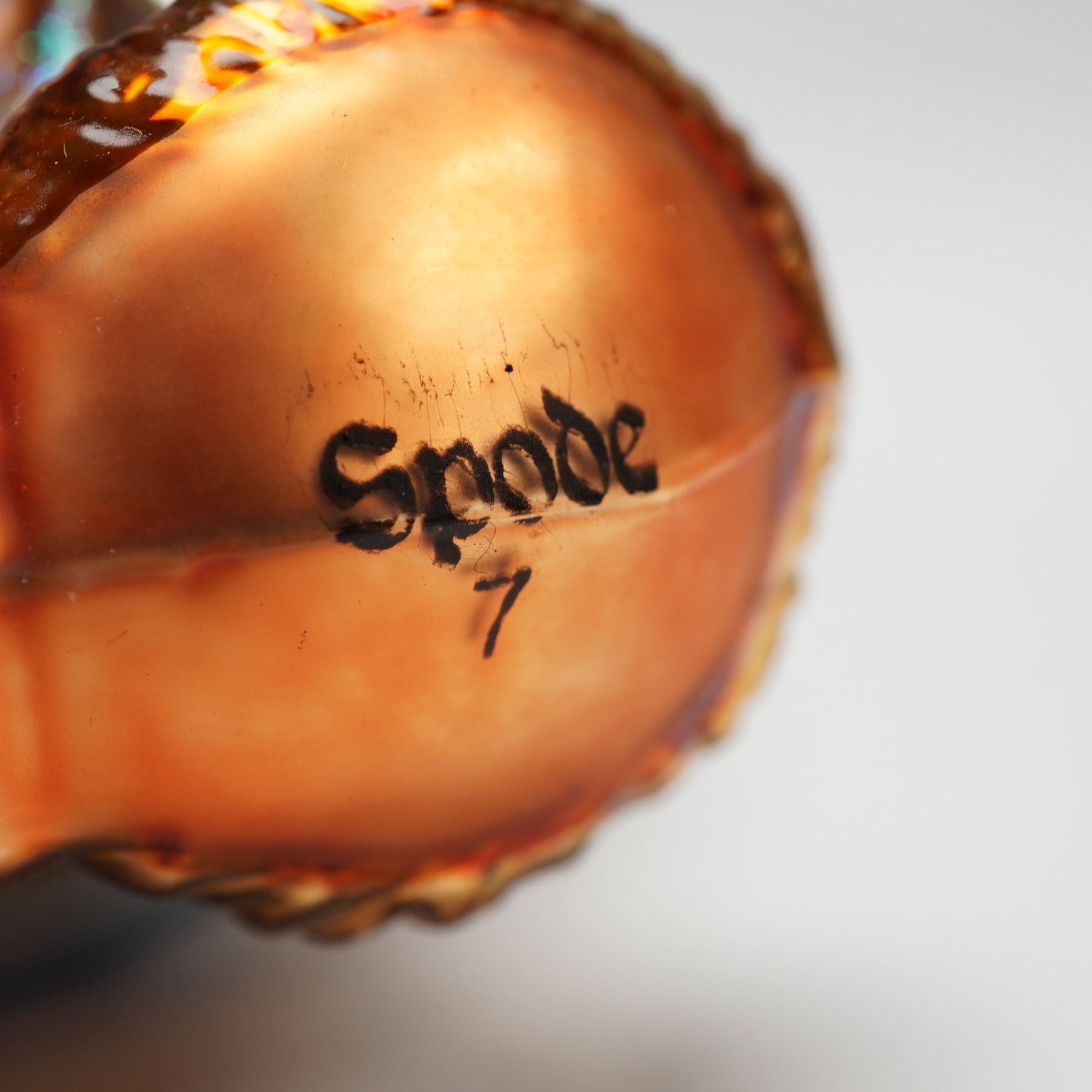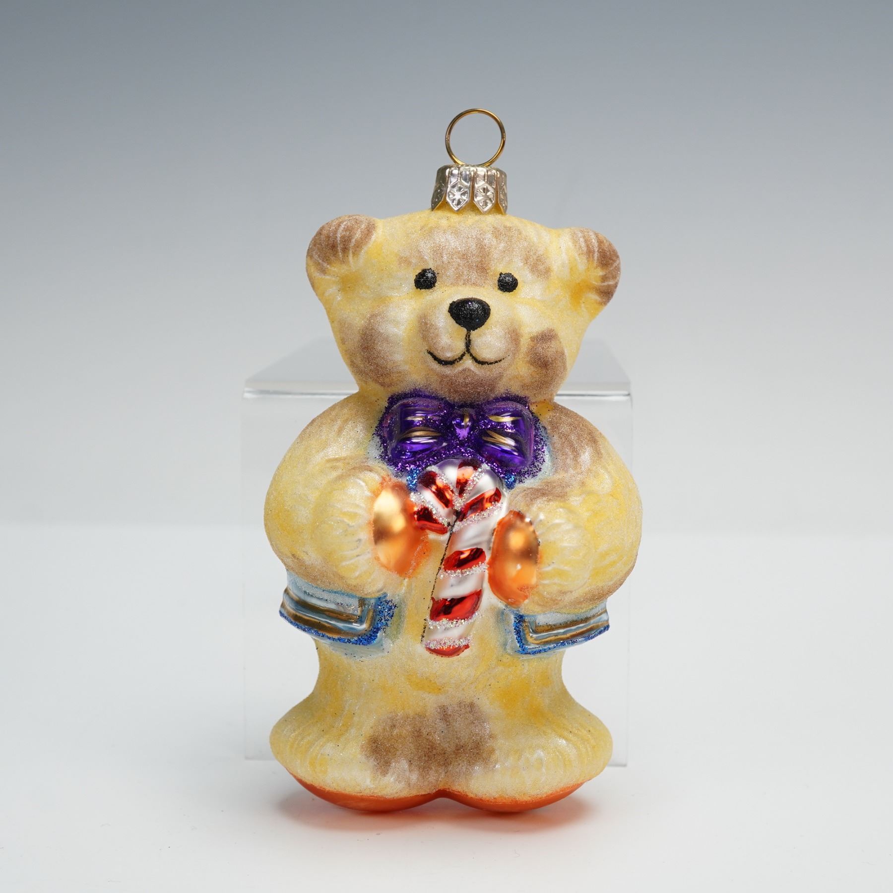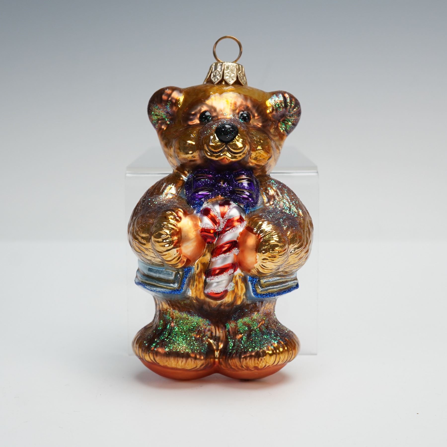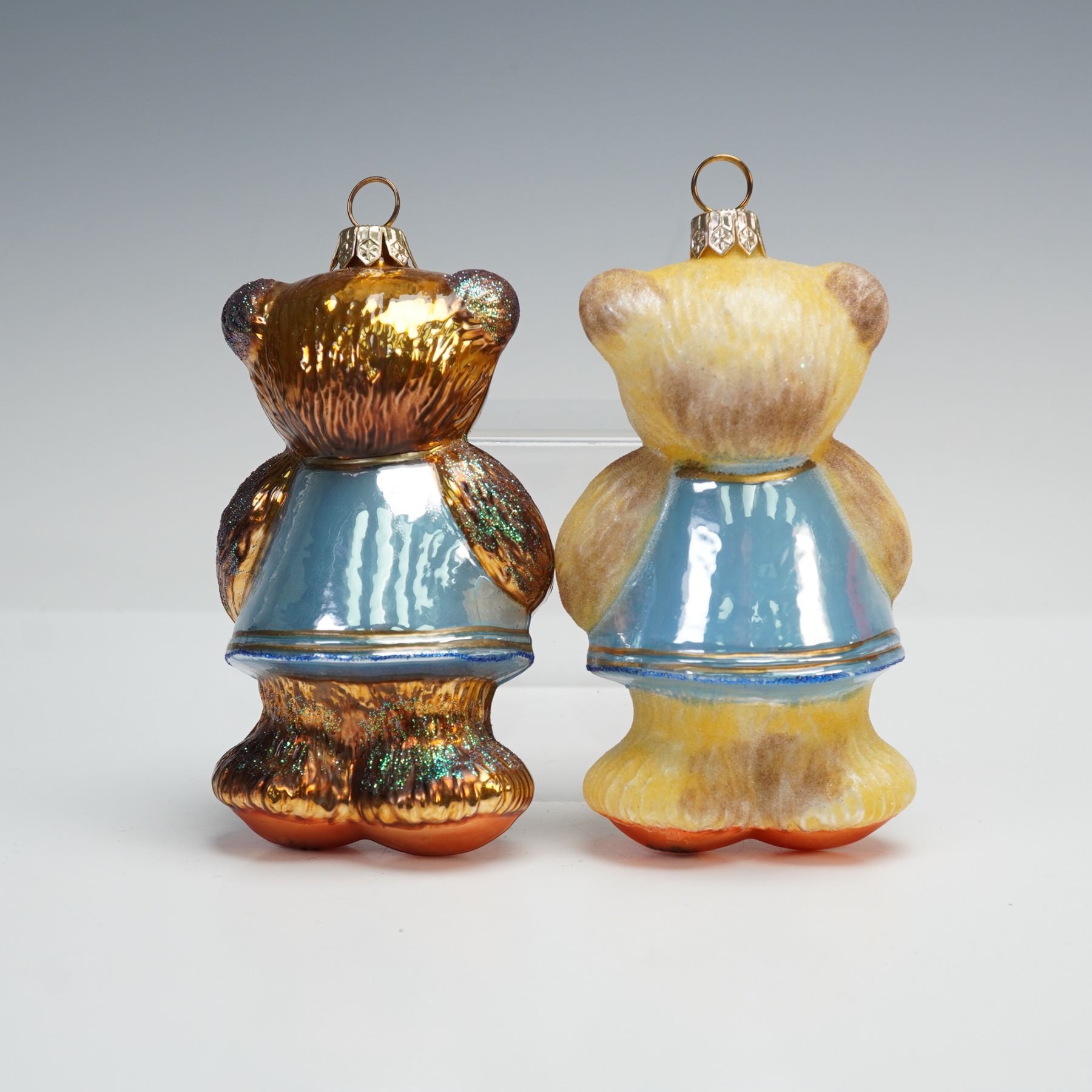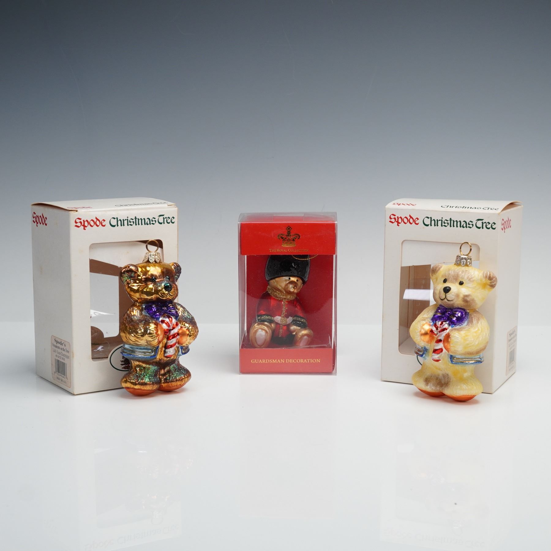 Charming trio of collectible glass ornaments including two hand-painted Spode Christmas Tree teddy bear ornaments and one Guardsman Decoration from The Royal Collection. The Spode bears each hold a candy cane and wear glittering coats accented with iridescent detailing, marked Spode to base and housed in original boxes. The Royal Collection ornament depicts a teddy bear in a red guard's uniform with a tall black hat, presented in its original red box. These finely crafted ornaments combine classic British charm with festive holiday appeal..