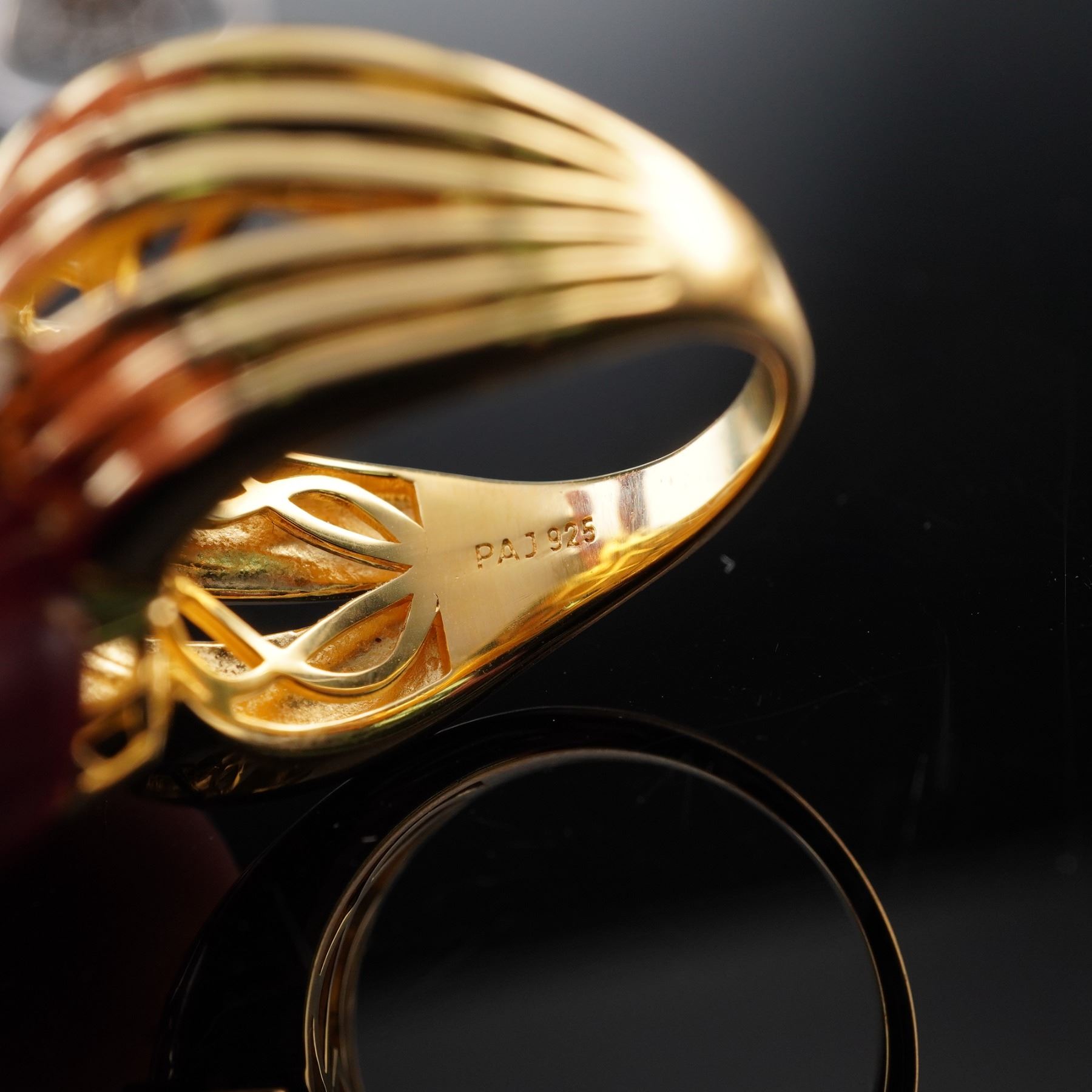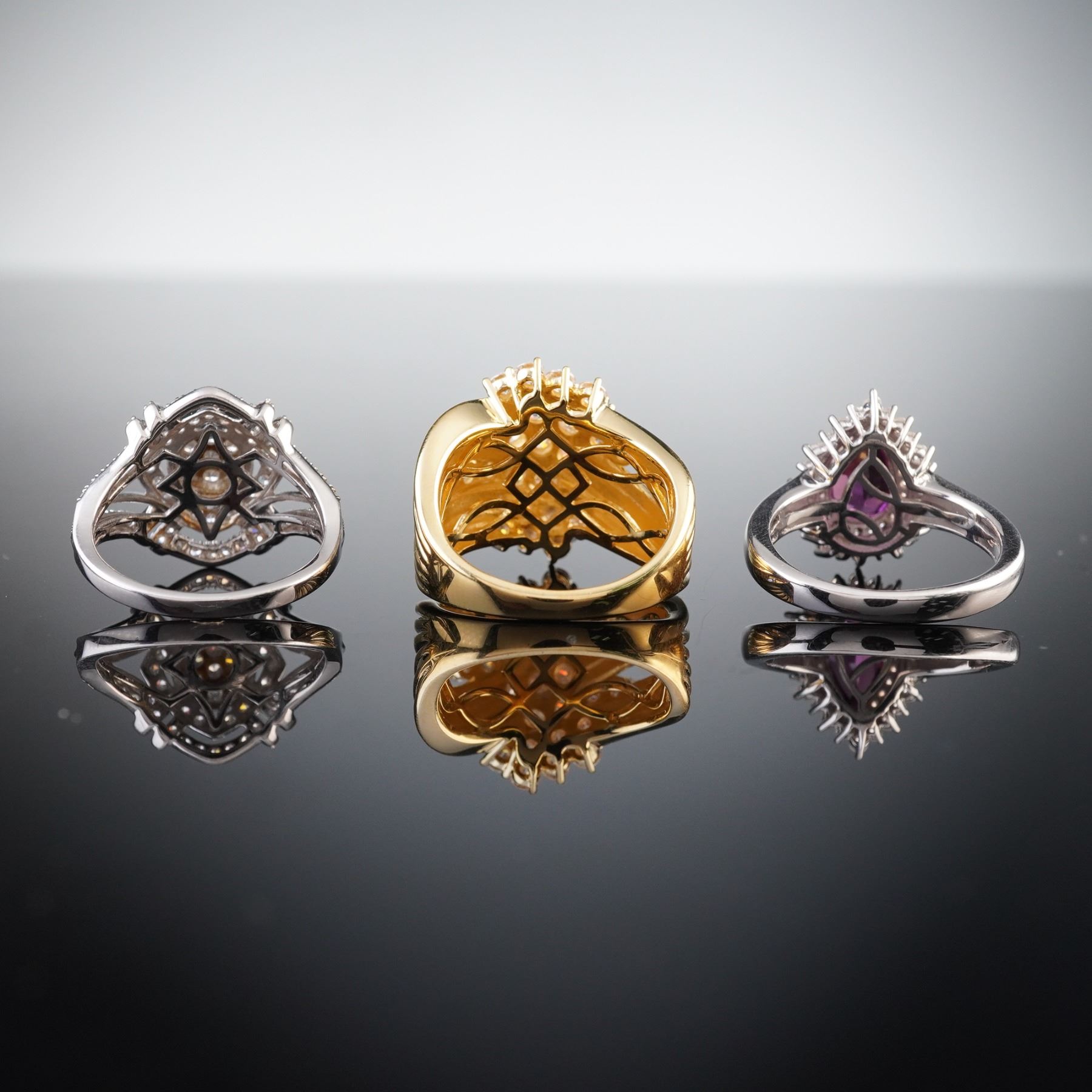 This set features three highly detailed cocktail rings, all marked 925. The designs combine intricate metalwork, with one ring boasting stones for added sparkle. Total weight with stones 23 g.