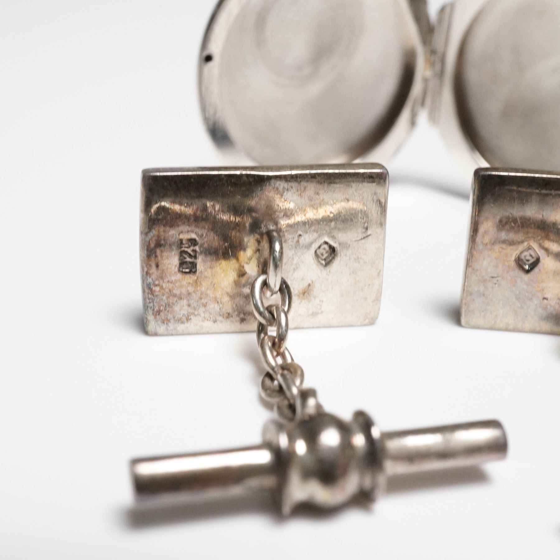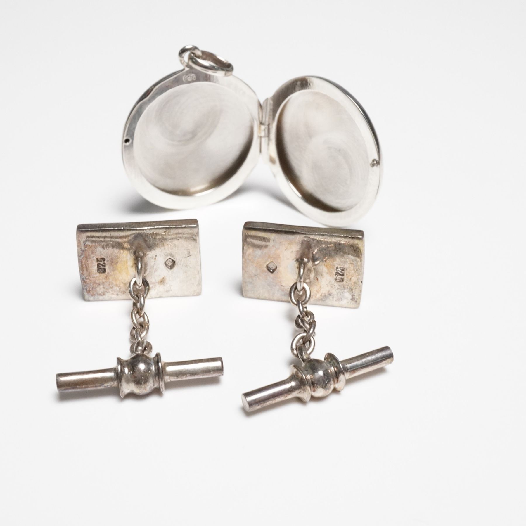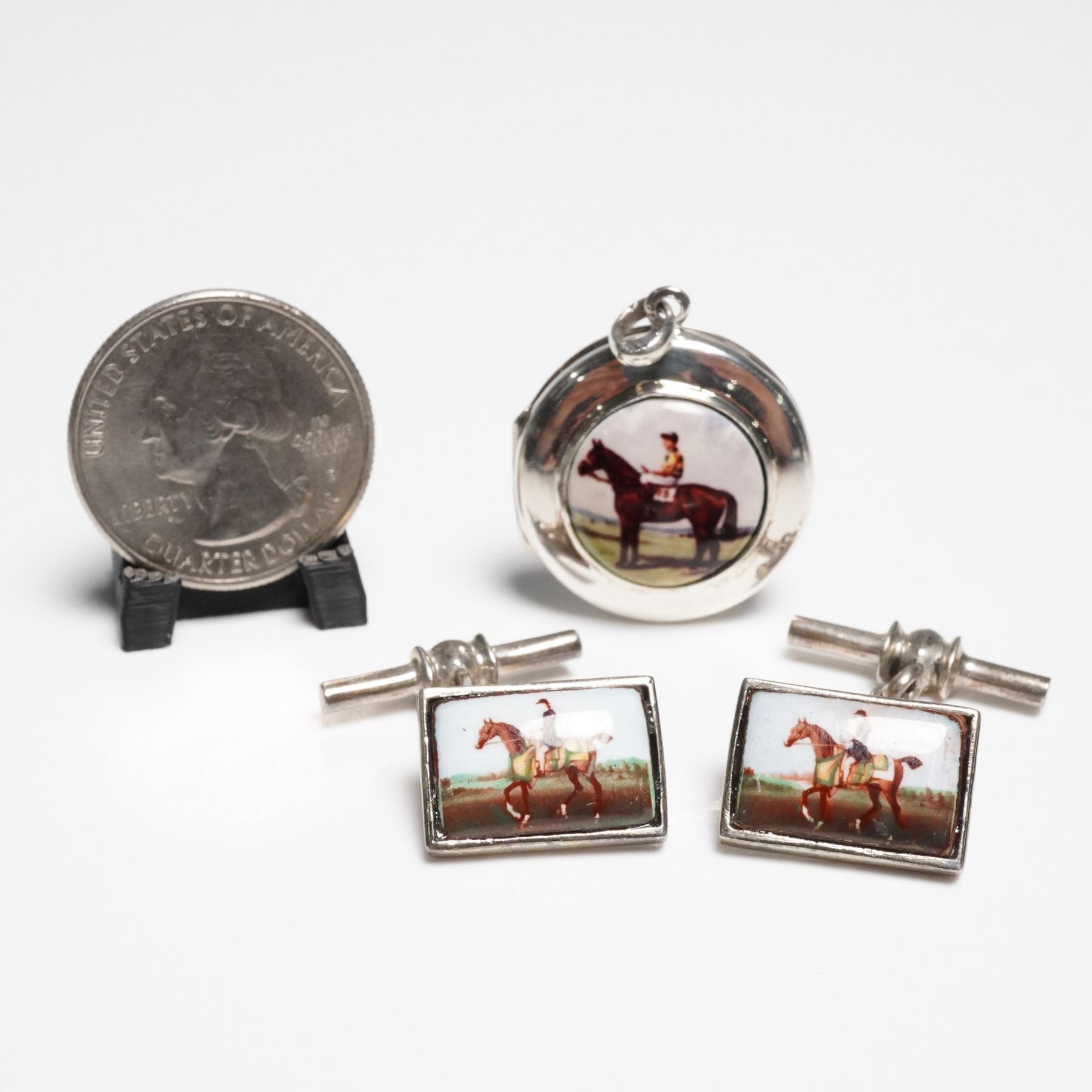 A charming collection of sterling silver and enamel jewelry featuring a pair of cufflinks and a matching locket, each beautifully decorated with detailed equestrian-themed enamel imagery. The cufflinks display vibrant enamel scenes of jockeys and horses, marked 925, and feature traditional toggle closures. Complementing the cufflinks is an elegant round locket, also marked 925, adorned with a detailed equestrian scene, measuring 1"H. The combined total weight of the three pieces, including enamel decoration, is 18 grams. Perfect accessories for lovers of equestrian art or unique jewelry pieces.