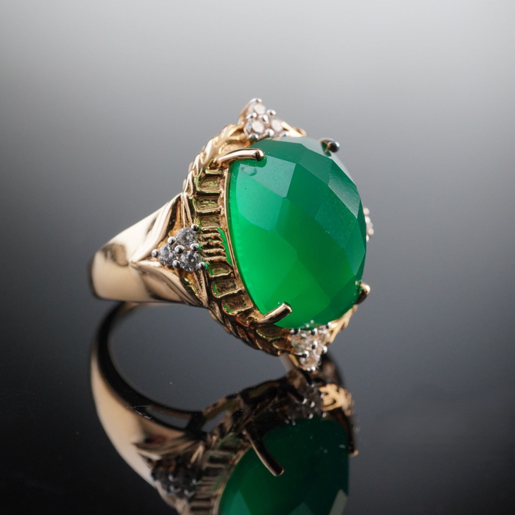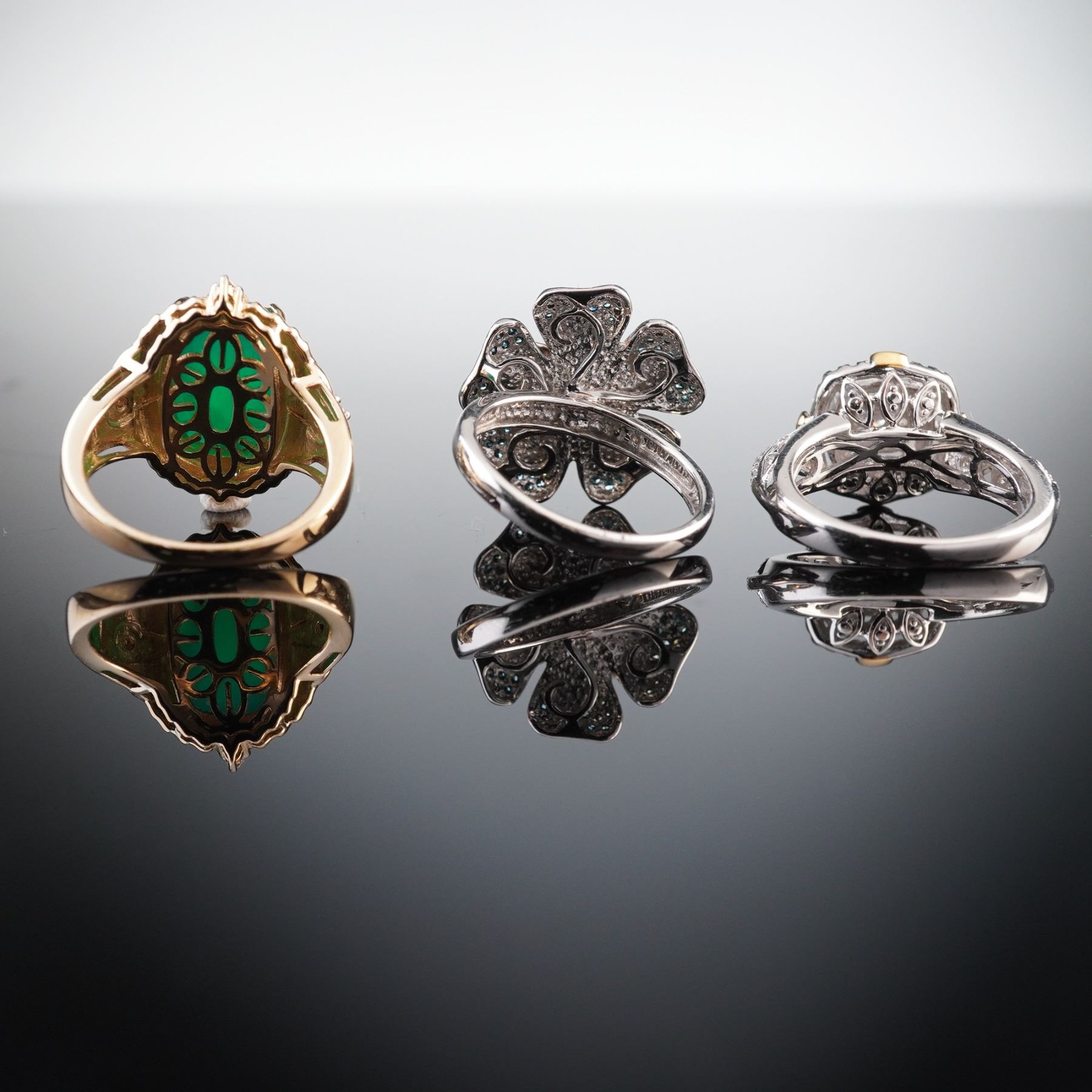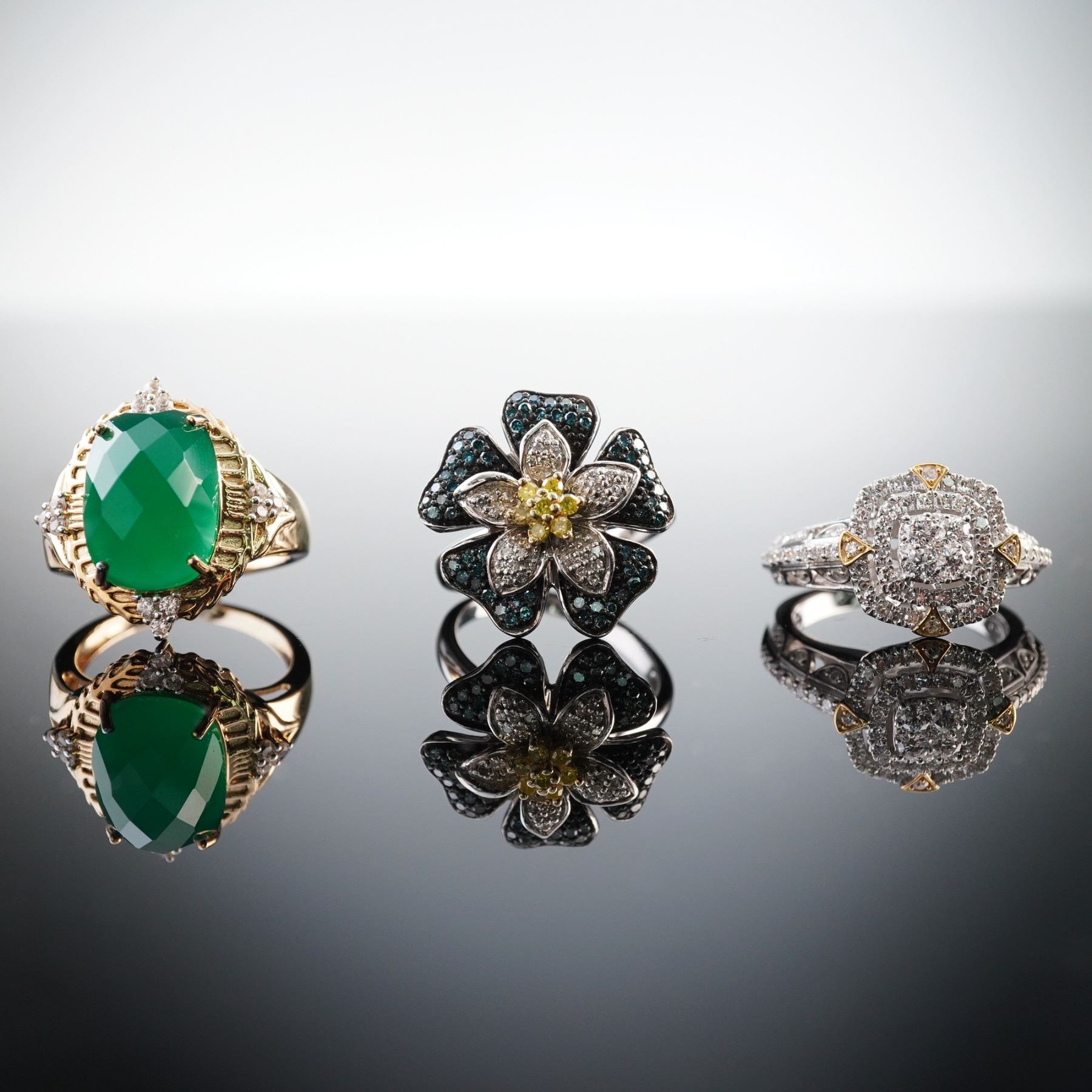 This elegant 3pc ring set features two Sterling silver rings with a gold-tone finish and one Sterling silver ring with a polished silver look. The first ring showcases a striking green stone at the center, the second features a detailed flower design adorned with clear stones (marked Thailand), and the third is a sleek, classic band with clear stones and gold accents. Each marked 925, total weight with stones 15.7 g.