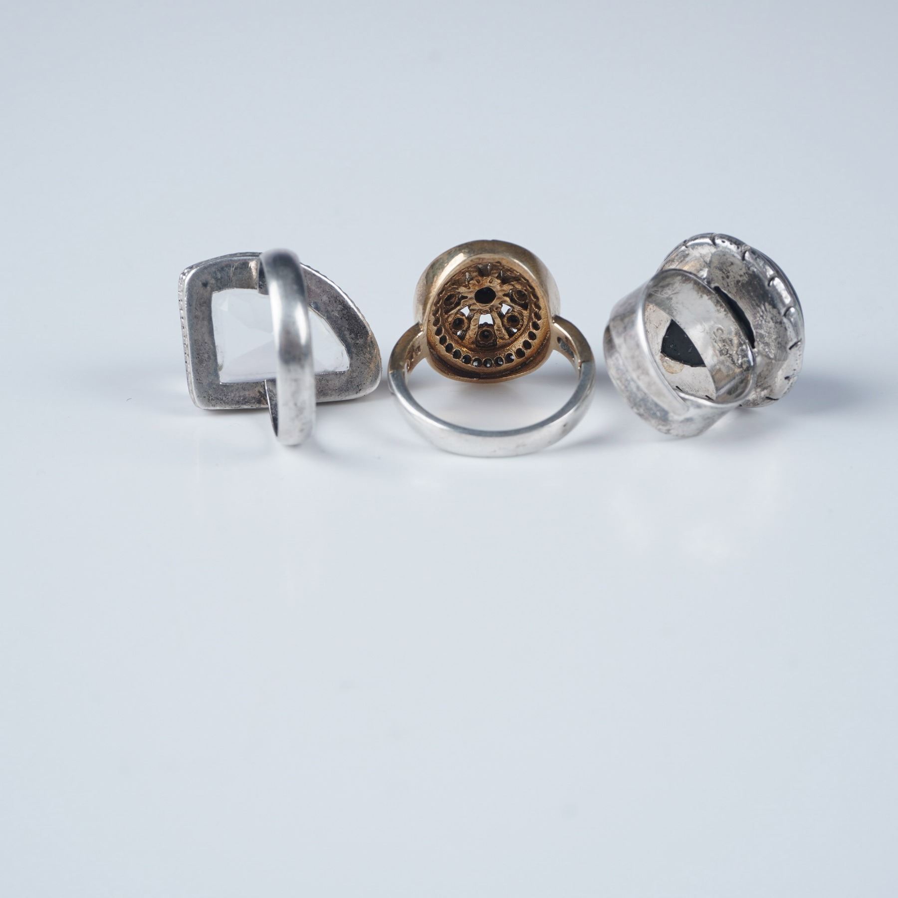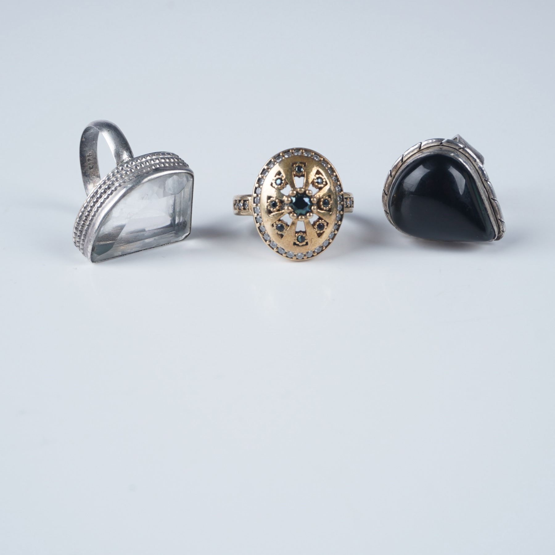 This lot includes three sterling silver rings, all marked 925, featuring unique designs and various sizes ranging from 7 to 8, including one adjustable band. The first ring showcases a teardrop-shaped black onyx stone set in sterling silver. The second features a faceted clear stone, offering a striking geometric design. The third ring is a gold-tone sterling silver piece adorned with small multi-stones, adding a touch of elegance. Perfect for collectors or jewelry enthusiasts.