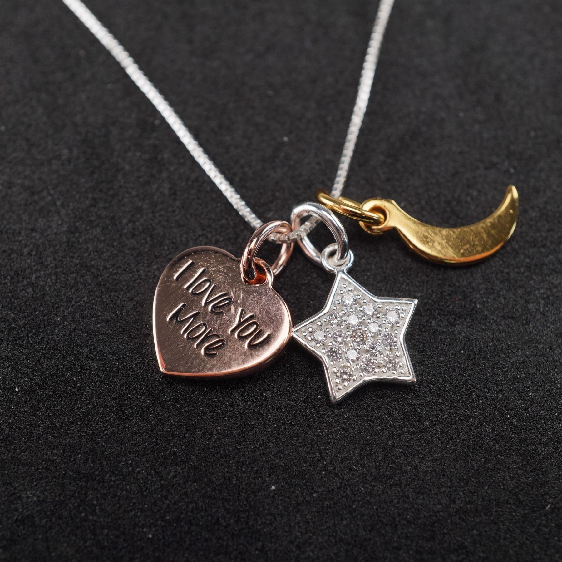 A heartfelt three-piece collection of sterling silver jewelry featuring inspirational and family-themed designs, each accented with Swarovski crystals for added brilliance. The lot includes two necklaces and one charm bracelet. One necklace bears a pendant inscribed "I love you more than the moon and the stars," accented with a gold-tone crescent moon and a star set with clear Swarovski crystals. The second necklace features a round pendant engraved "She believed she could so she did," accompanied by a pave Swarovski crystal wing and a gold-tone heart charm. Completing the group is a daughter-themed charm bracelet adorned with sentimental text, hearts, and floral motifs, all accented with Swarovski crystal details. A touching collection celebrating love, encouragement, and family bonds. Total combined weight: 24g.