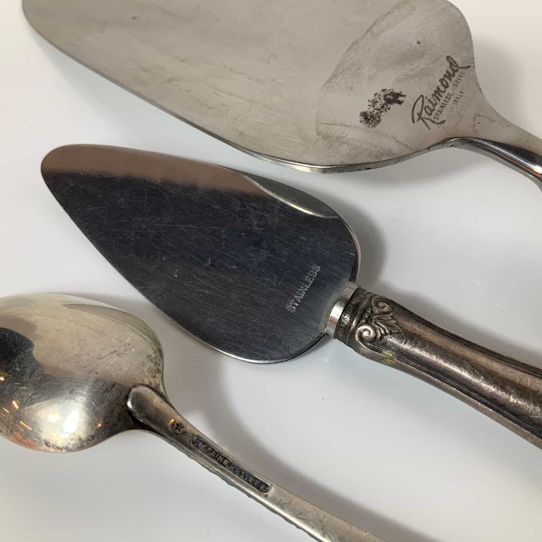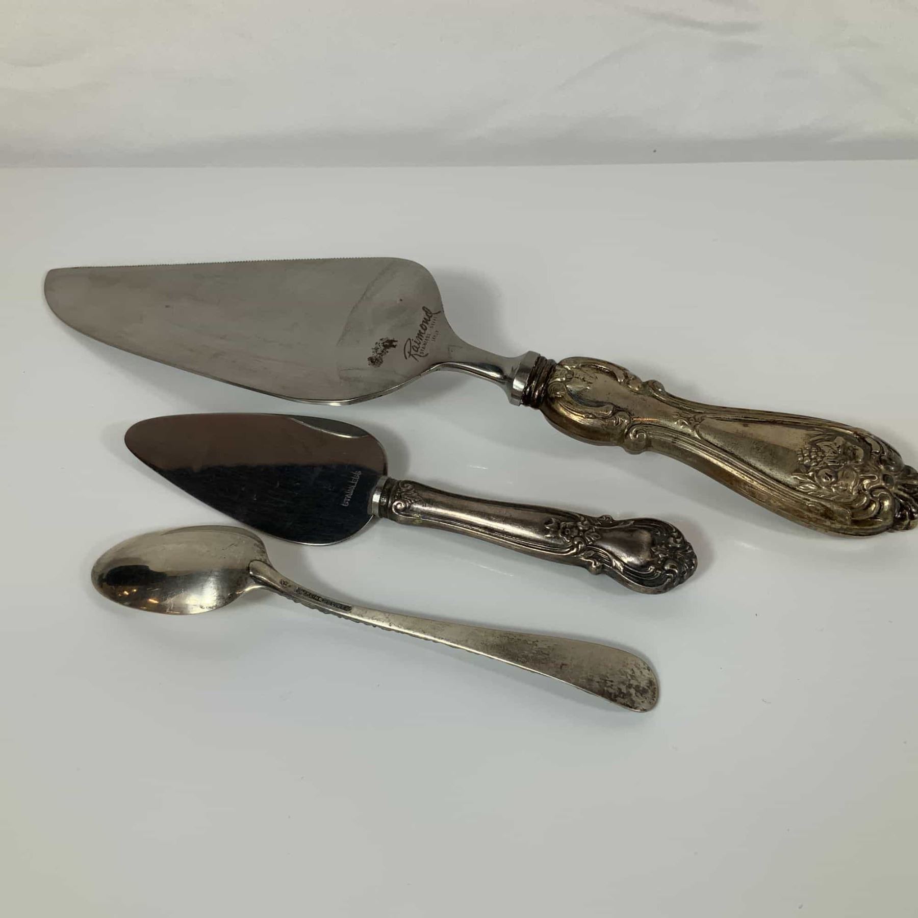 This trio of serving pieces includes items by Web, Kirk Stieff, and Raimond Italy. The collection features a sterling silver handle cheese server by Web, which displays a scrolled foliate design in the Rococo style. The collar of this server is stamped Web Sterling Handle and the blade is marked Stainless. Also included is a solid sterling silver spoon by Kirk Stieff, characterized by a dense, multi-motif floral design covering the handle. The reverse of the spoon is stamped Sterling Stieff. The third piece is a large Raimond Italy cake server with a stainless steel blade and an ornate sterling silver handle featuring embossed scrollwork and floral motifs. Edge of handle is marked Sterling. The blade is marked Raimond, R Stainless Steel, Italy, and includes a grape cluster symbol.