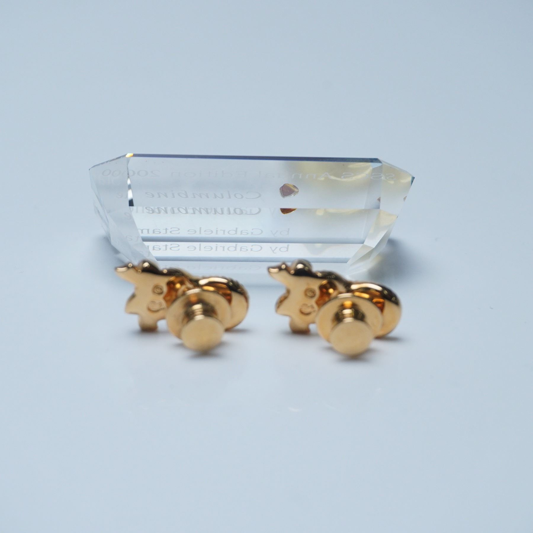 Elegant Swarovski 3pc grouping featuring a Columbine plaque and two intricately designed mask pins. The Columbine plaque, part of the SCS Annual Edition 2000, is a faceted crystal display piece with an attached yellow crystal masquerade mask and engraved details. Accompanying the plaque are two gold-tone mask pins adorned with red and clear crystals, each featuring an ornate ribbon accent. The largest piece, the Columbine plaque, measures 2.25"L x 1"H. A dazzling collection perfect for Swarovski enthusiasts and collectors of theatrical-themed designs. Plaque with original box.