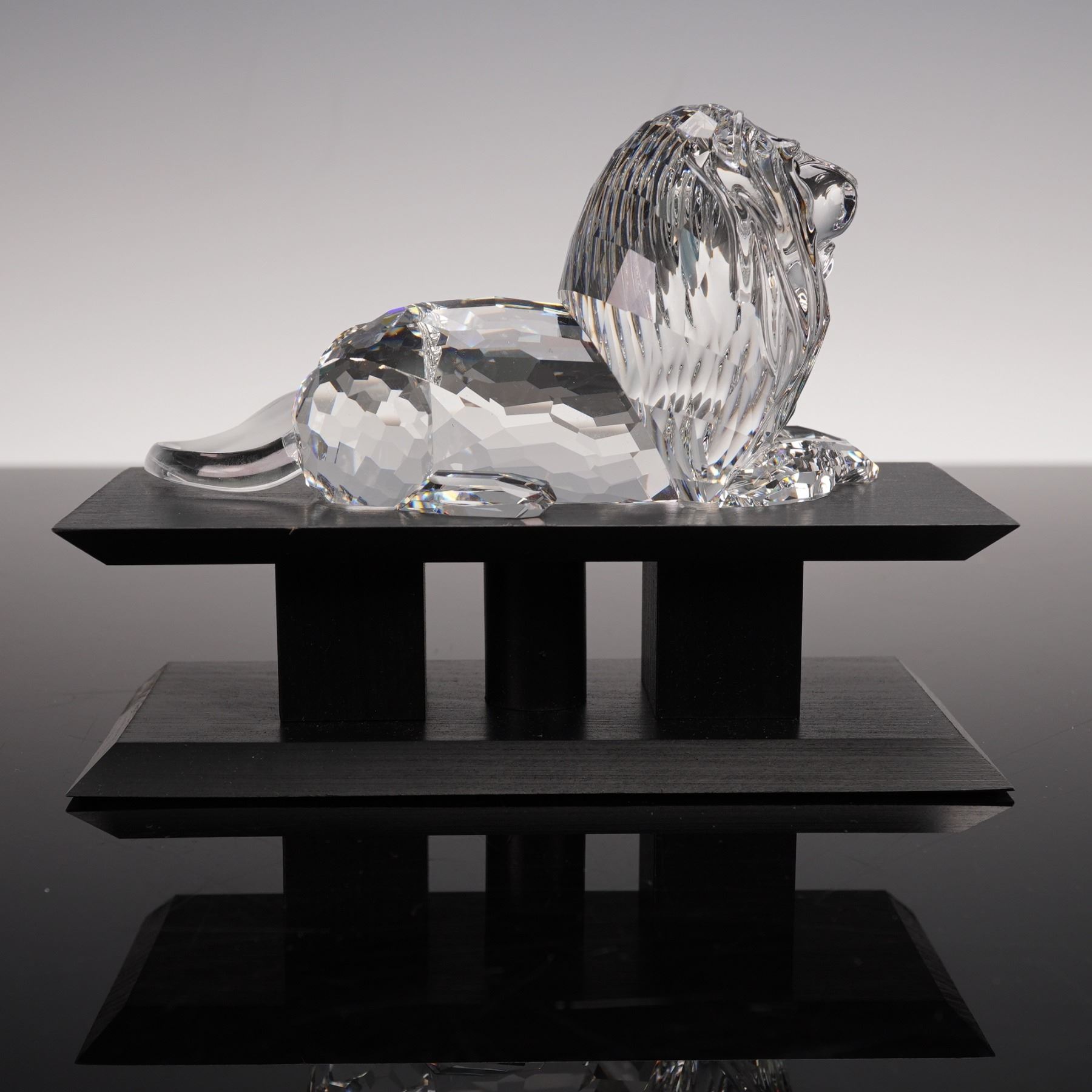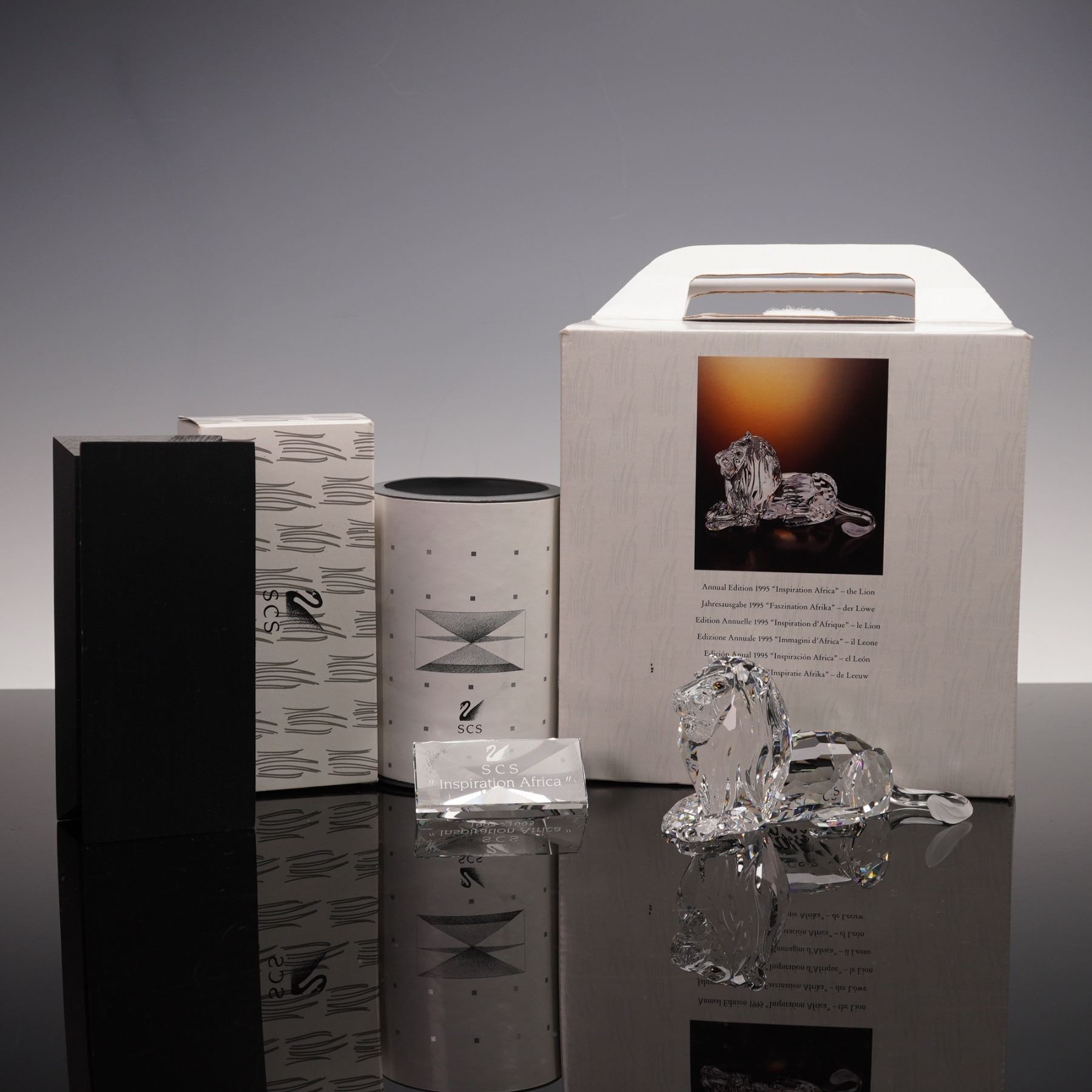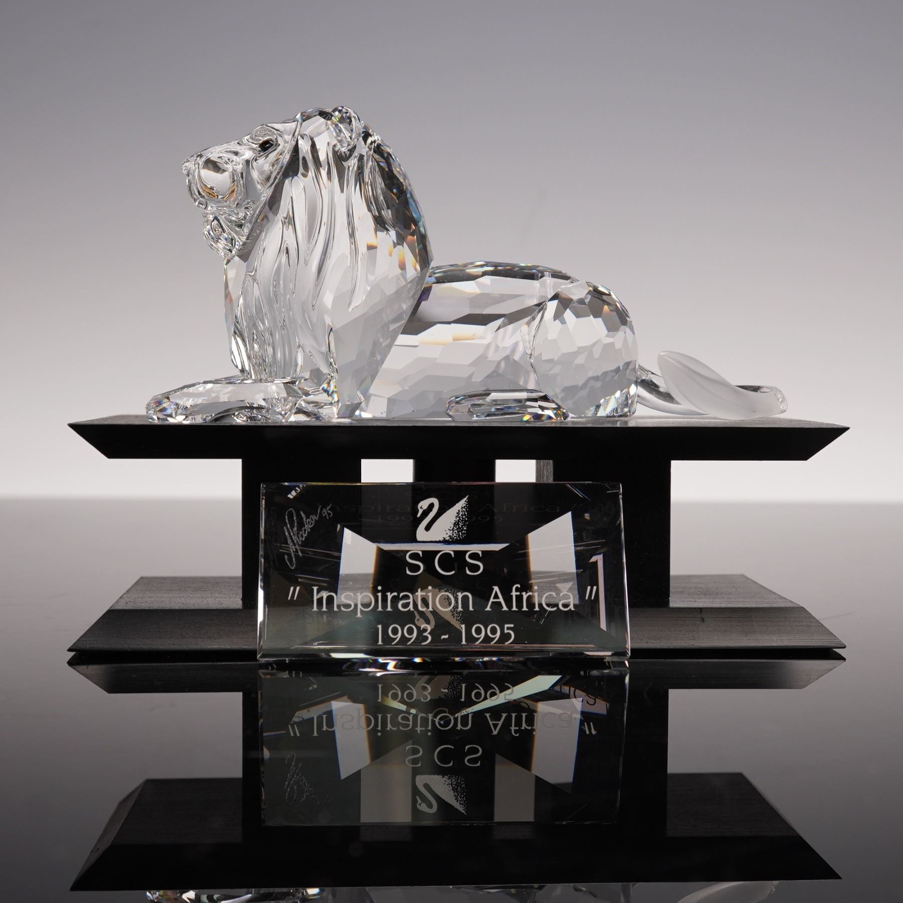 Elegant Swarovski Crystal Society (SCS) 1995 Annual Edition figurine, titled Lion, designed by Adi Stocker as part of the Inspiration Africa trilogy (1993-1995). Expertly faceted from clear crystal with a frosted tail tip and mane details, the lion embodies regal strength and precision craftsmanship. The underside is engraved with the Swarovski swan logo, SCS. Designer signature "AStocker 1995" on plaque. This lot includes the original SCS presentation box, display base, and etched crystal plaque reading SCS Inspiration Africa 1993-1995. The complete three-piece ensemble is presented in excellent display-ready condition and exemplifies Swarovski's artistry during the mid 1990s collector era. 185410.